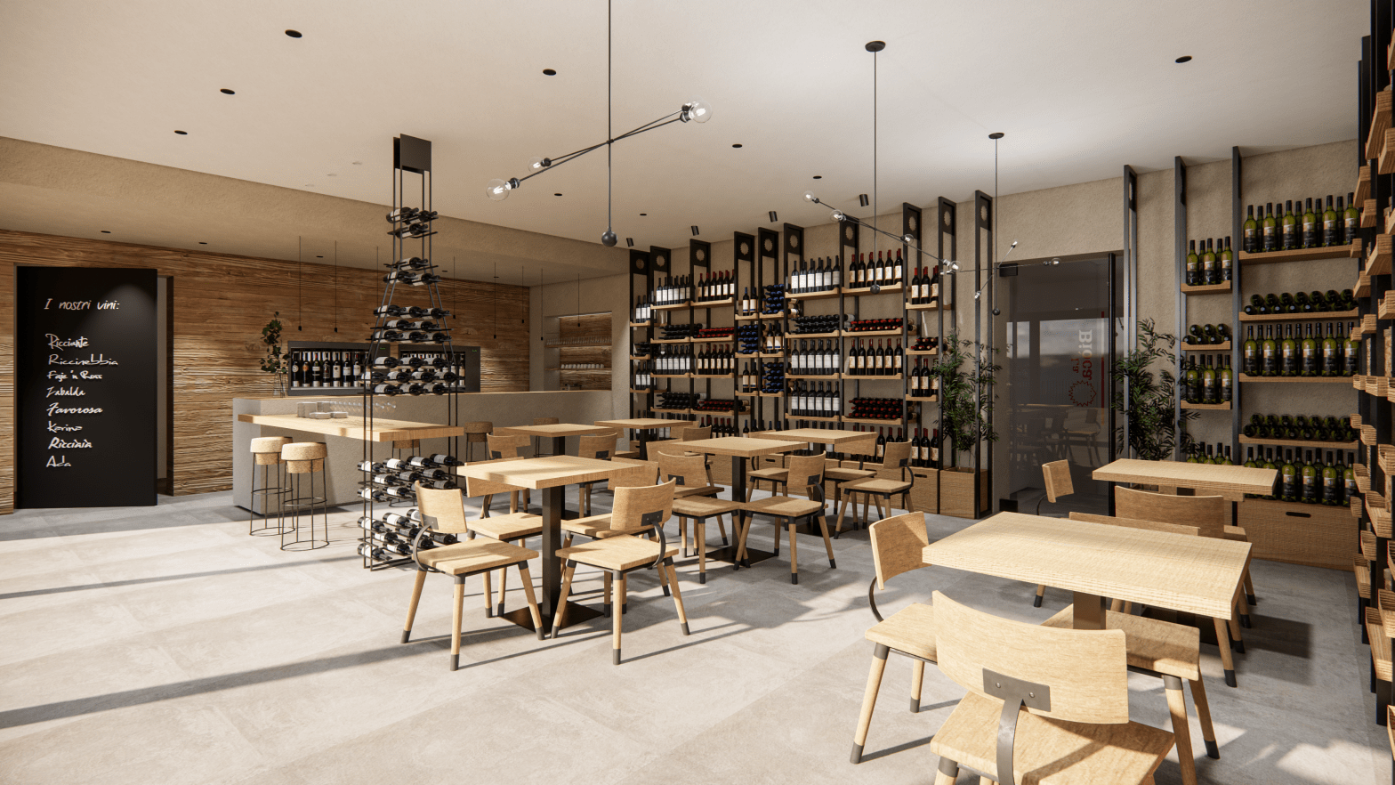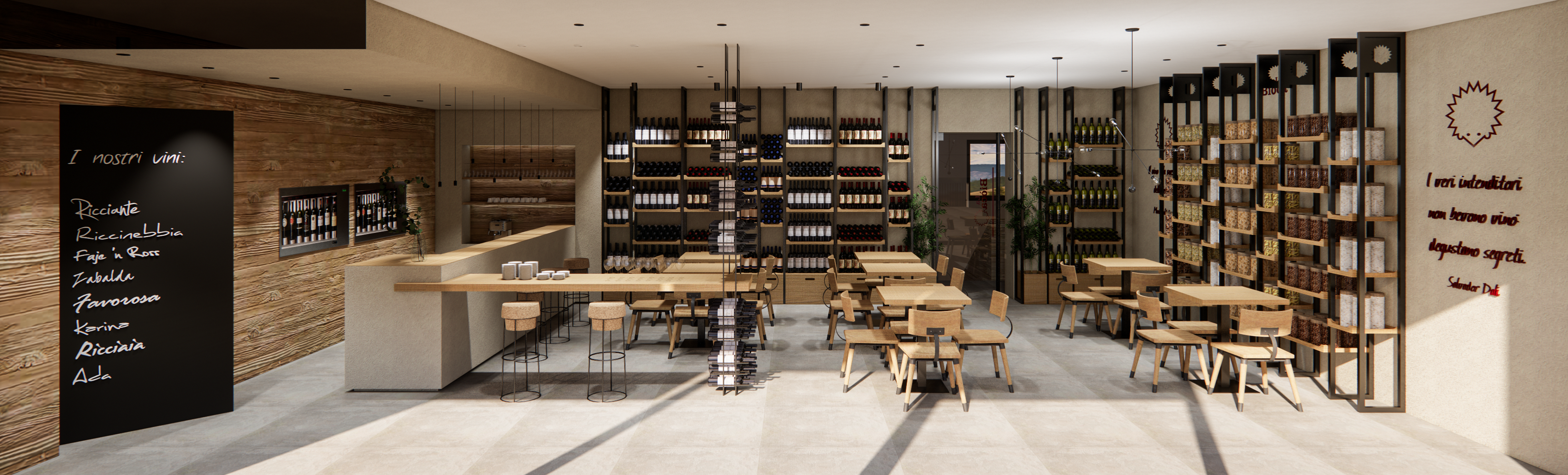 Legno di Rovere, tipico dell’area e metallo definiscono l’ambiente. Alte scaffalature rivestono le pareti della zona tavoli, fungendo sia da spazio espositivo che di stoccaggio.