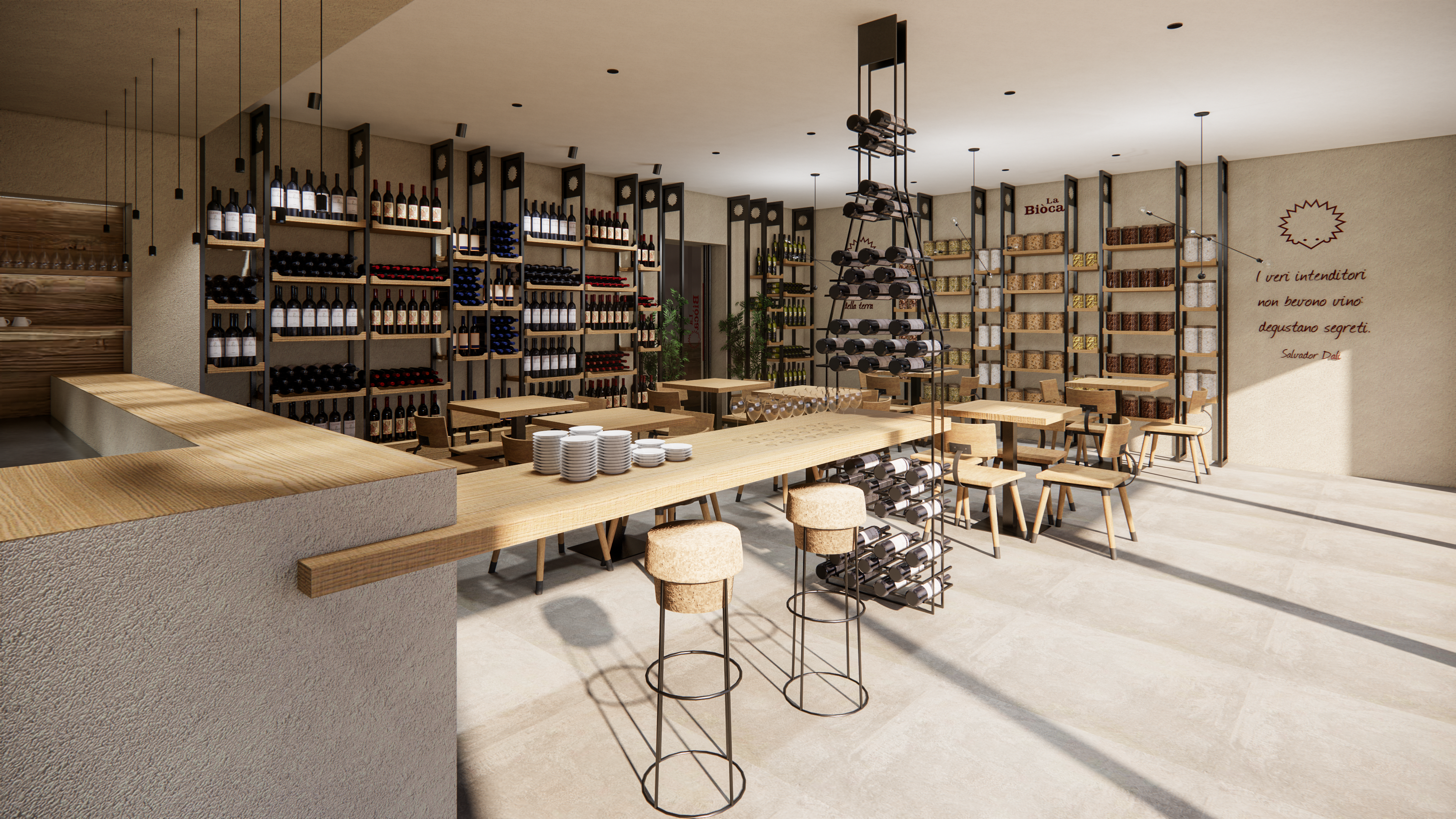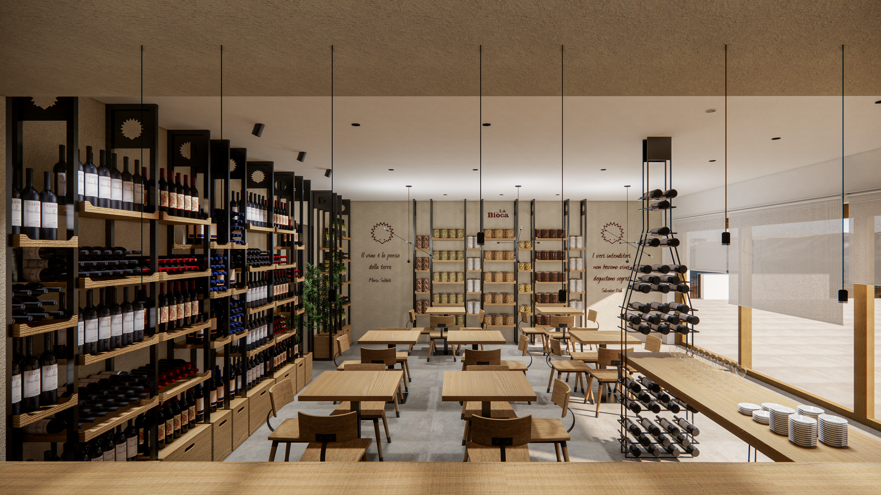 Una grande apertura, sulle Langhe di Serralunga d’Alba, caratterizza la sala degustazione di vini e prodotti dell’azienda La Biòca. Usata anche come area colazioni dell’annesso agriturismo, è uno spazio versatile che ben si presta ai diversi utilizzi durante tutto l’arco della giornata.