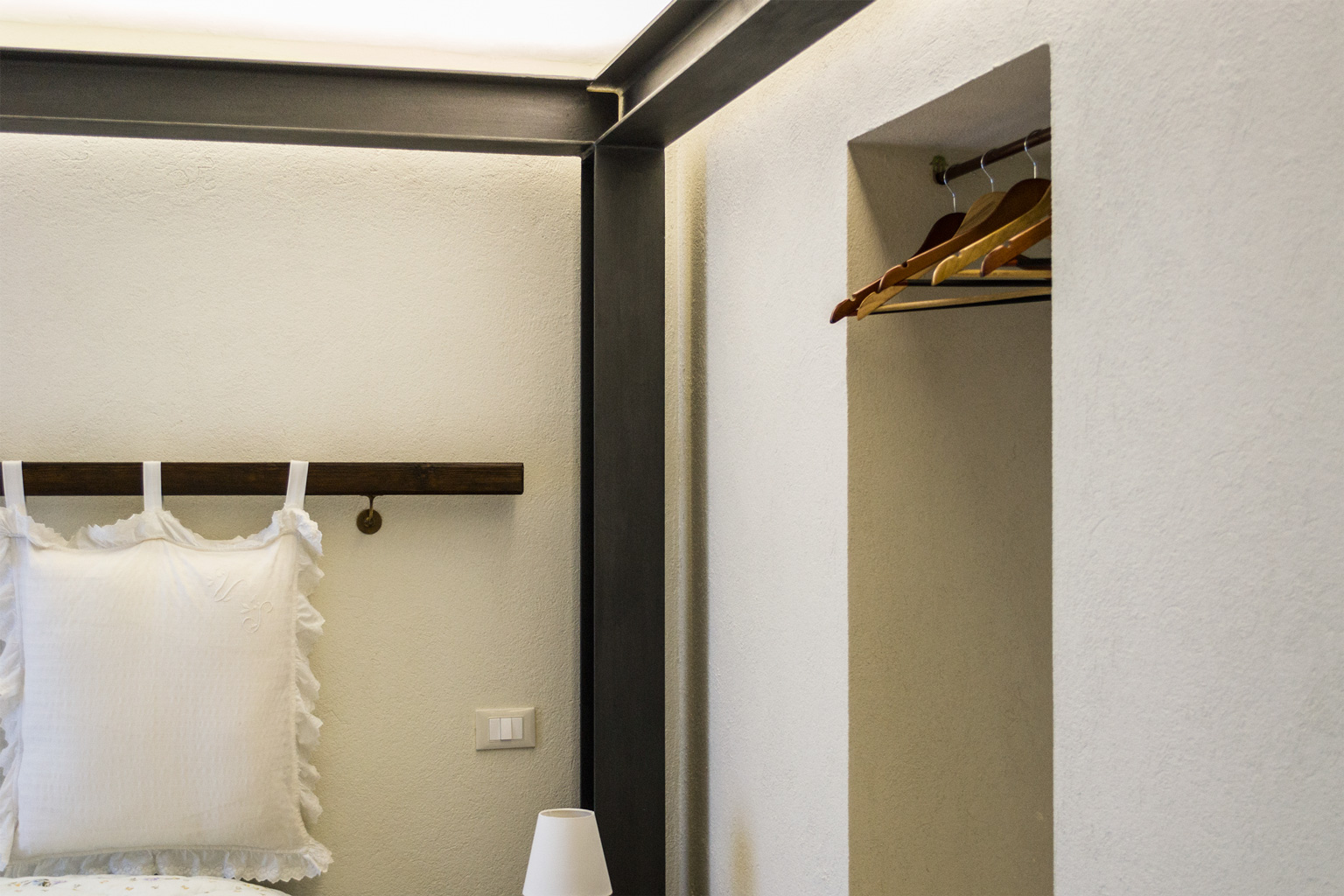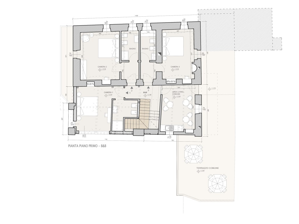 L’intervento di ristrutturazione ha permesso di ampliare il fabbricato destinando così l’intero piano primo all’attività di Bed&Breakfast: tre camere doppie con bagno privato e area living comune, connessa ad un ampio terrazzo esterno al medesimo livello e ai relativi locali ad uso accessorio del piano terra.
