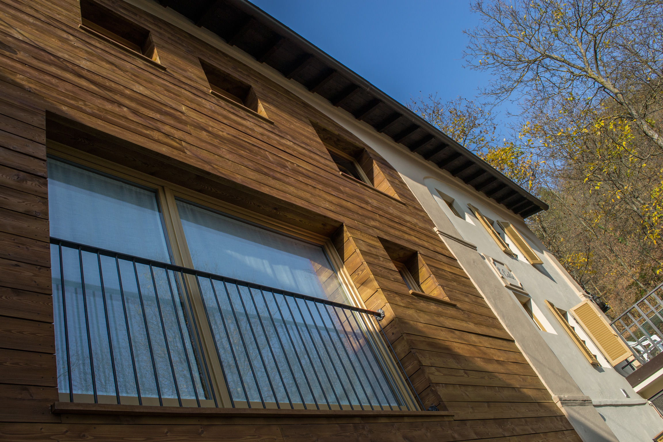 Una grande vetrata caratterizza il primo piano attraverso la quale, da una delle camere, ci si affaccia direttamente sul giardino principale. Le altre aperture invece di forma quadrata e modulare denotano chiaramente la diversa epoca di realizzazione rispetto alla facciata esistente a lato, pur mantenendo una composizione proporzionata e rigorosa.