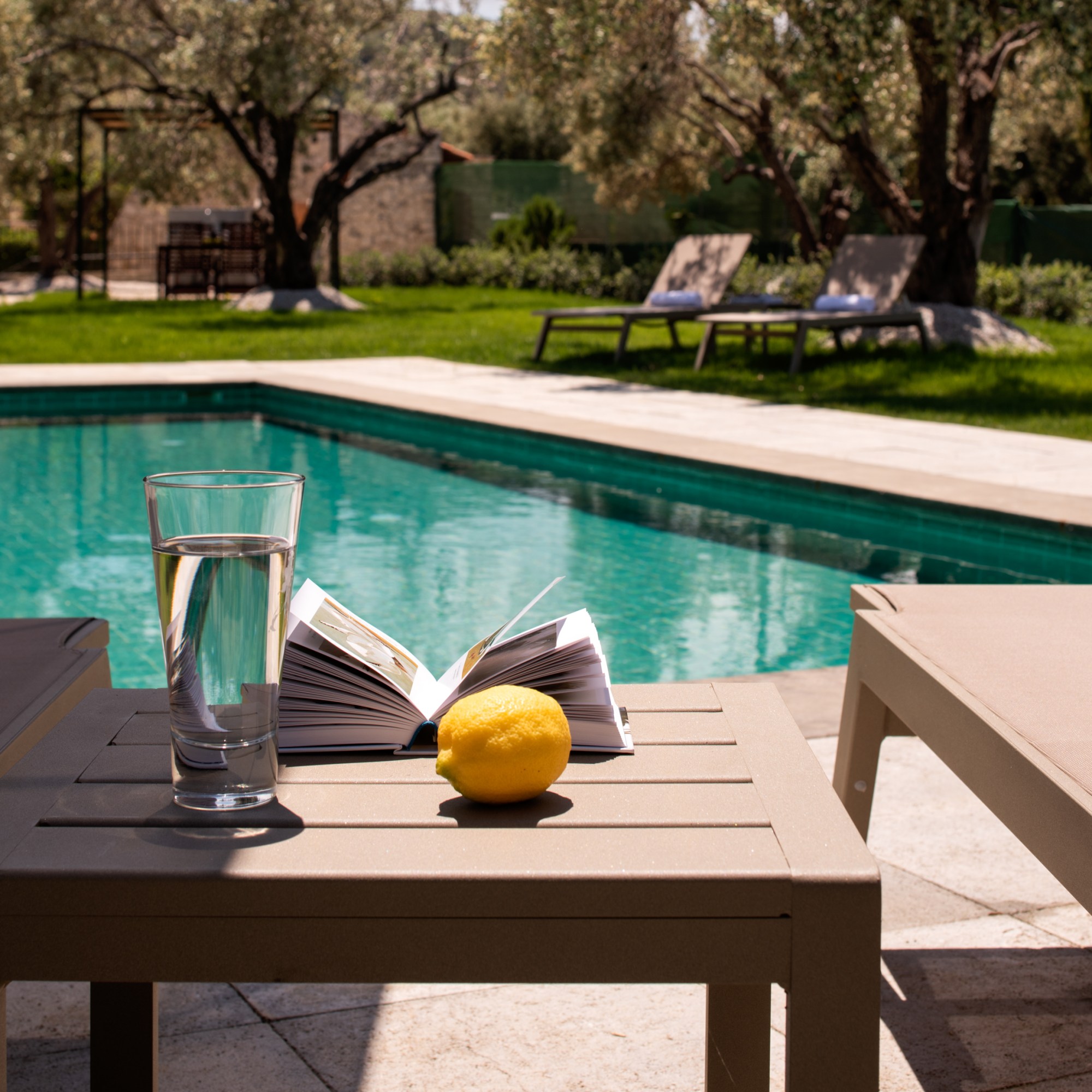 Nel giardino di pertinenza, tra gli ulivi, con vista sul mare, uno specchio d’acqua dal colore verde allieta il soggiorno degli ospiti.