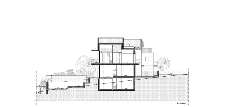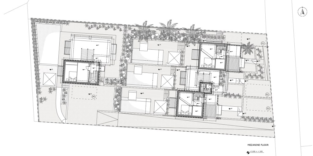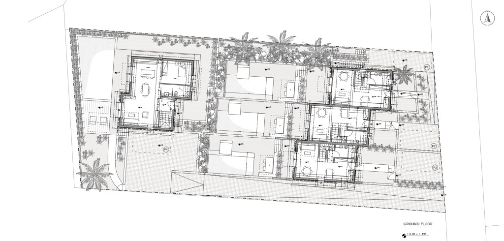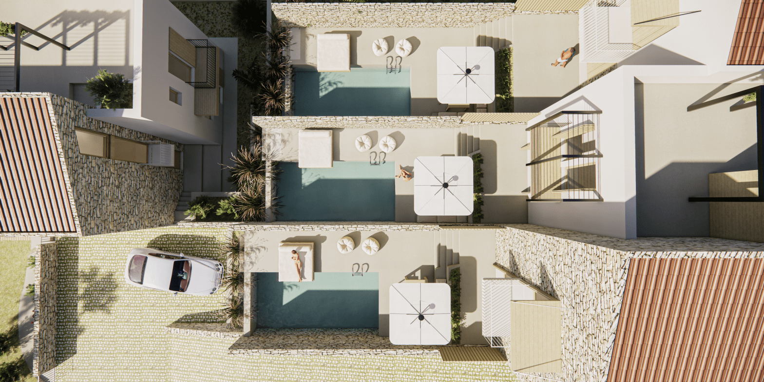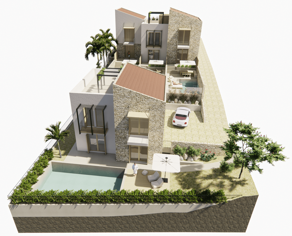The entire complex will be surrounded by green areas with bigger plants on the Northside to create a private oasis protected by the neighbours. On the southern border is going to be a private street to permit access to the lower villa. As well a parking area will be placed on the Eastside, along the public street and next to the isolated house.