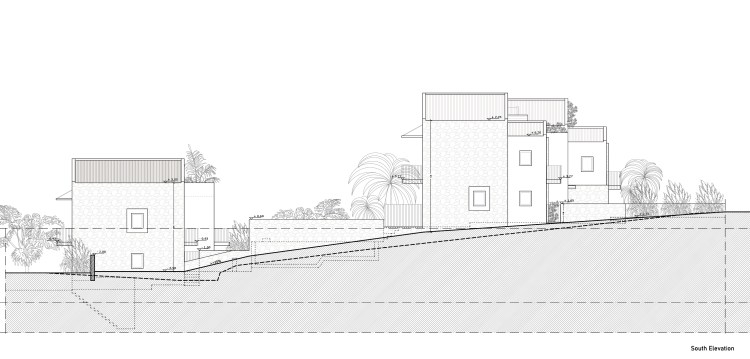 The houses show an articulated elevation towards the public street at East: smaller volumes connected each other, with different levels to look like a traditional agglomerate of houses, while the Westside, more private and overlooking the swimming pool, is characterized by simpler and linear shapes, with bigger openings, however keeping a vertical ratio.