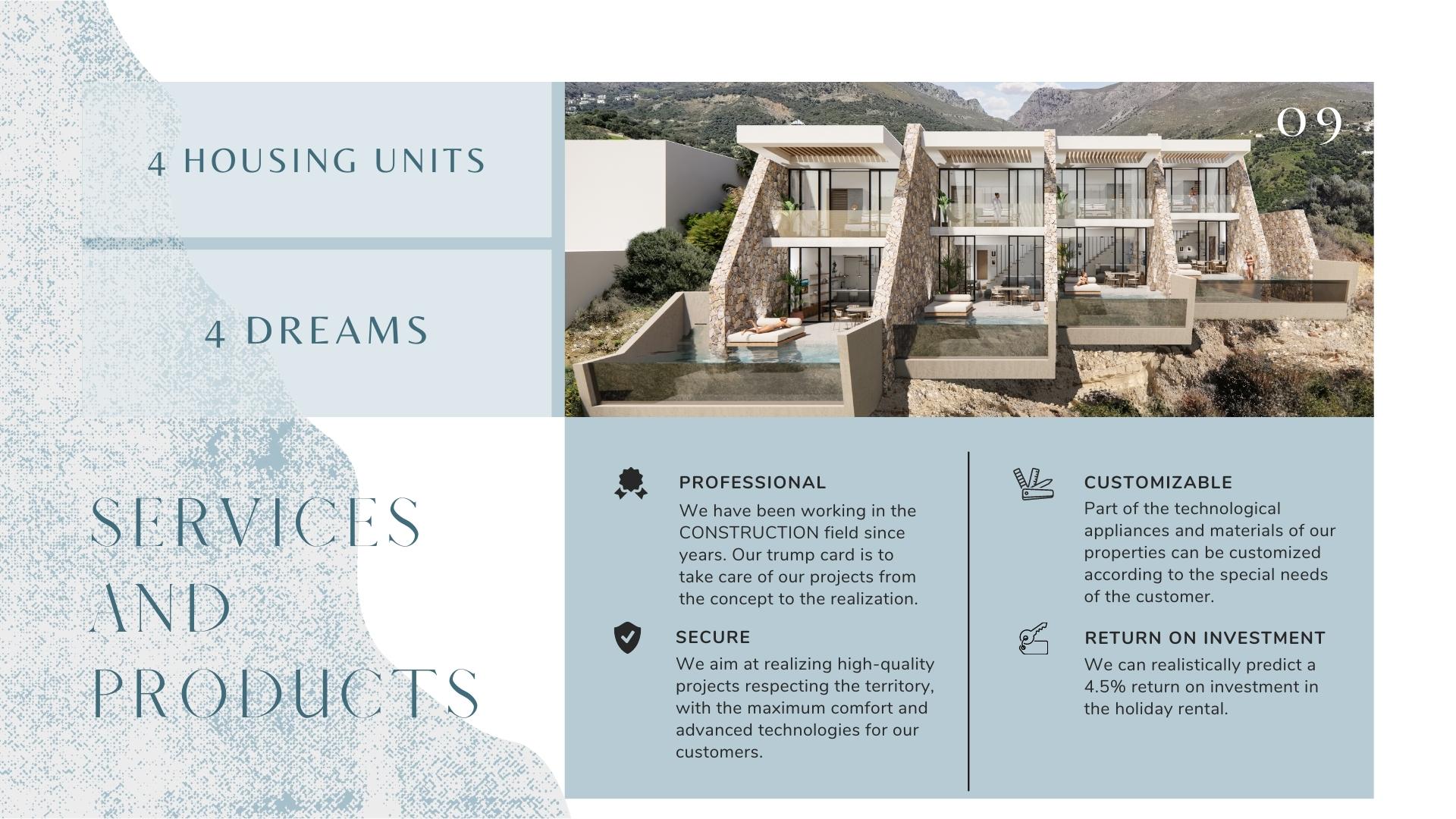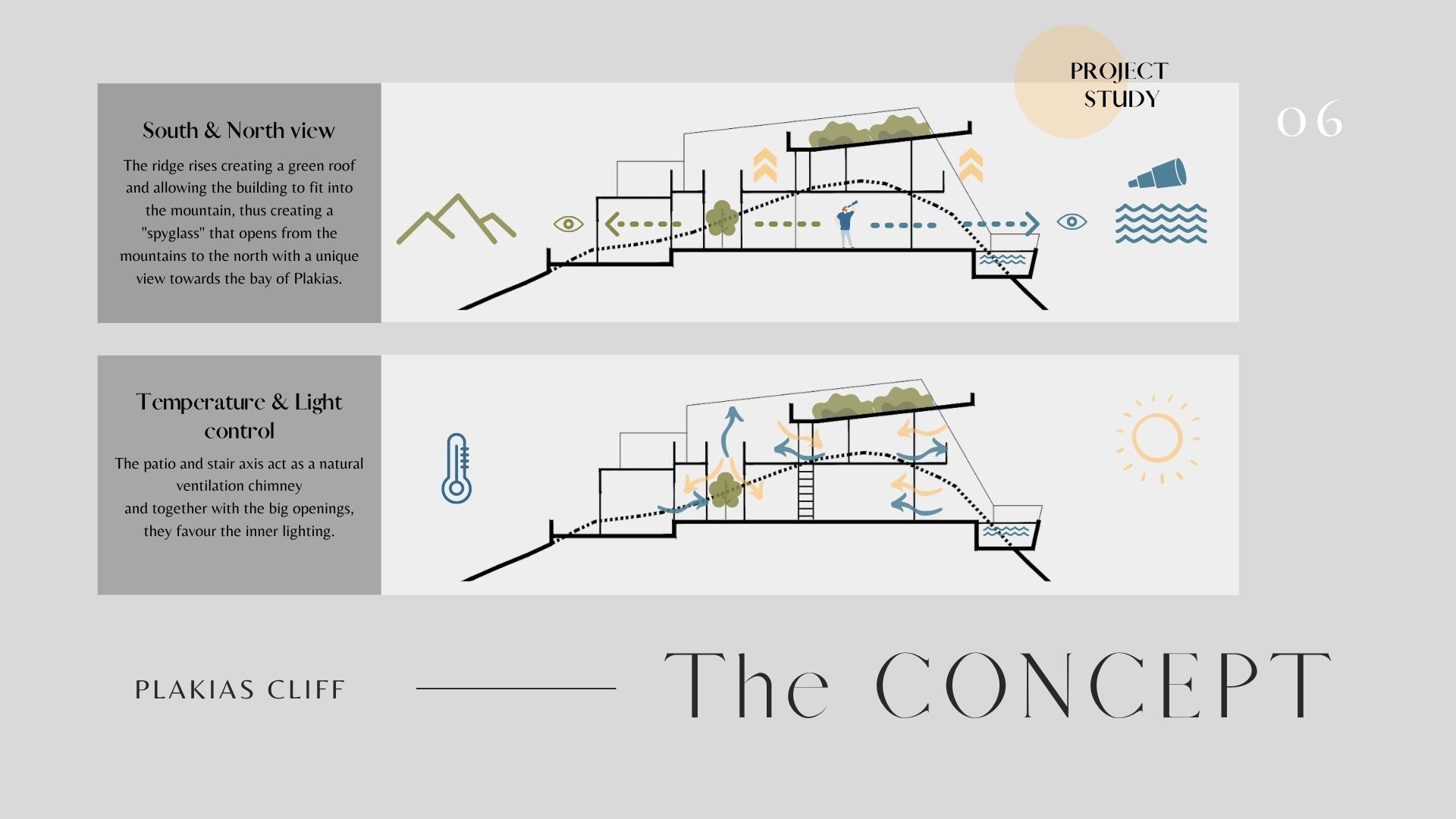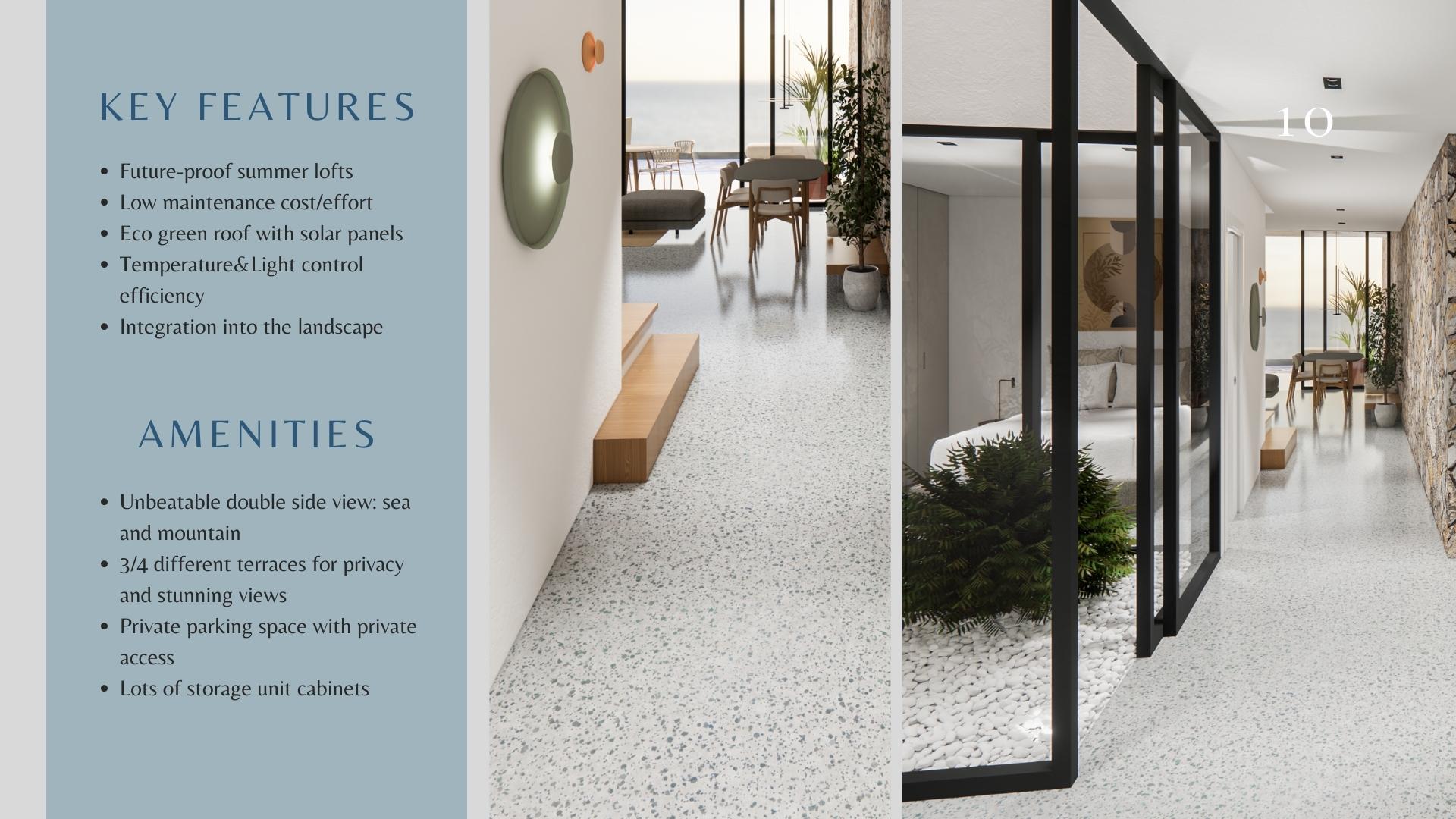 The 4 properties are accessible via a new road located north of the lot. All equipped with a private parking space, they are inserted into the hill like spy glass facing the sea.