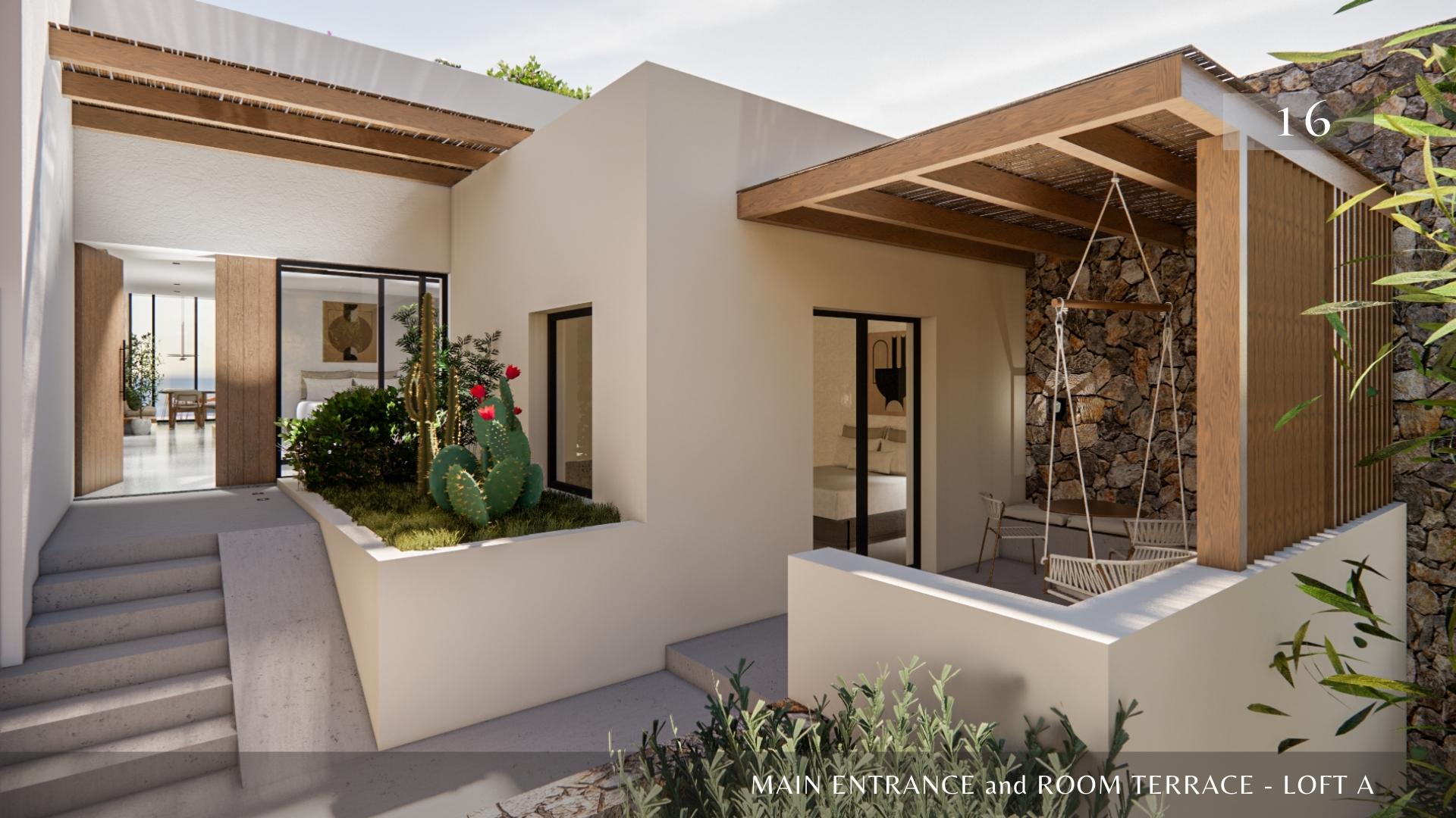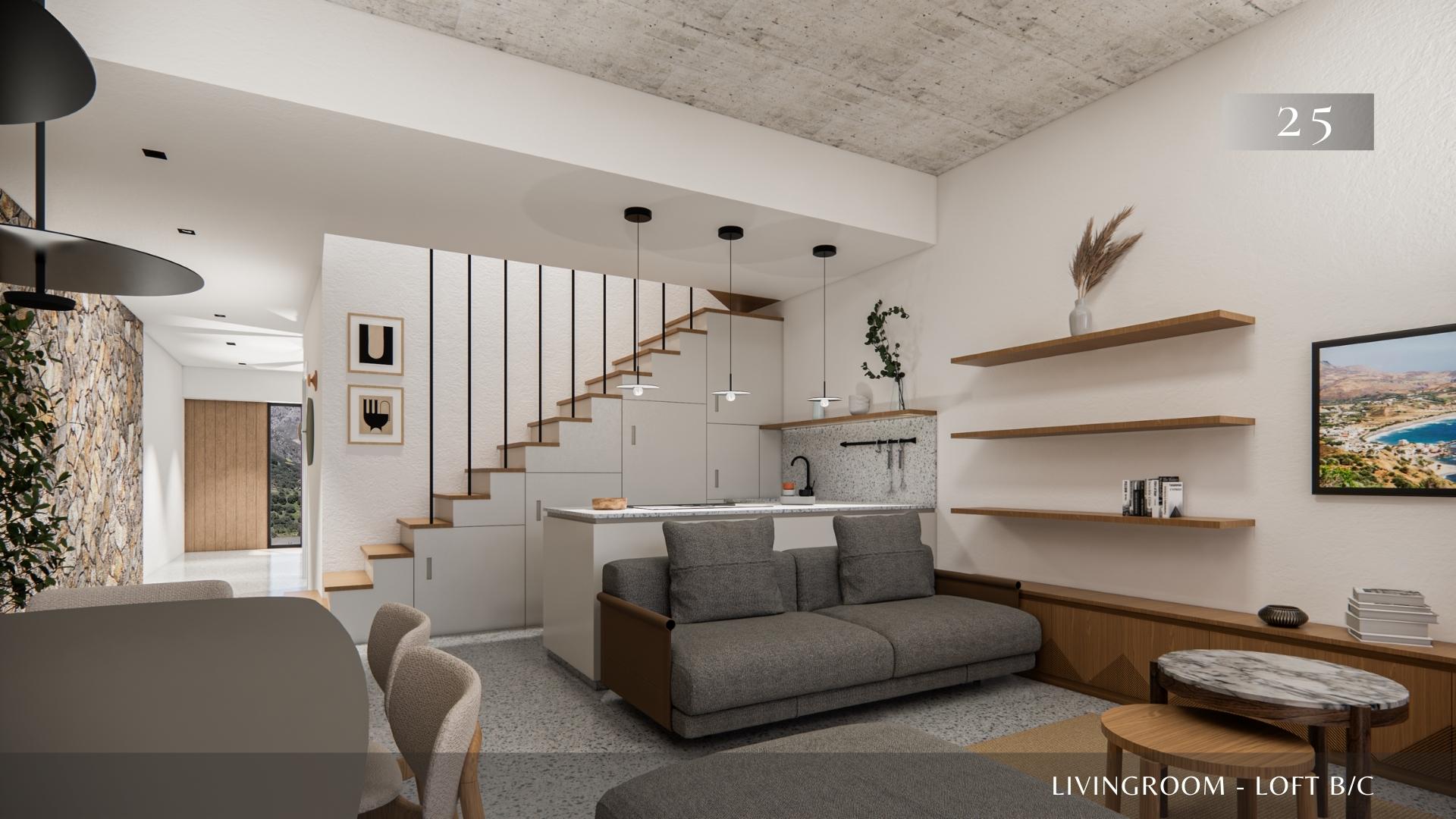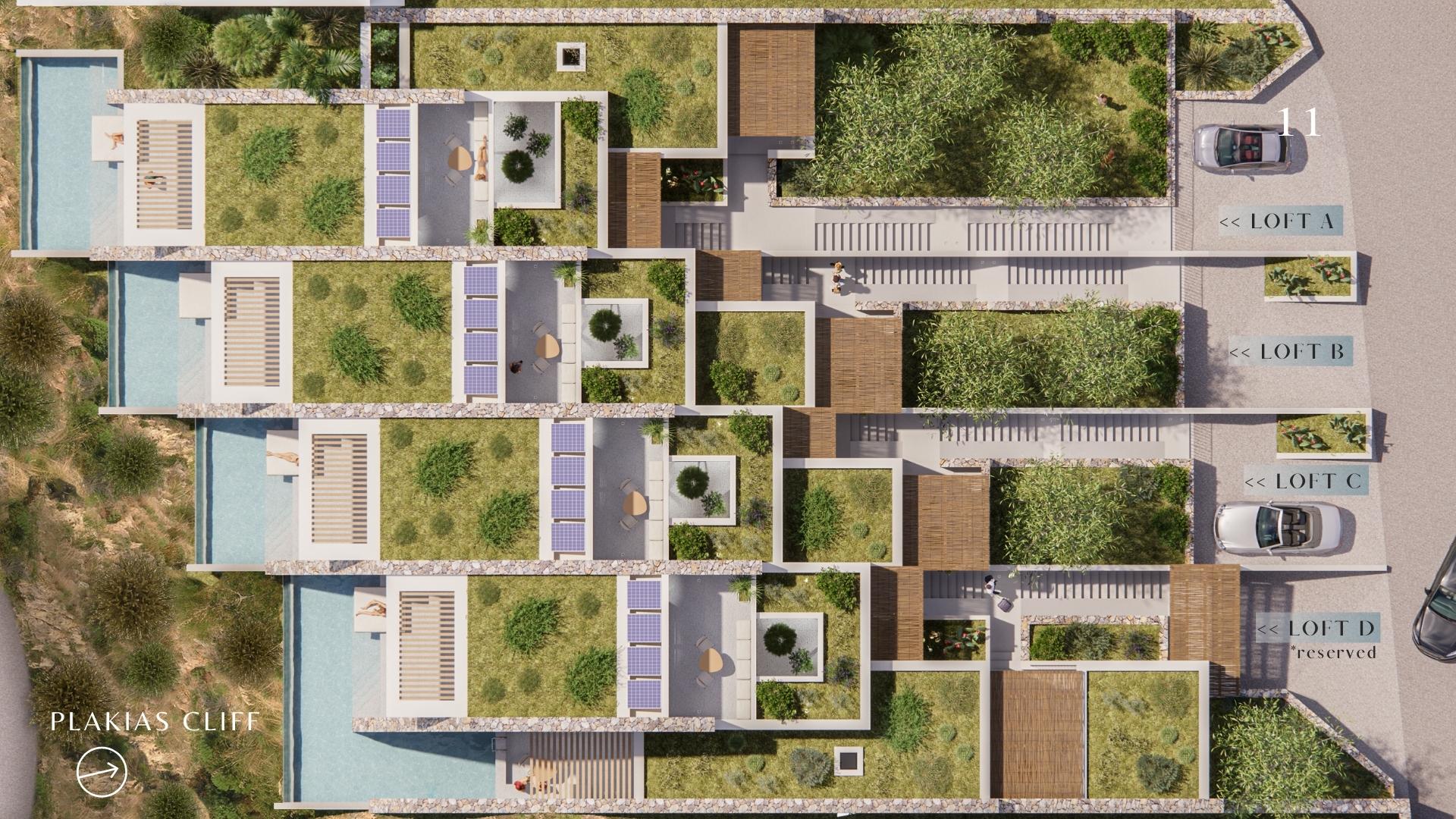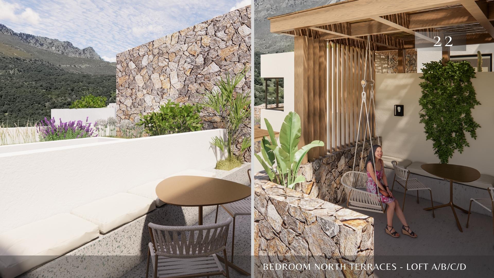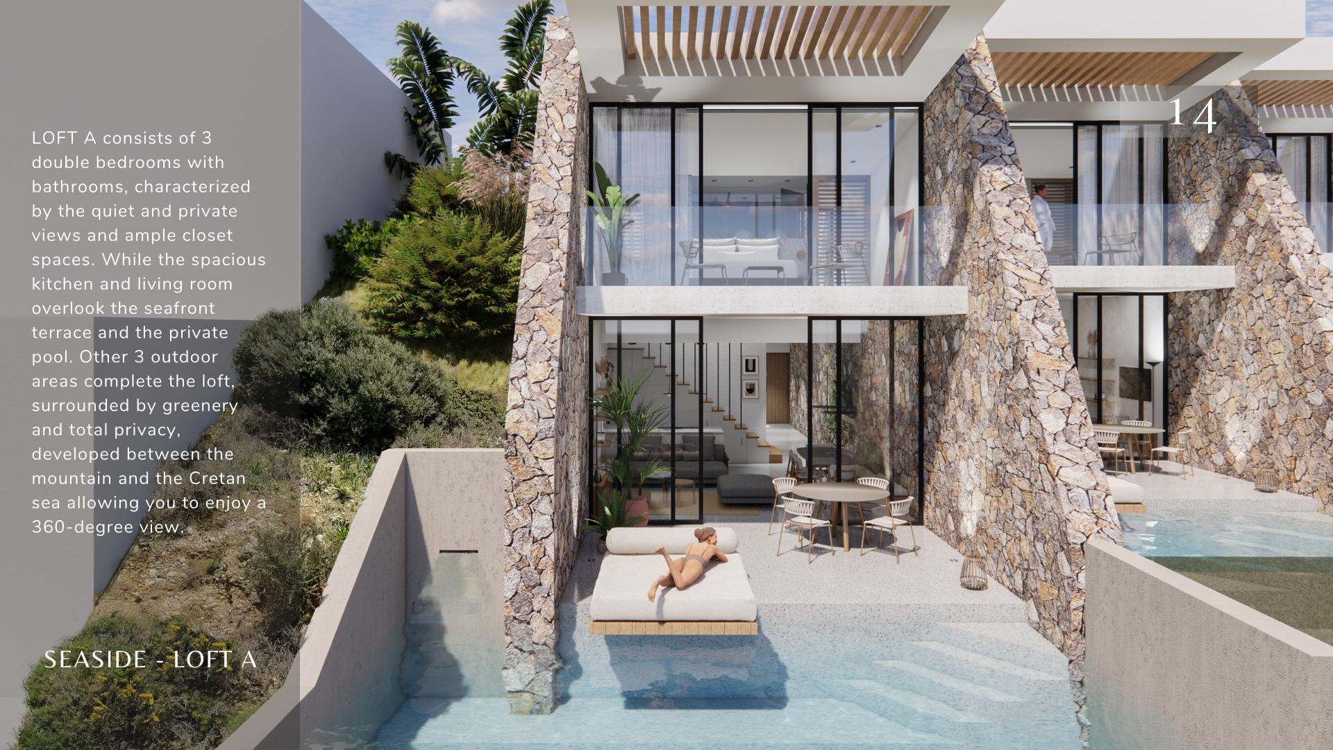 LOFT A consists of 3 double bedrooms with bathrooms, characterized by the quiet and private views and ample closet spaces. While the spacious kitchen and living room overlook the seafront terrace and the private pool. Other 3 outdoor areas complete the loft, surrounded by greenery and total privacy, developed between the mountain and the Cretan sea allowing you to enjoy a 360-degree view.