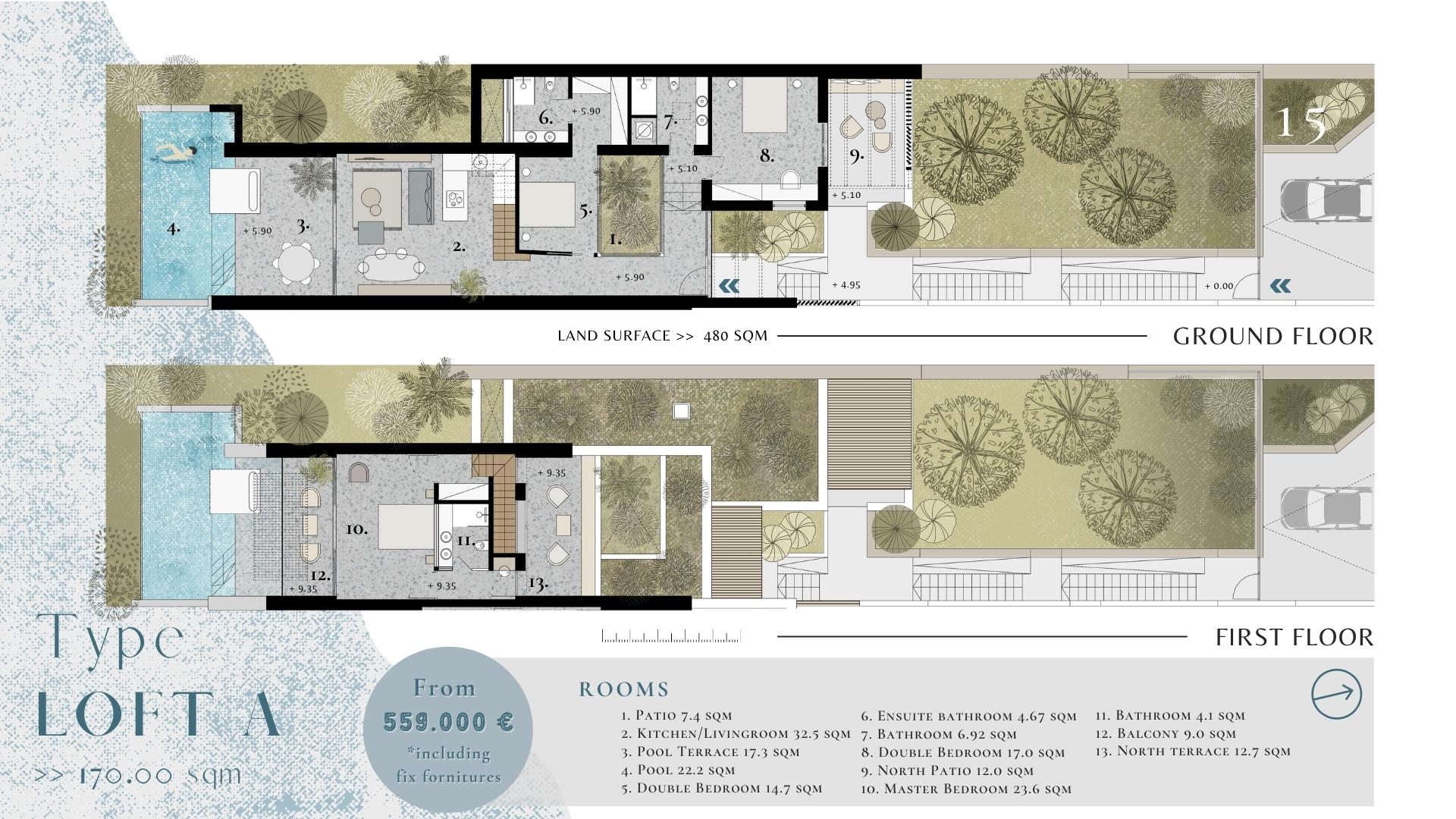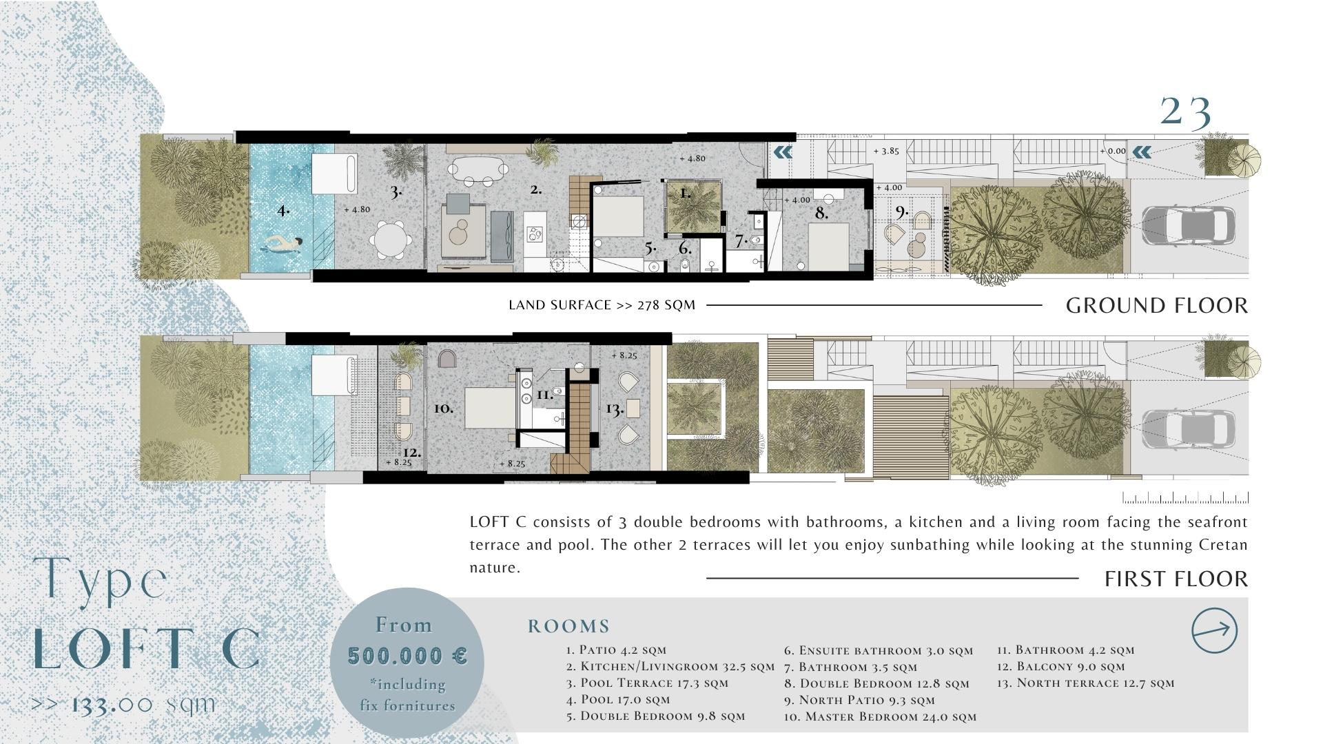 LOFT A è composto da 3 camere matrimoniali con bagno, caratterizzate da affacci silenziosi e riservati e da ampie armadiature. Mentre la spaziosa cucina – soggiorno si affacciano sulla terrazza fronte mare e sulla piscina privata. Altri 3 spazi esterni completano il loft, immerso nel verde e nella totale privacy, sviluppato tra la montagna e il mare di Creta permettendo di godere di una vista a 360 gradi.