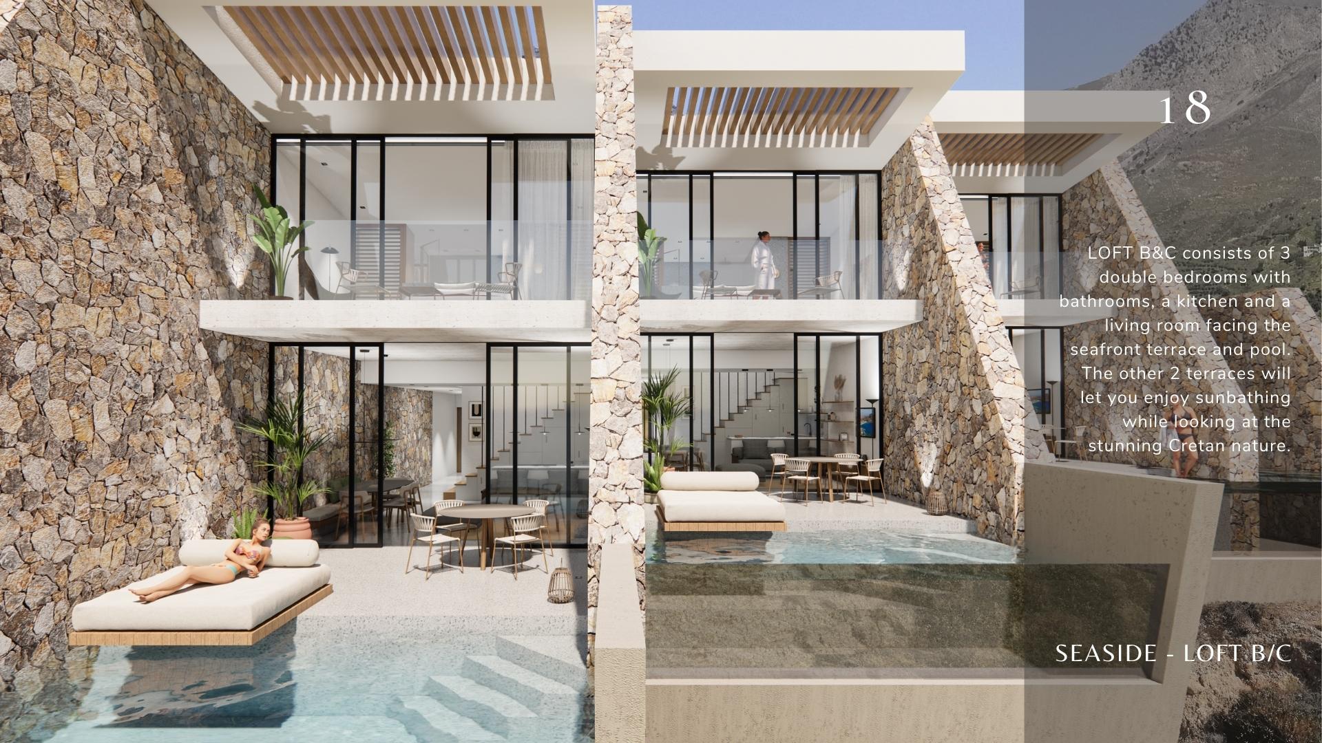 LOFT B&C consists of 3 double bedrooms with bathrooms, a kitchen and a living room facing the seafront terrace and pool. The other 2 terraces will let you enjoy sunbathing while looking at the stunning Cretan nature.
