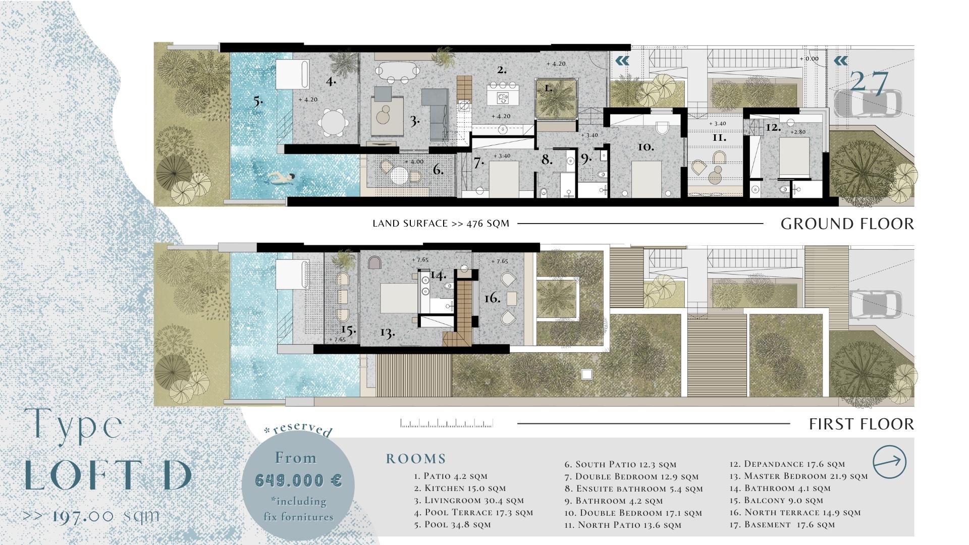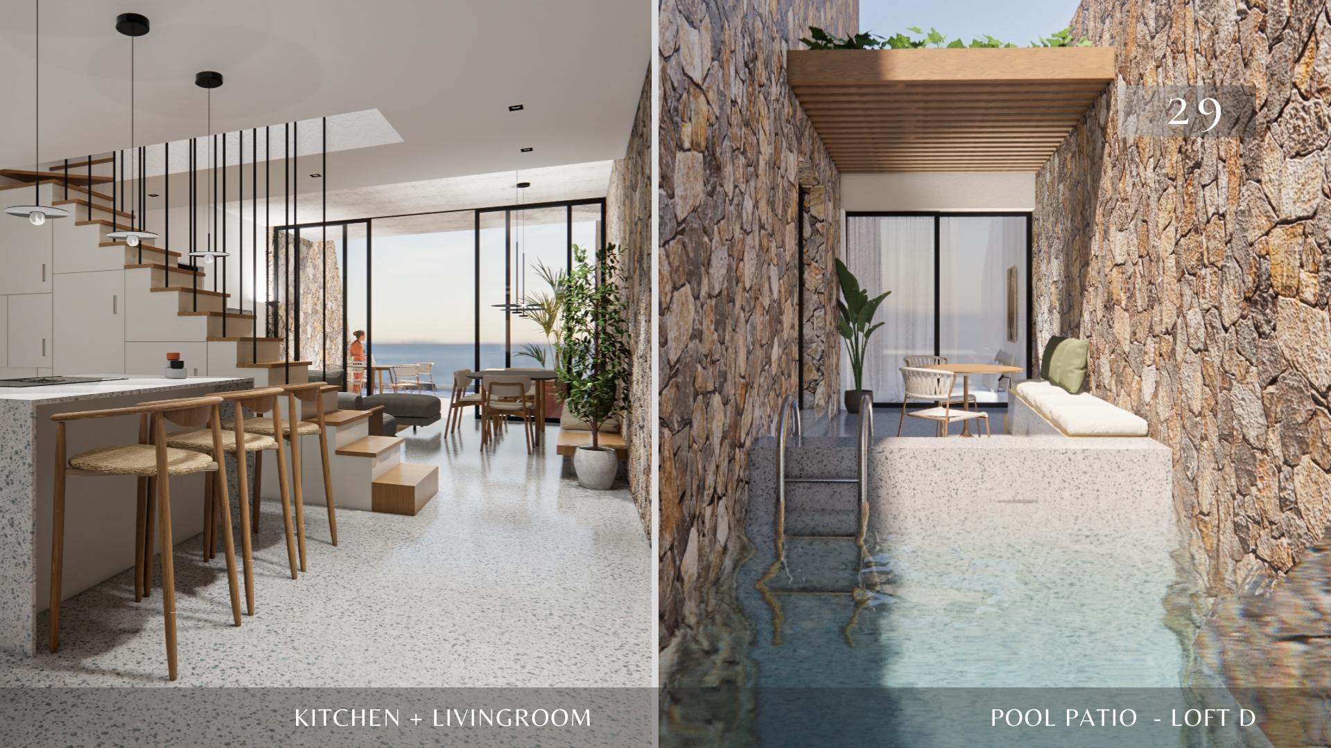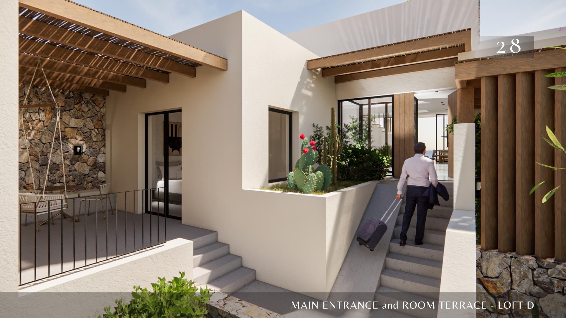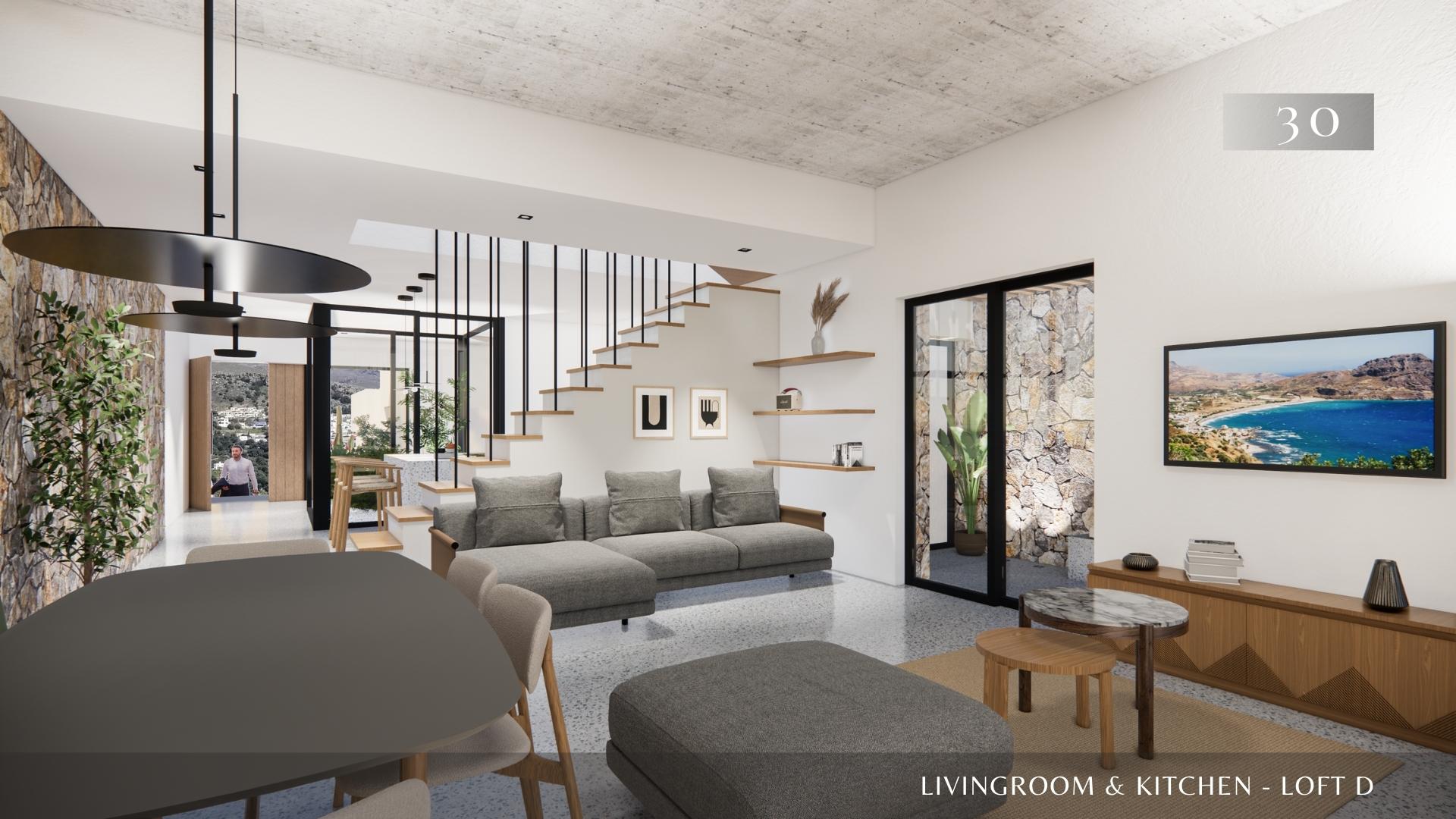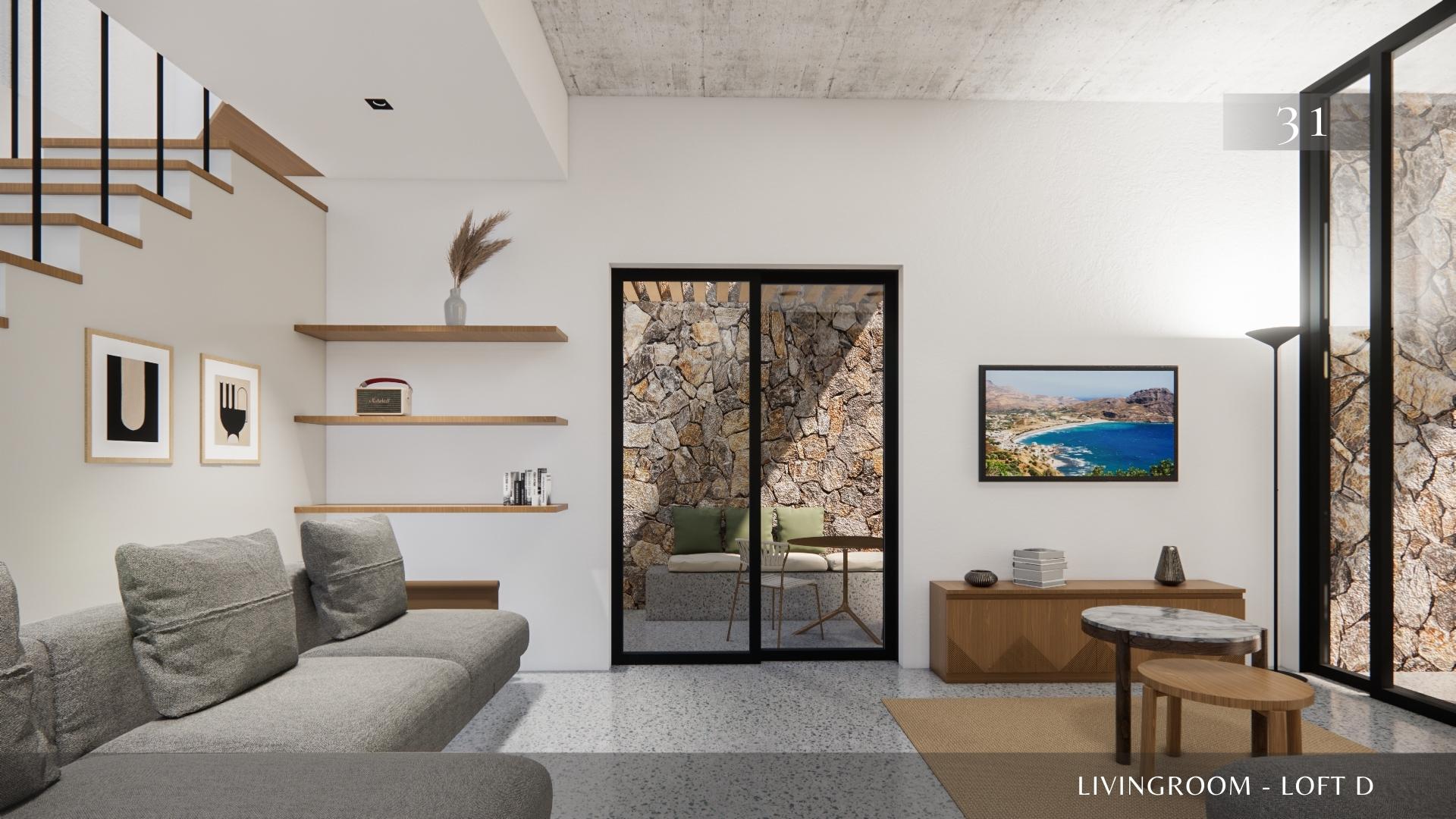 LOFT D è composto da 3 camere matrimoniali con bagno, caratterizzate da affacci silenziosi e riservati e da ampi spazi guardaroba e da una depandance con ingresso indipendente. Una spaziosa cucina e un soggiorno si affacciano sulla terrazza fronte mare e sulla piscina privata che si estende su un patio laterale con accesso dalla zona giorno. Altri 3 spazi esterni completano il loft, immerso nel verde e nella totale privacy, sviluppato tra la montagna e il mare di Creta permettendo di godere di una vista a 360 gradi.