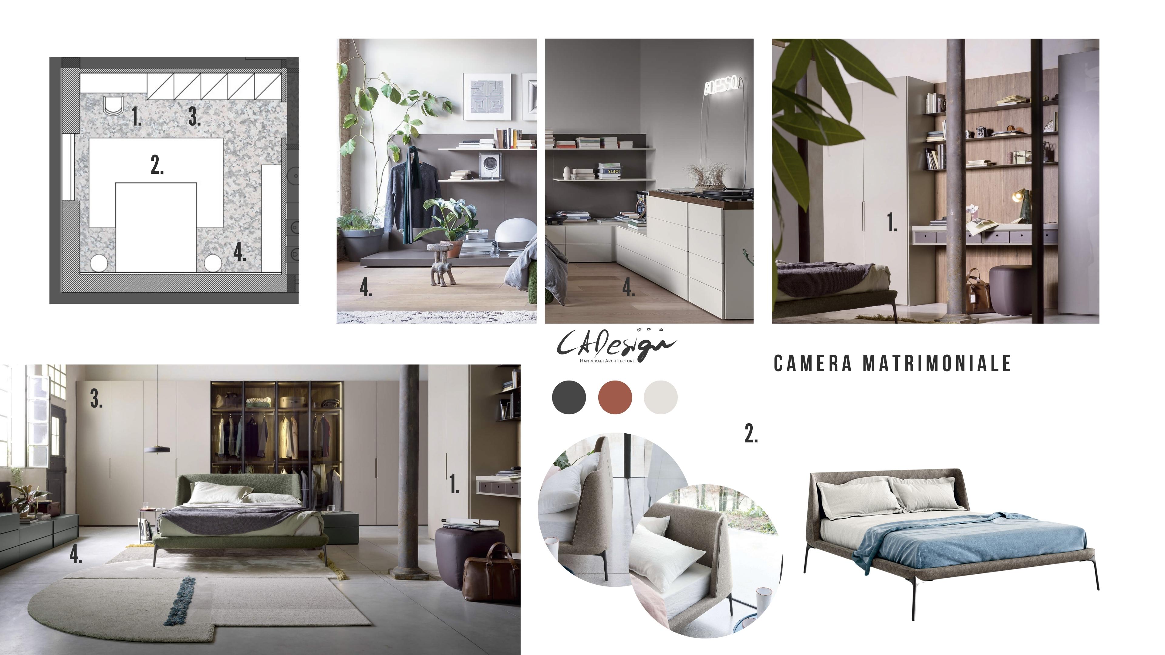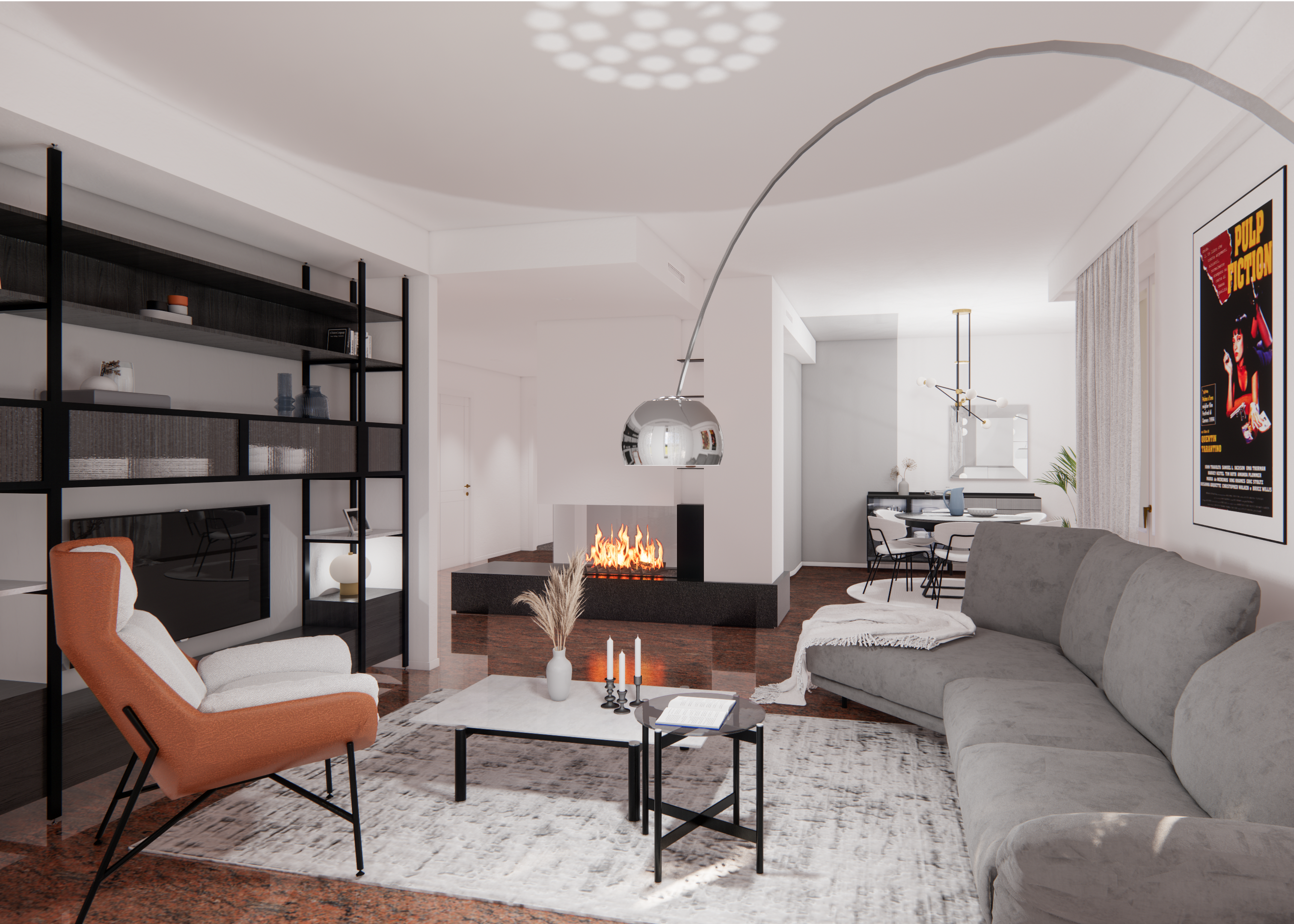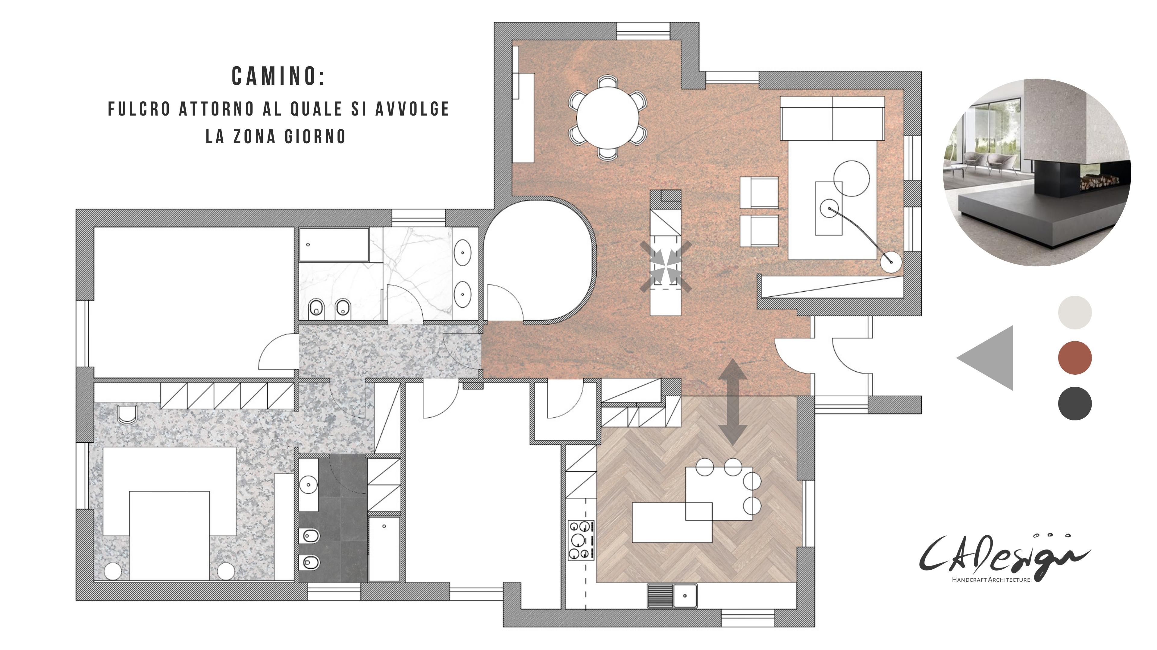 La maggior parte degli interventi, dunque, si concentra a livello di arredo e tinteggiature, tranne per la cucina dove verrà realizzato un pavimento in malta idraulica pozzolanica a bassissimo spessore (resina) sull’esistente al fine di migliorare l’accostamento con granito rosso del soggiorno, senza interventi pesanti preservando così l’impianto di riscaldamento a pavimento già operante e funzionante in tutta la casa.