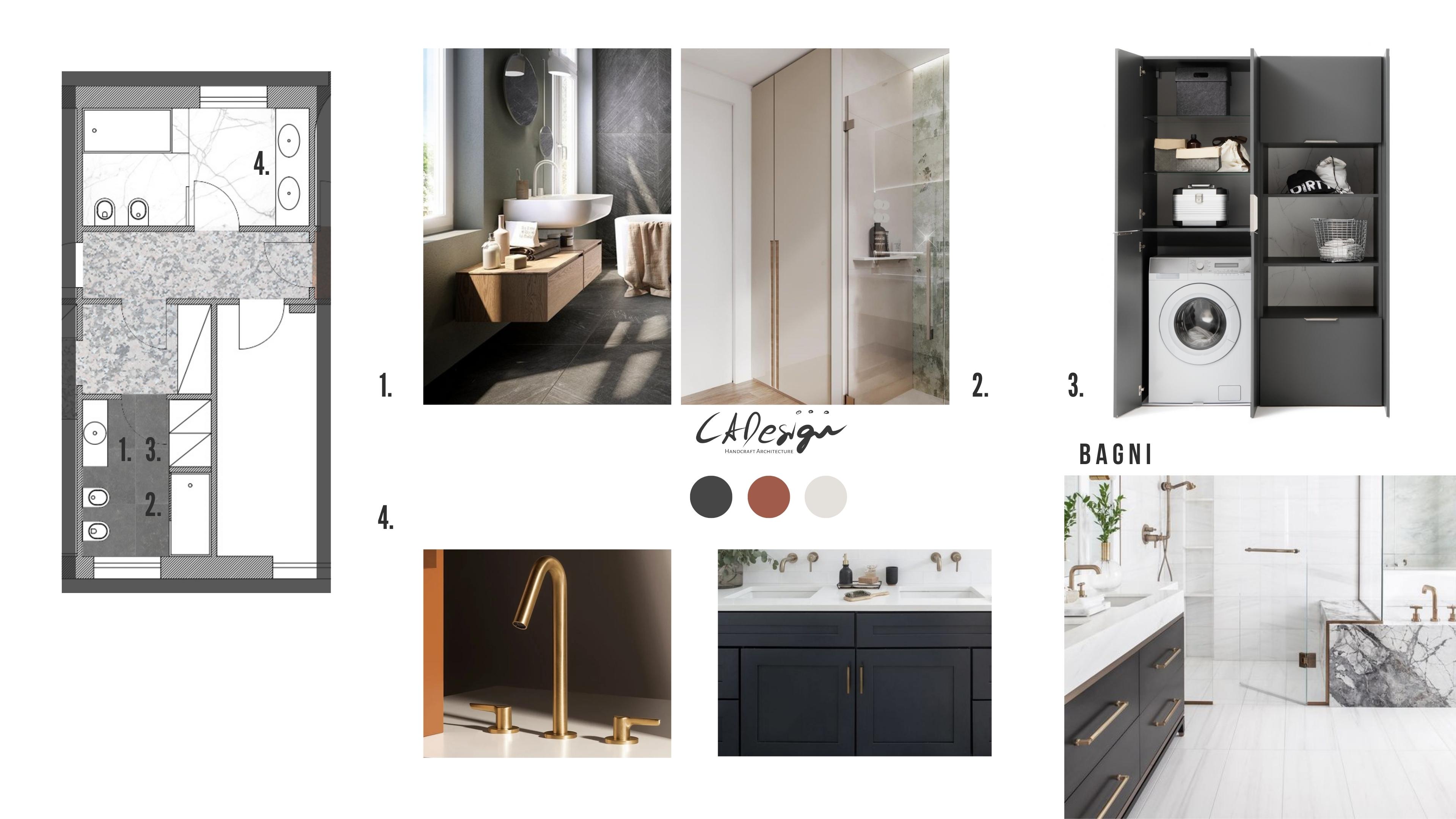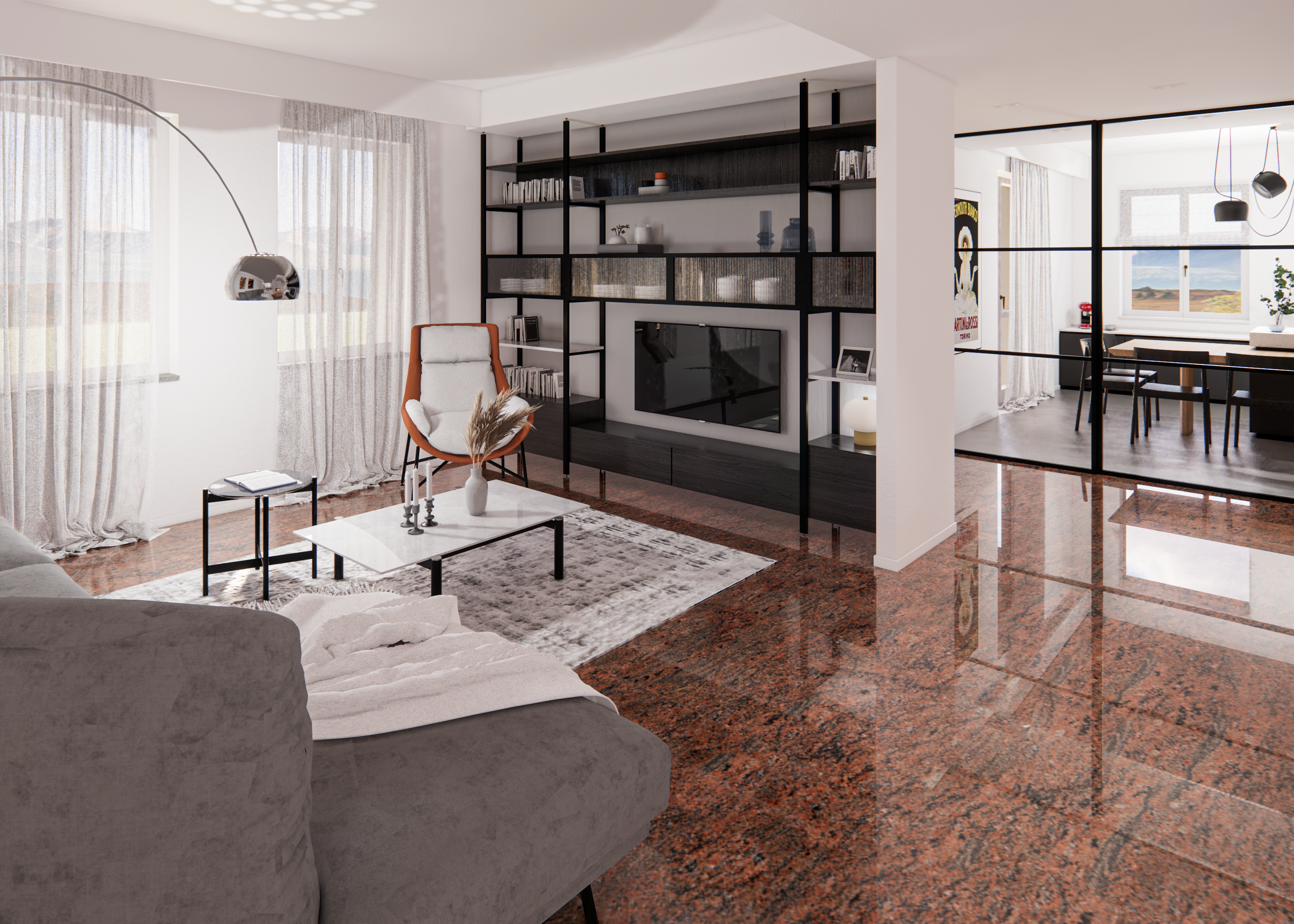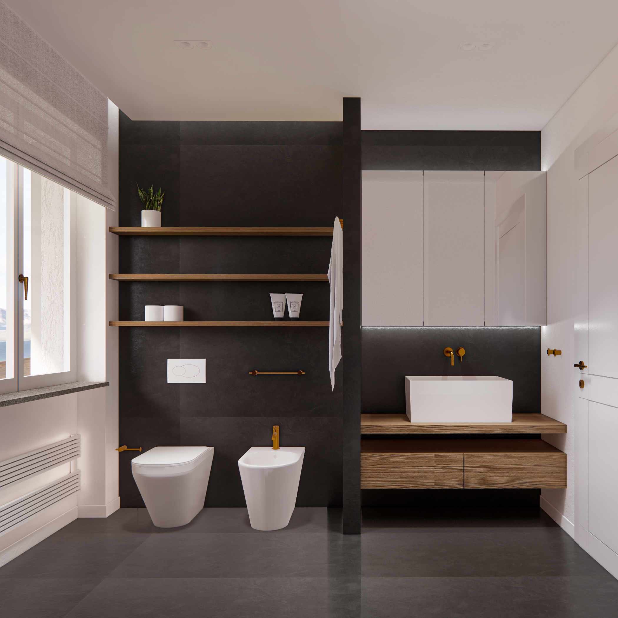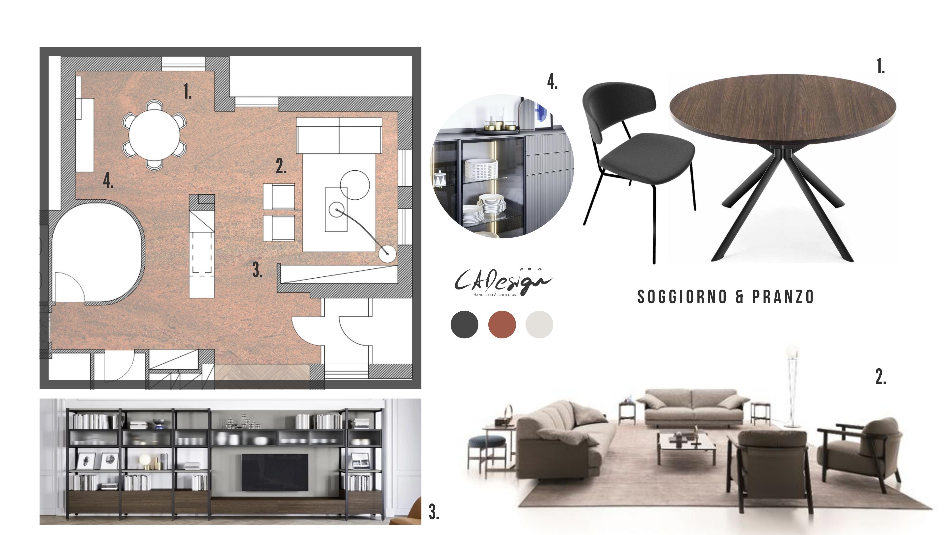 La maggior parte degli interventi, dunque, si concentra a livello di arredo e tinteggiature, tranne per la cucina dove verrà realizzato un pavimento in malta idraulica pozzolanica a bassissimo spessore (resina) sull’esistente al fine di migliorare l’accostamento con granito rosso del soggiorno, senza interventi pesanti preservando così l’impianto di riscaldamento a pavimento già operante e funzionante in tutta la casa.
