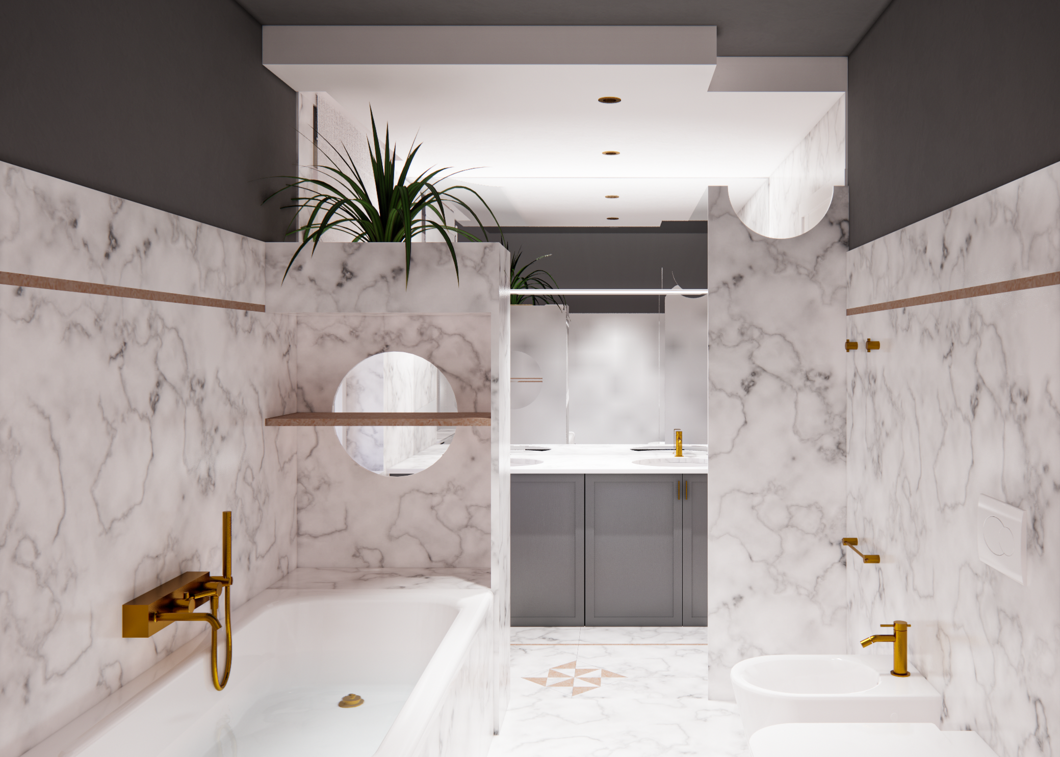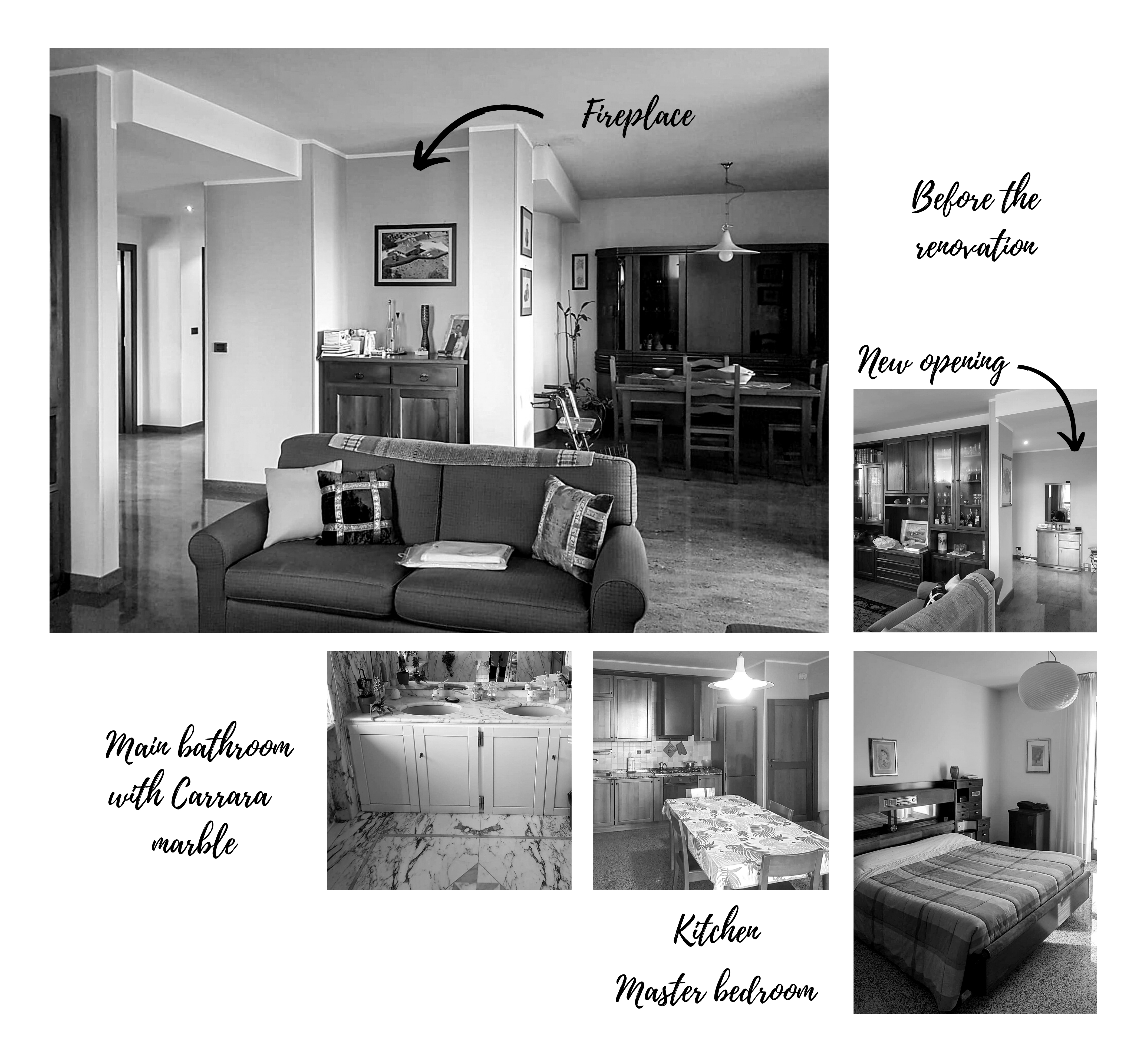 Made by a local architect and daughter of those years, it denotes some fine finishes and materials, such as the Carrara marble in the main bathroom or the natural stone flooring, which we decided to maintain and enhance together with the customers. A choice that, in addition to cost containment, also aims at saving resources.