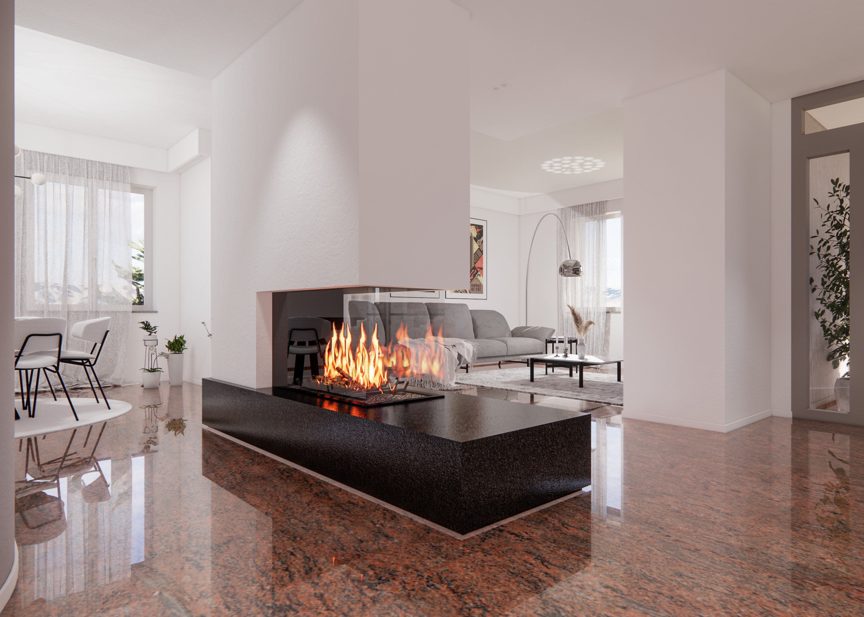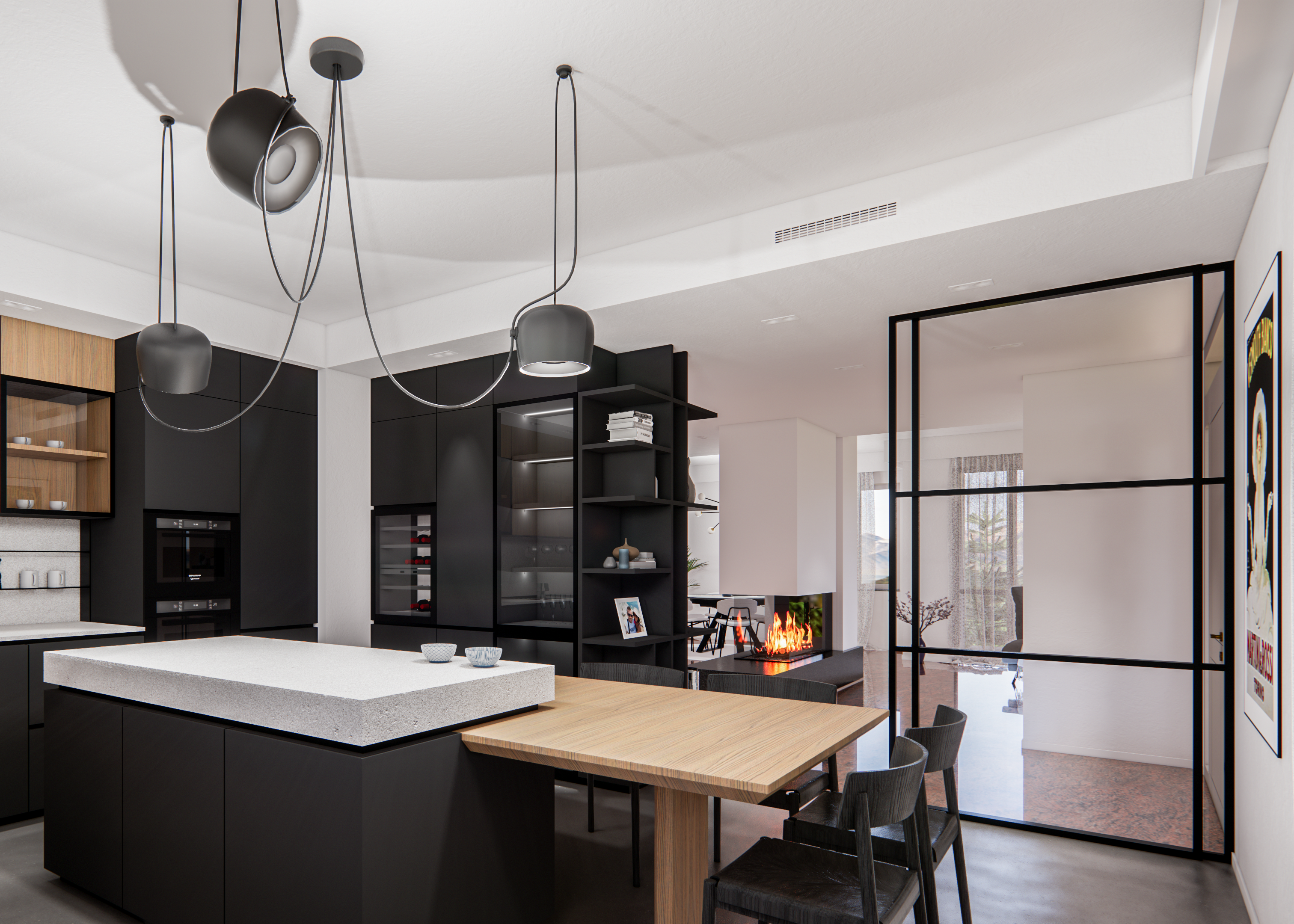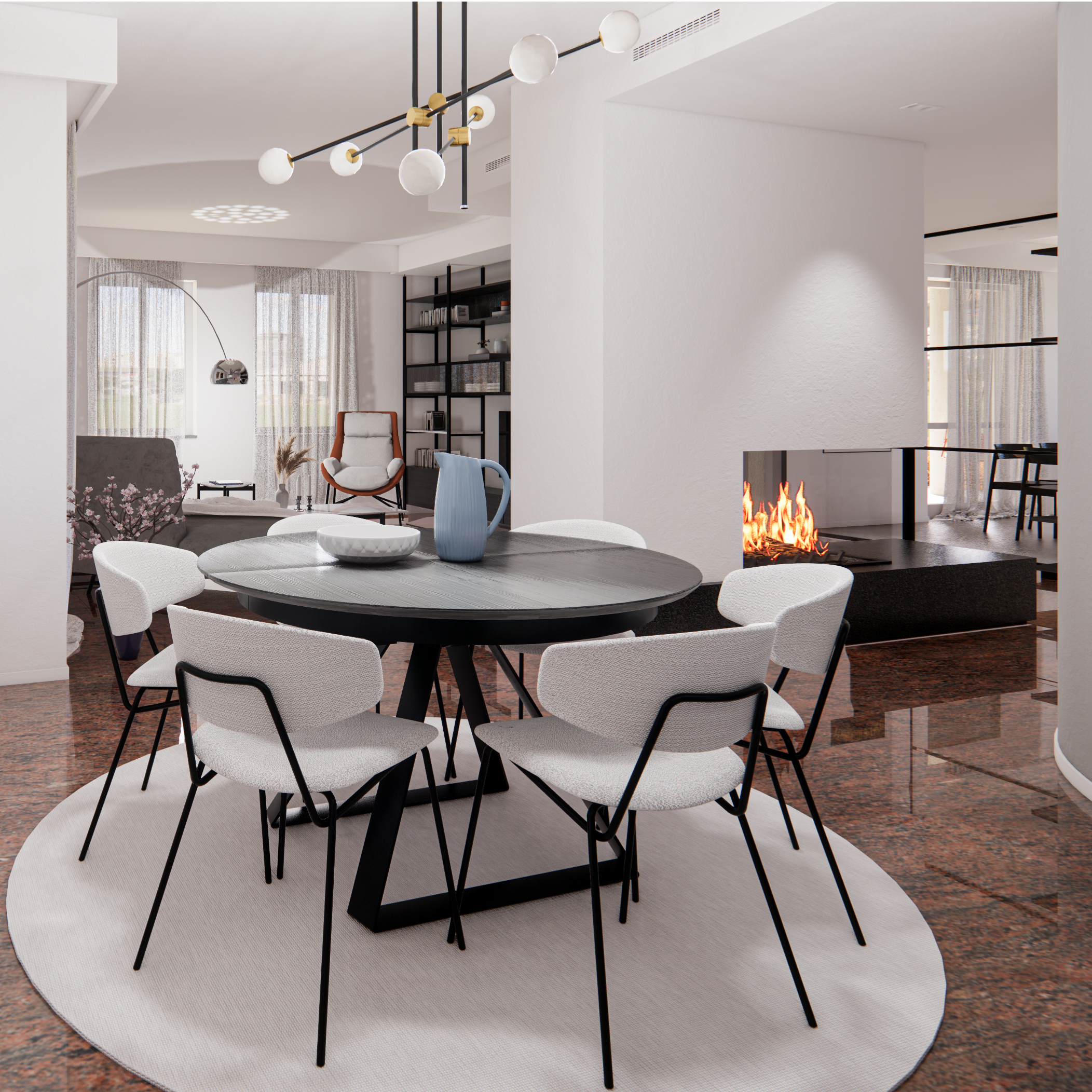È così che rinasce Villa M&M, intorno a un grande camino centrale – a bioetanolo – visibile già dall’ingresso e via via da tutte le aree che compongono la grande zona giorno: cucina, pranzo e soggiorno.