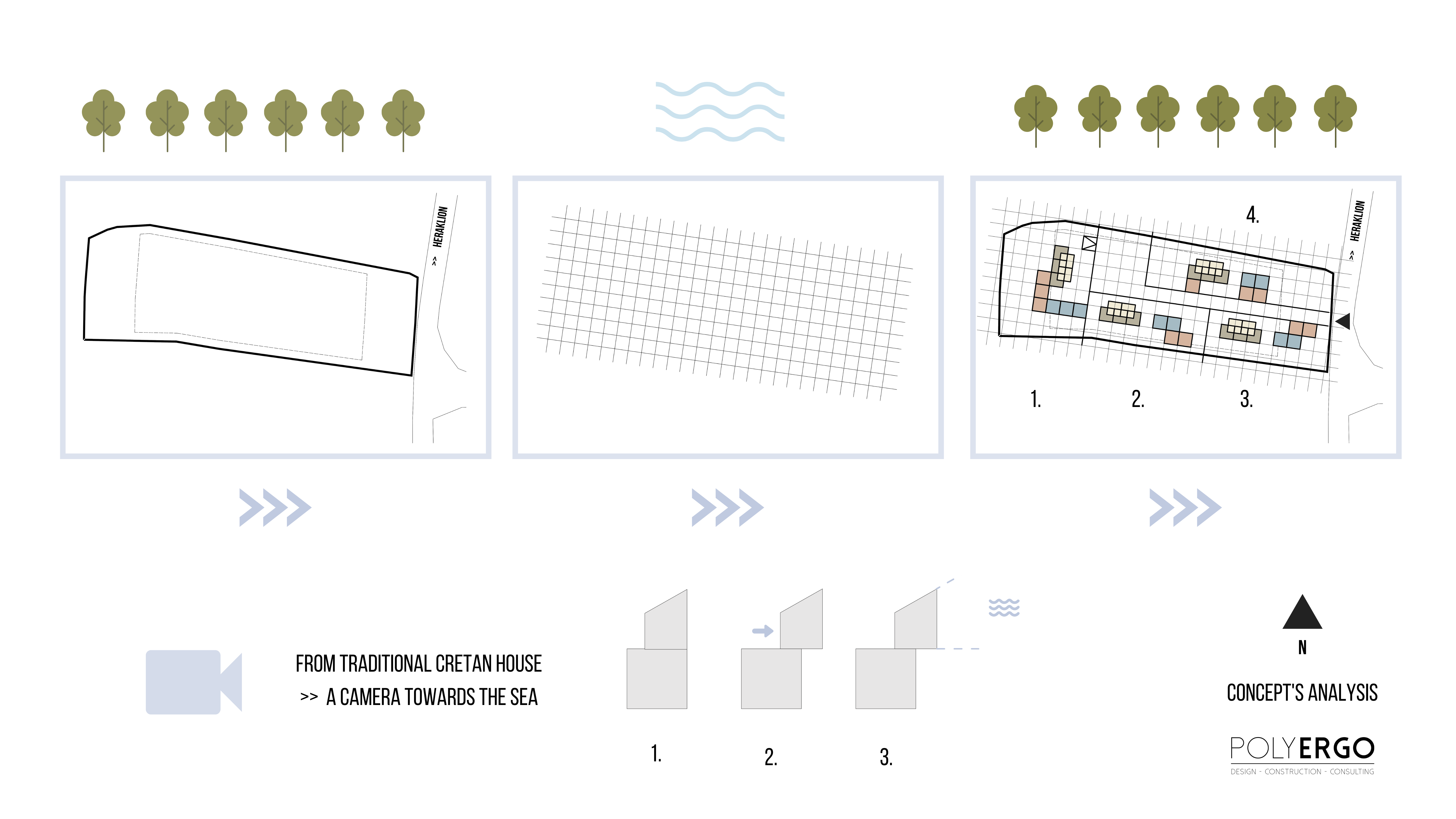 Sulle colline a Sud di Heraklion, capoluogo dell’isola di Creta, il terreno, ora piantumato ad ulivi – che resteranno parte integrante e fondante del progetto – si trova in una zona scarsamente edificata con un’ampia vista verso il mare a settentrione e sul monte Psiloritis a meridione.
