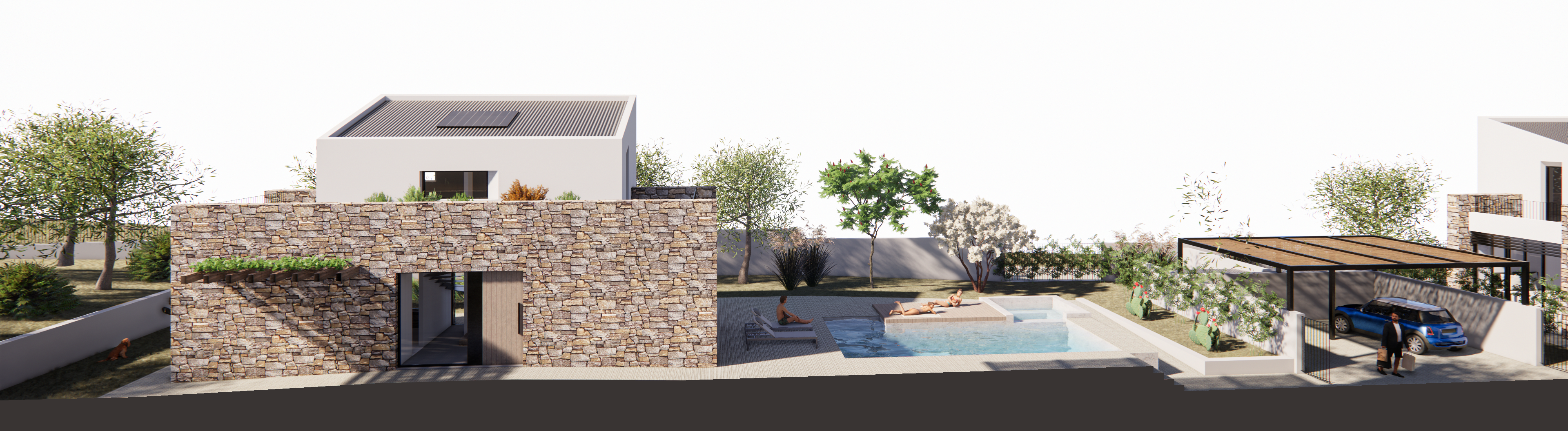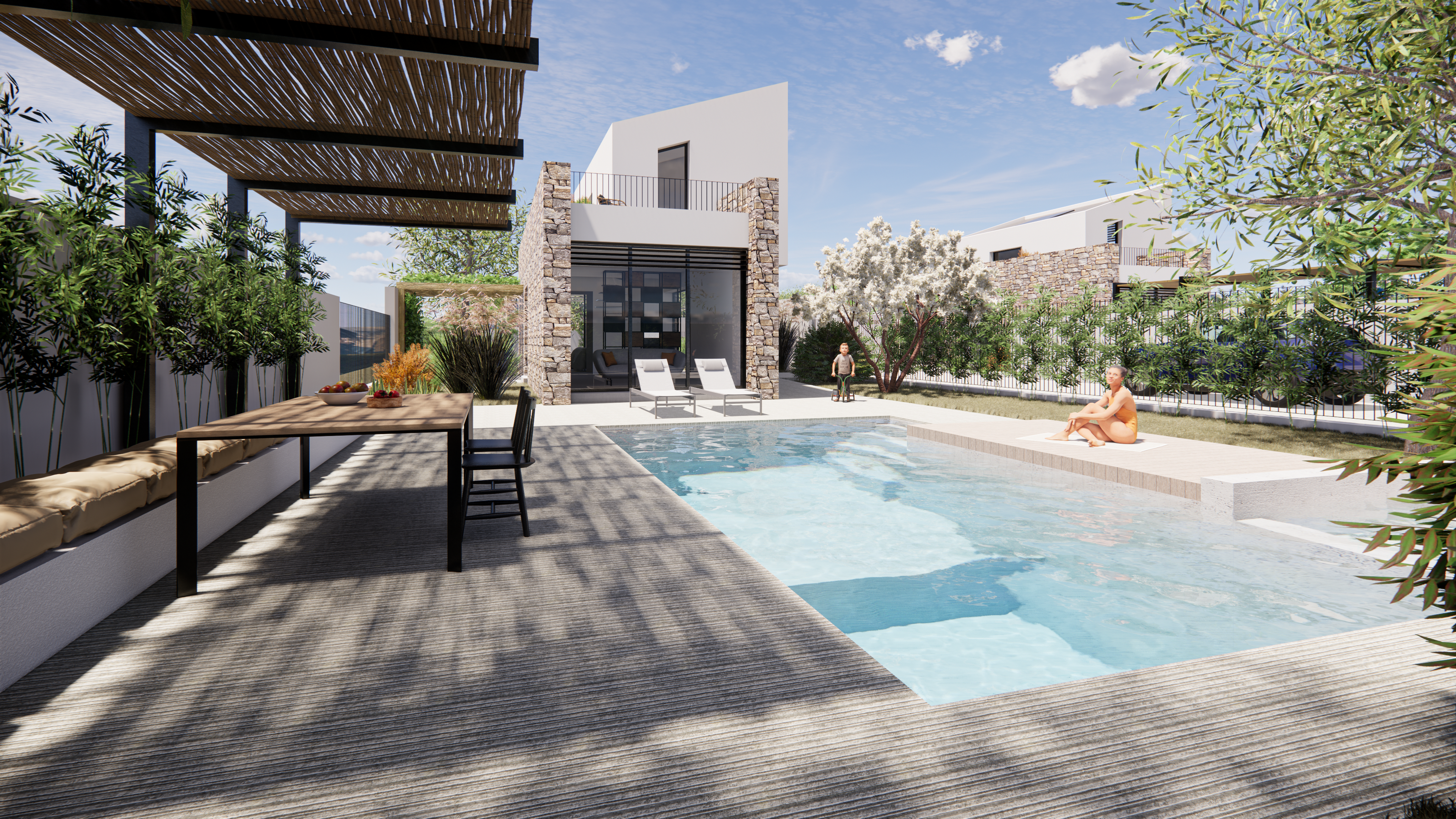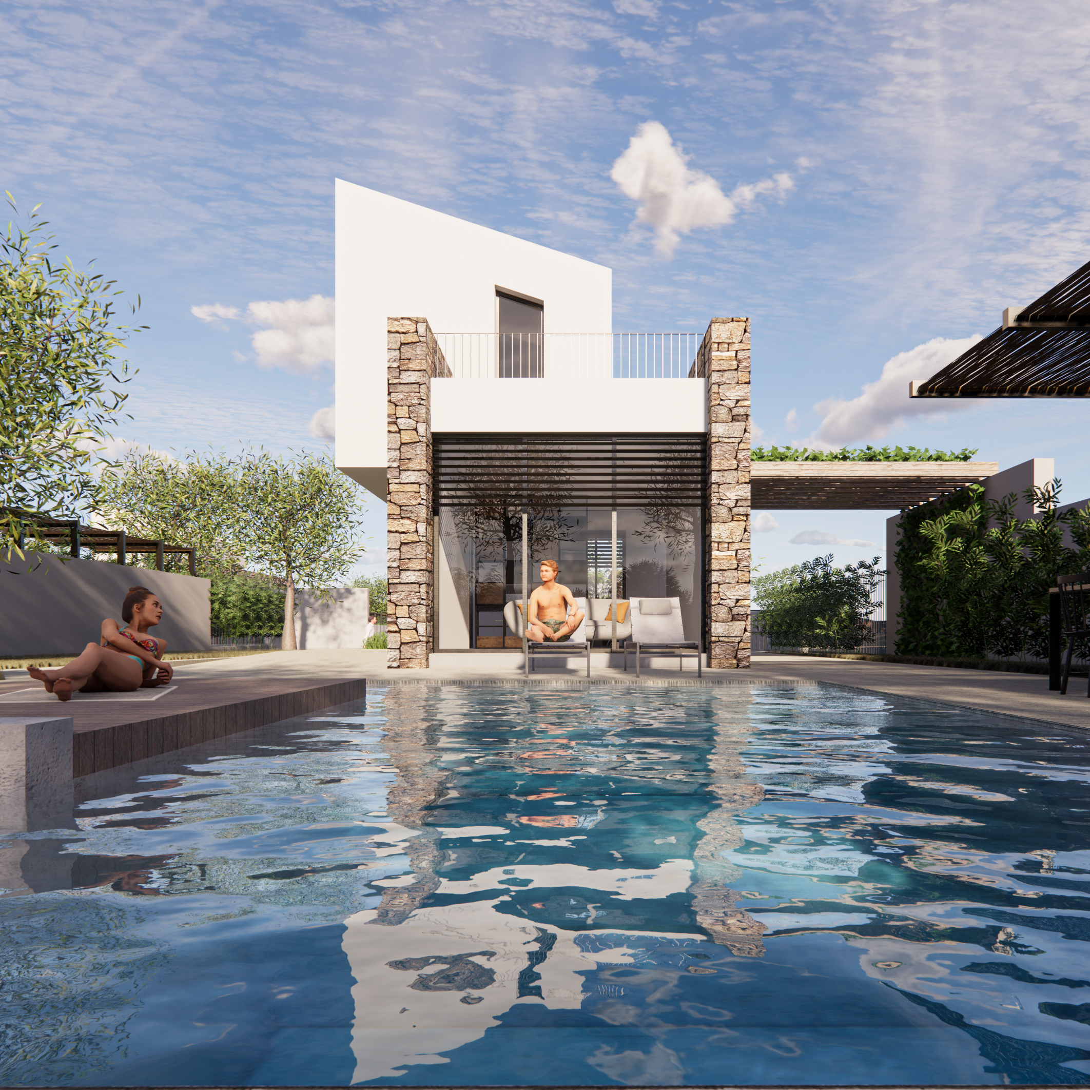 Pergole e piscine completeranno gli spazi esterni, mentre i parcheggi privati verranno realizzati nello spazio ricavato nell’area centrale al lotto di terreno.