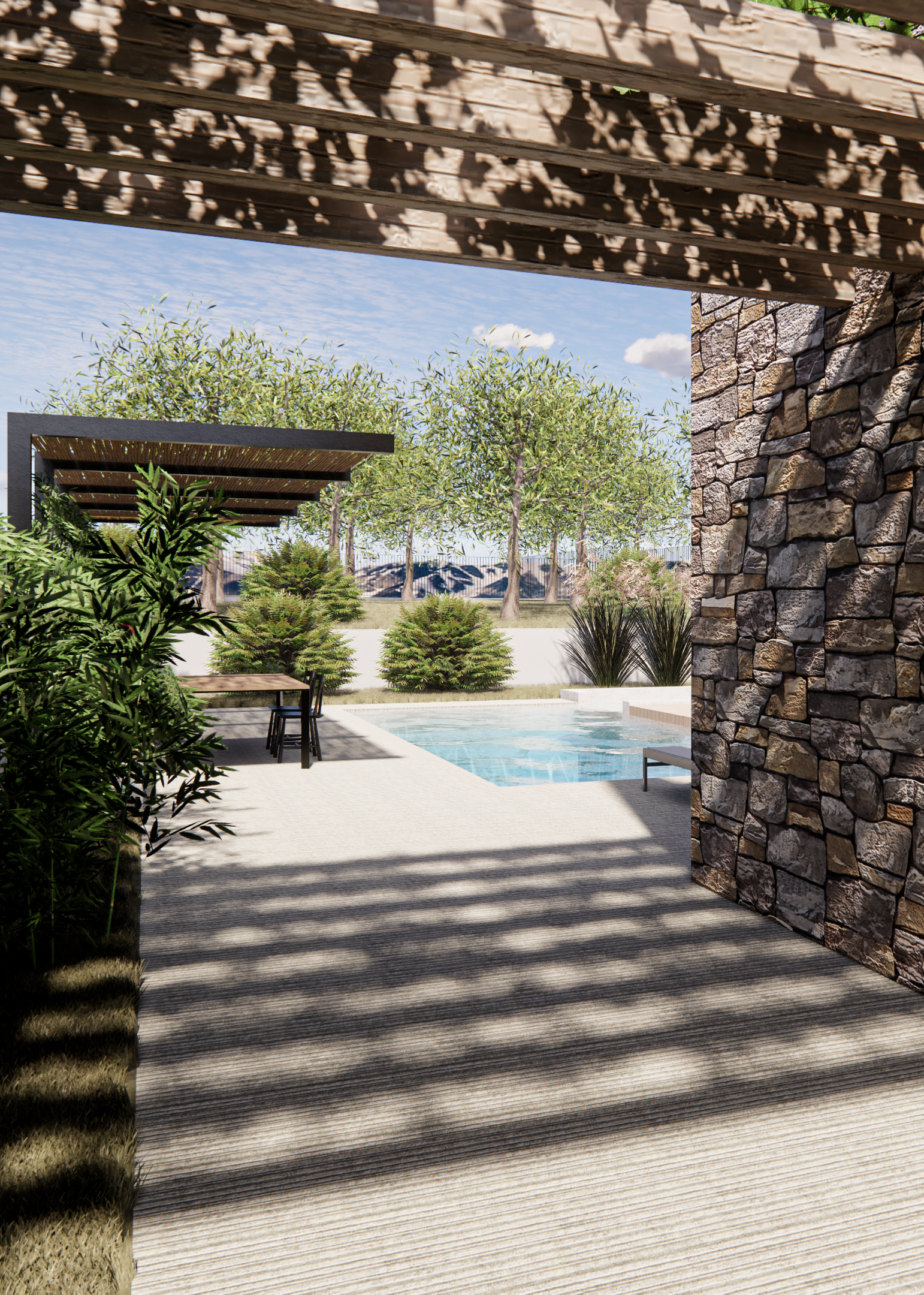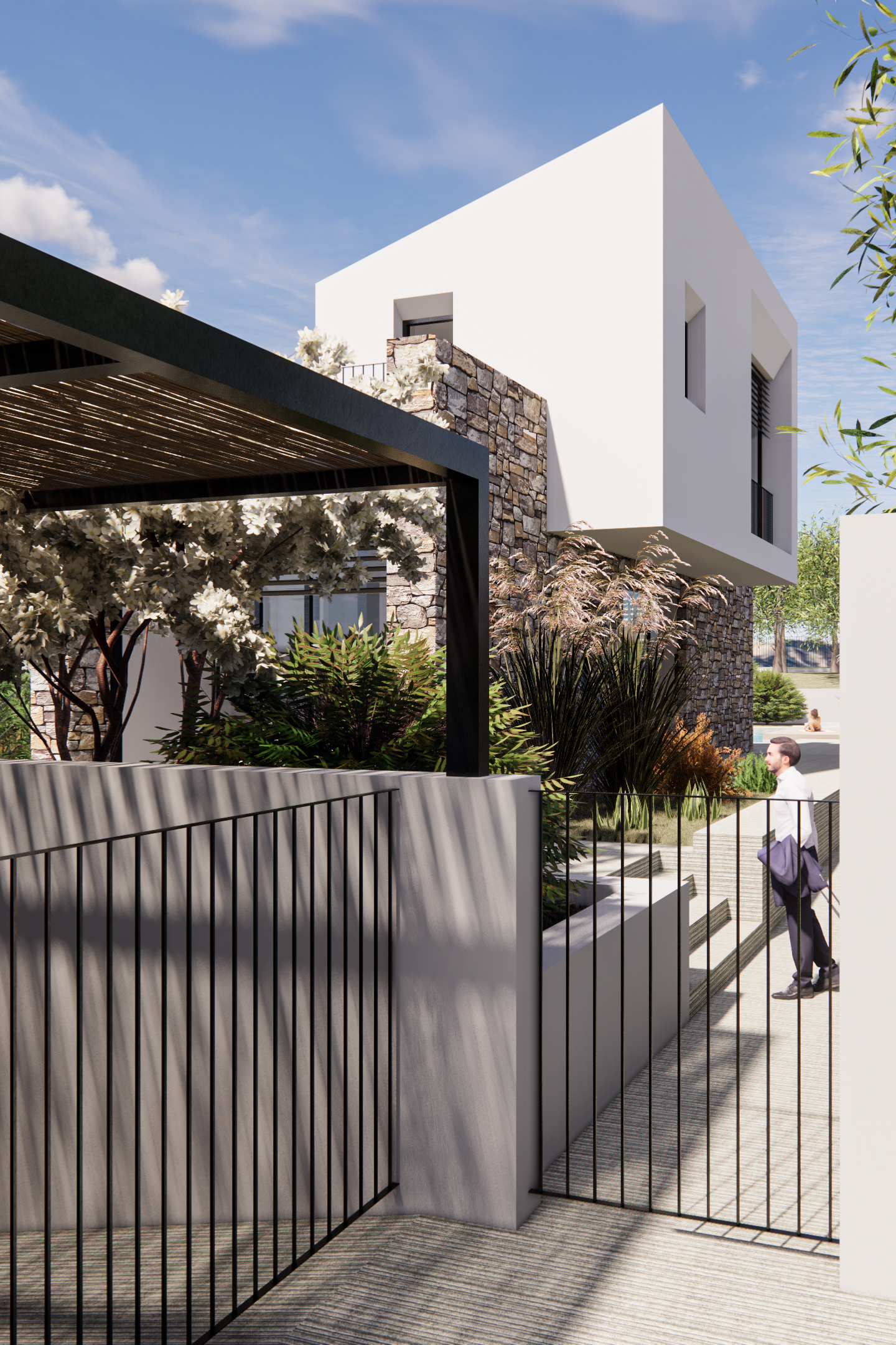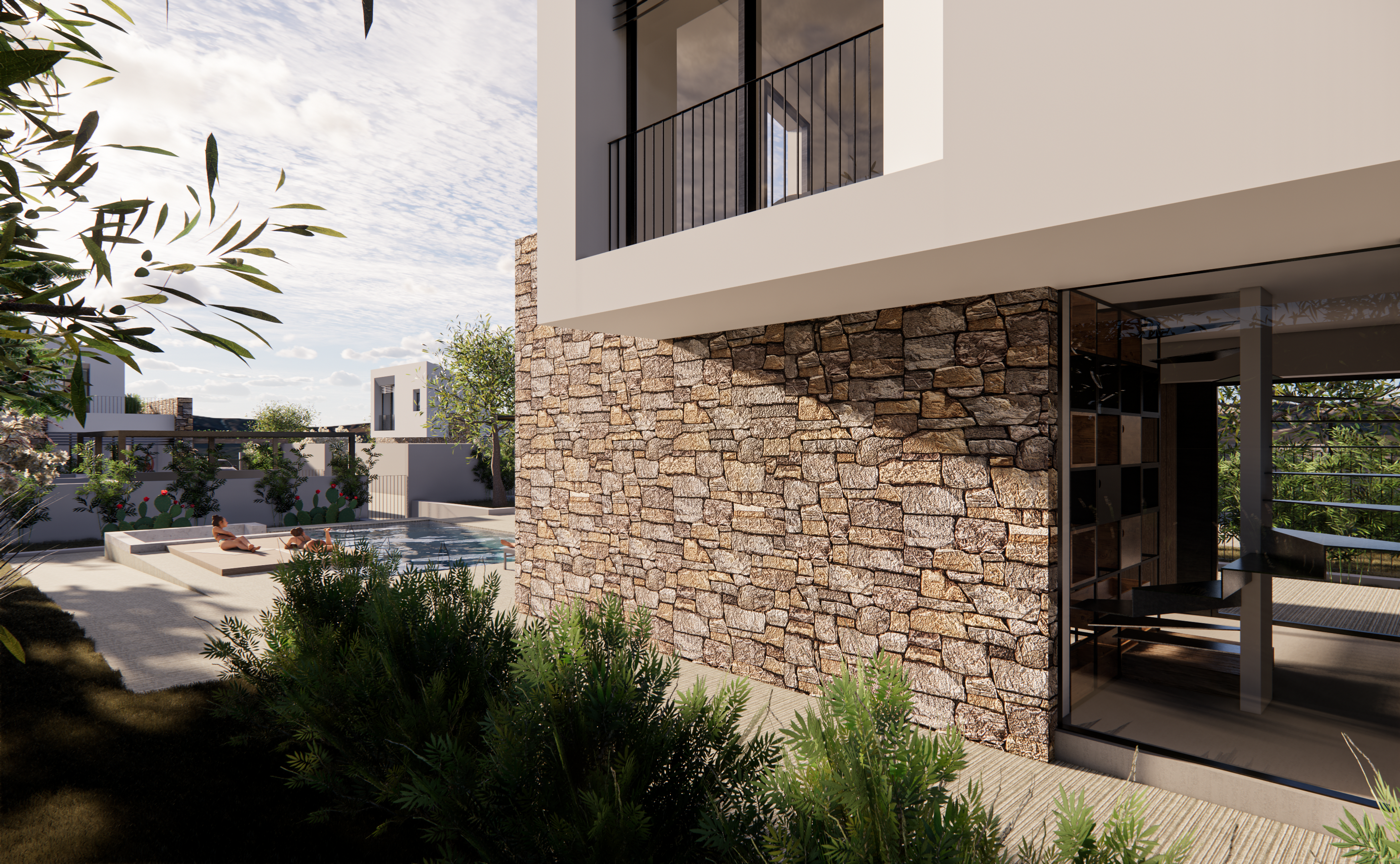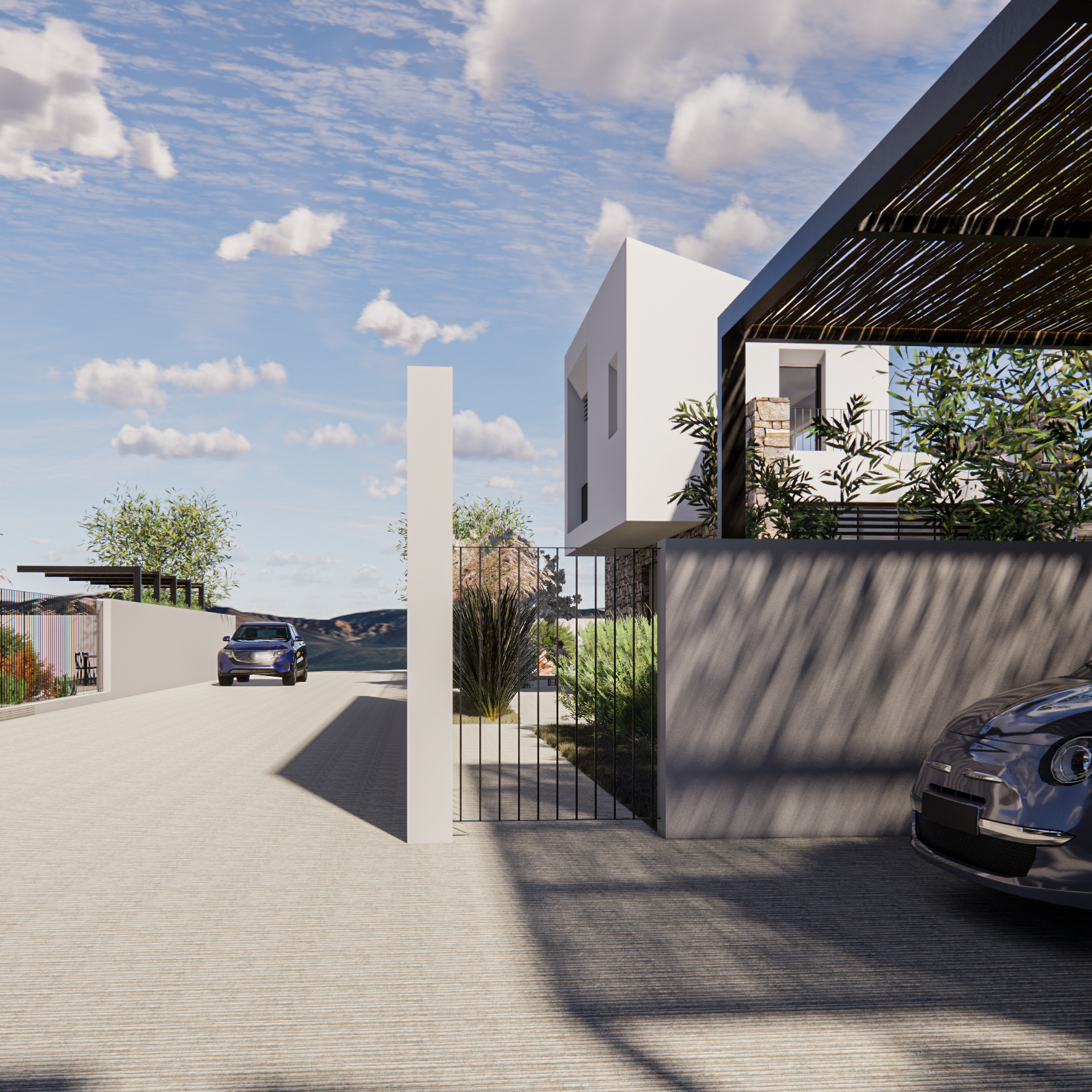 Pergole e piscine completeranno gli spazi esterni, mentre i parcheggi privati verranno realizzati nello spazio ricavato nell’area centrale al lotto di terreno.