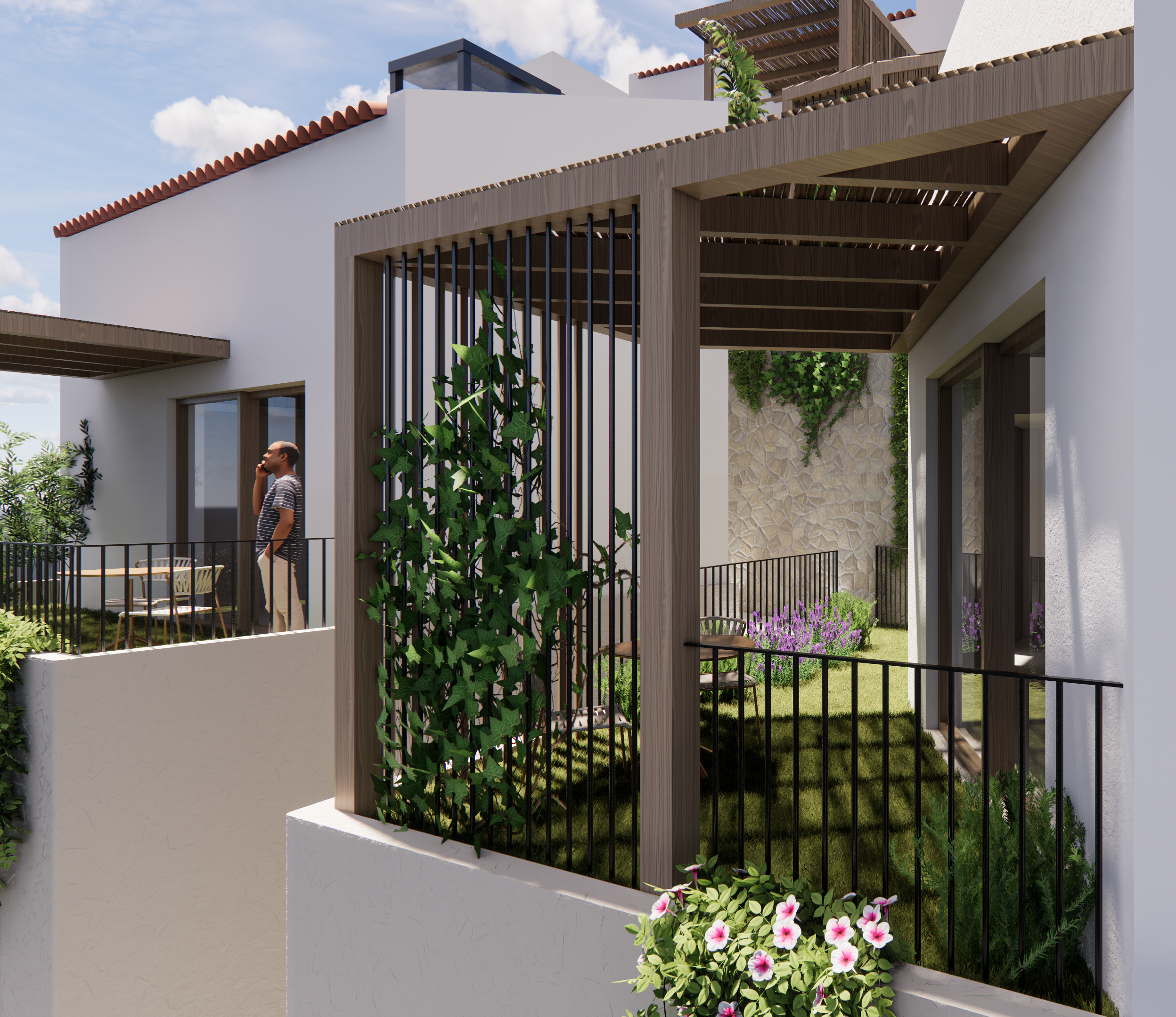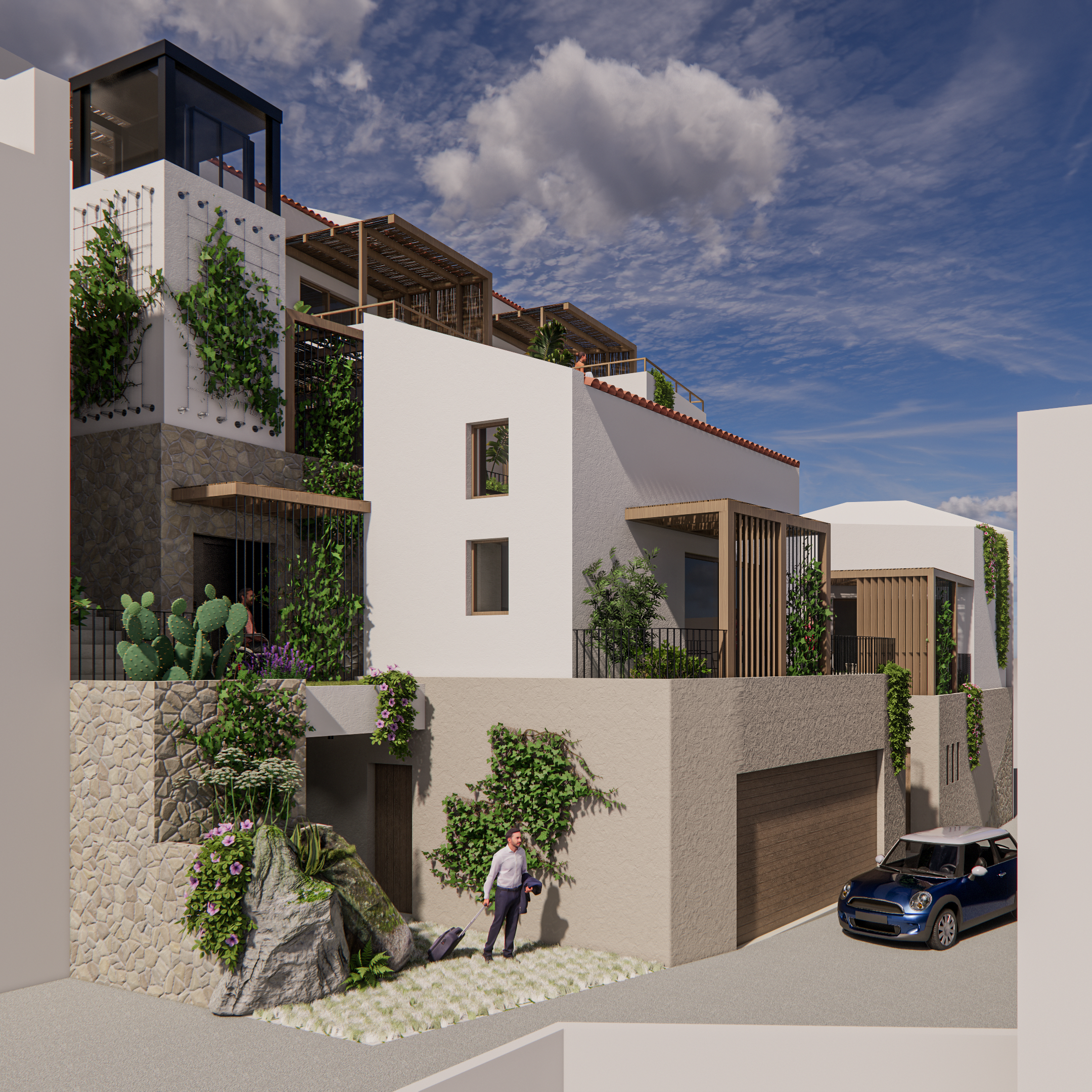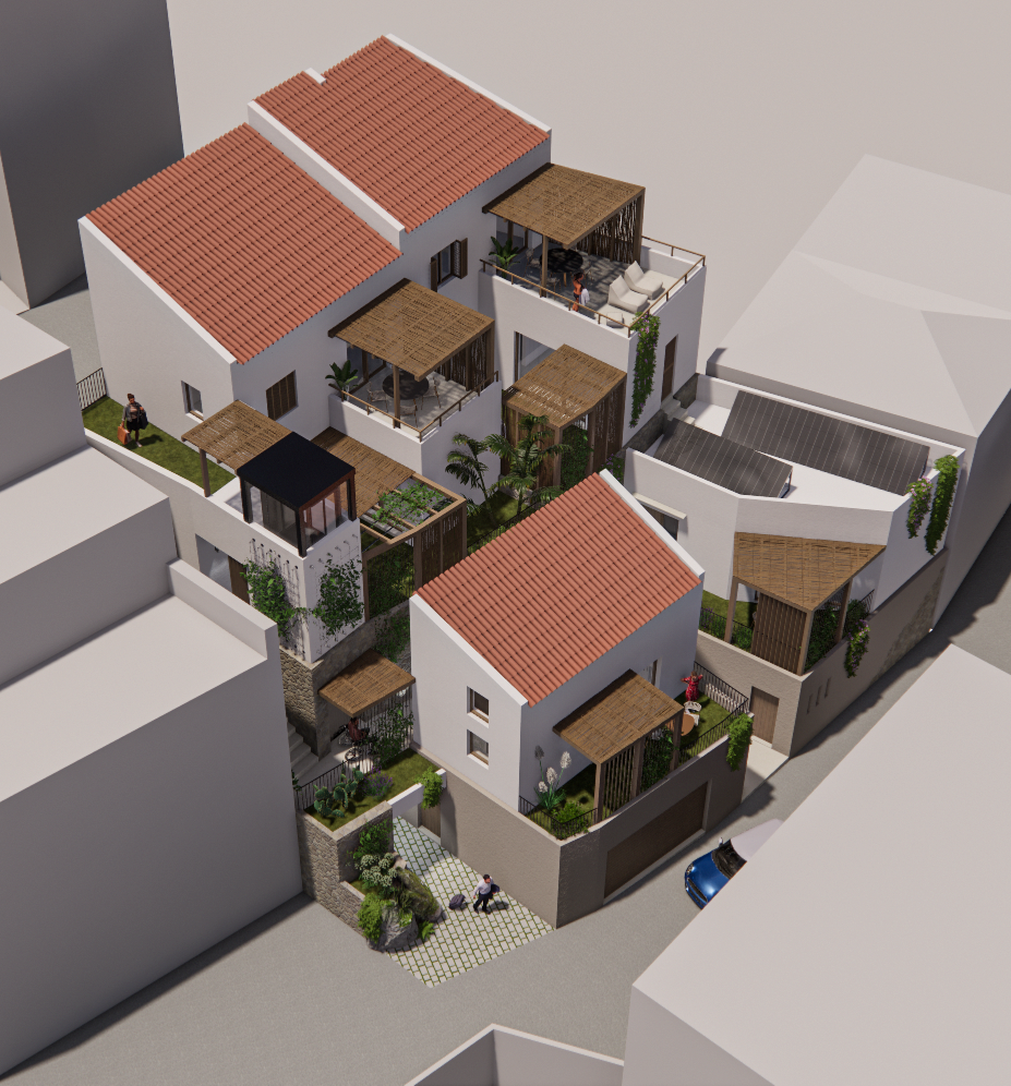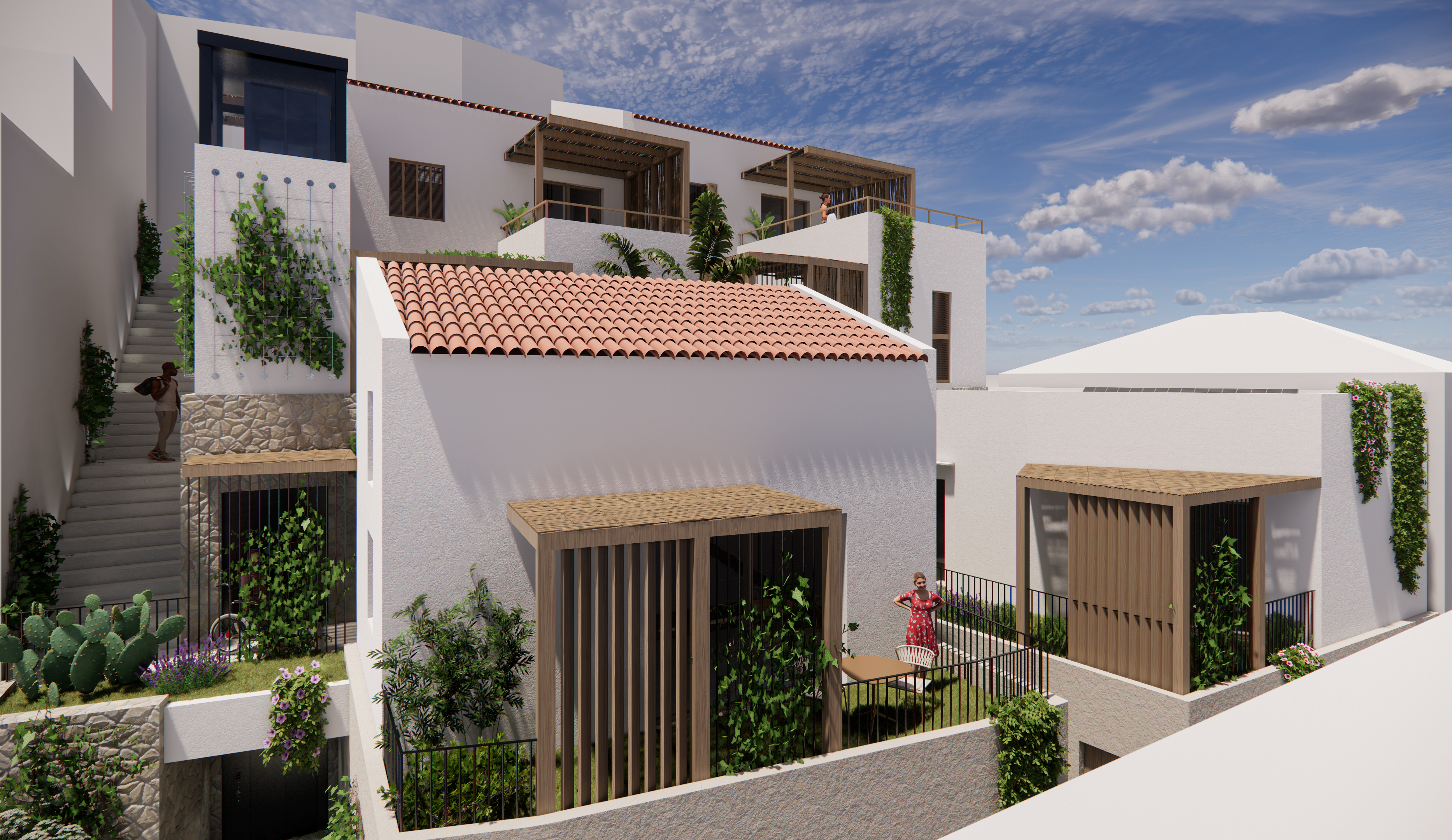From stylistic point of view the buildings presents ceramic tiles roof with ridge parallel to the coast (like the majority of the existing constructions) and middle level terraces accessible from the higher floor, used for leisure and to host solar panels without compromising the general aesthetic. The environment is a very important requirement to care about nowadays that we have to face strong climate changes. In this way they are not going to be visible from the streets, but they have the proper orientation towards the South.