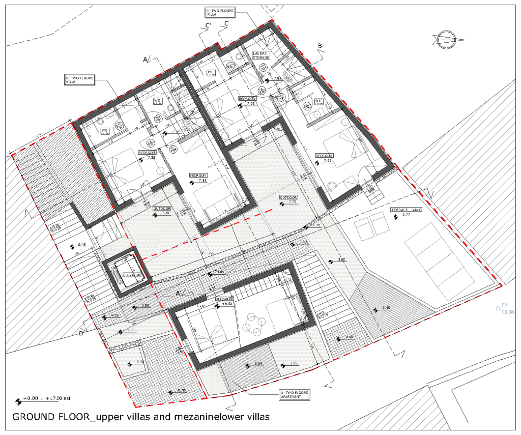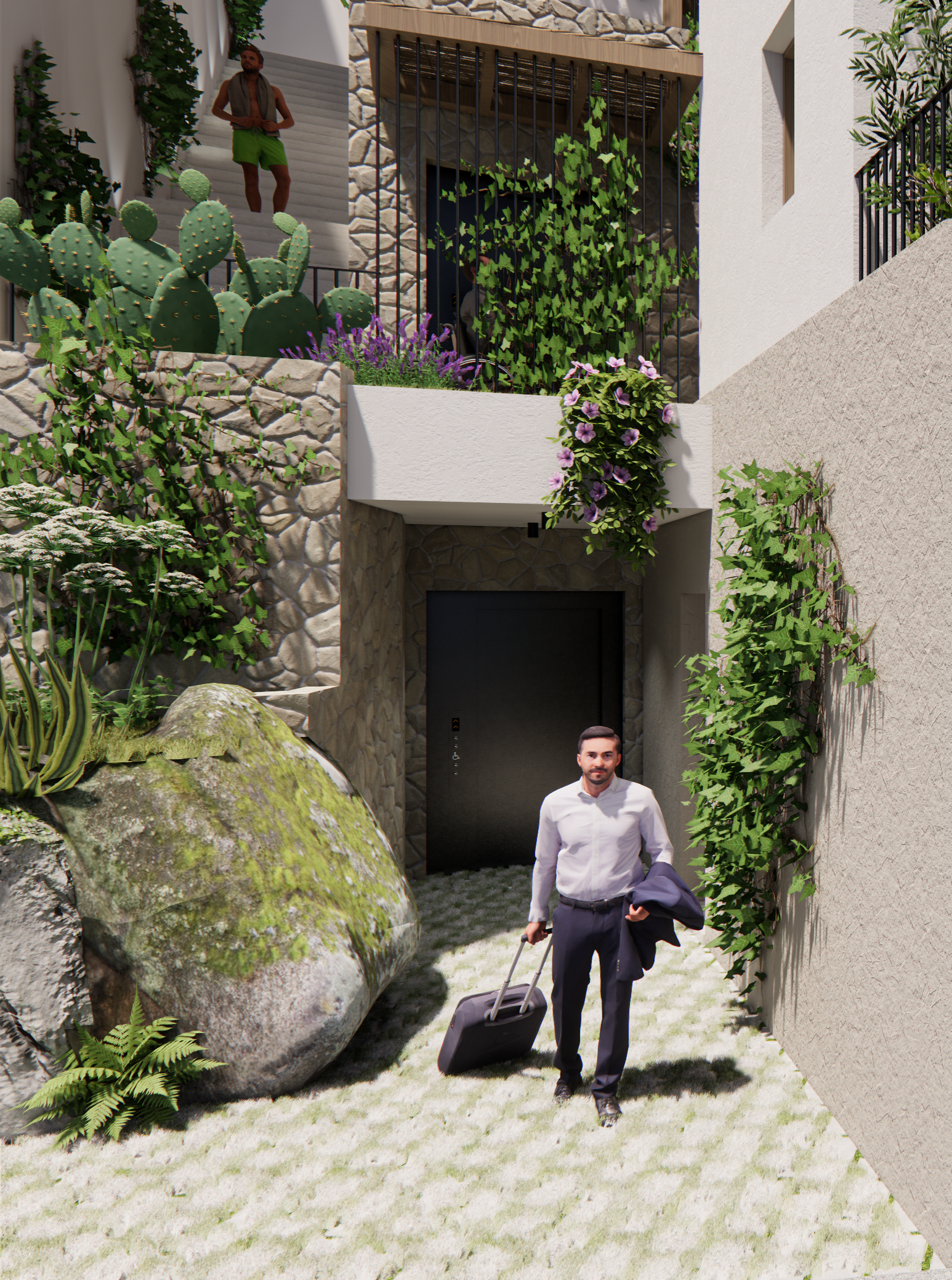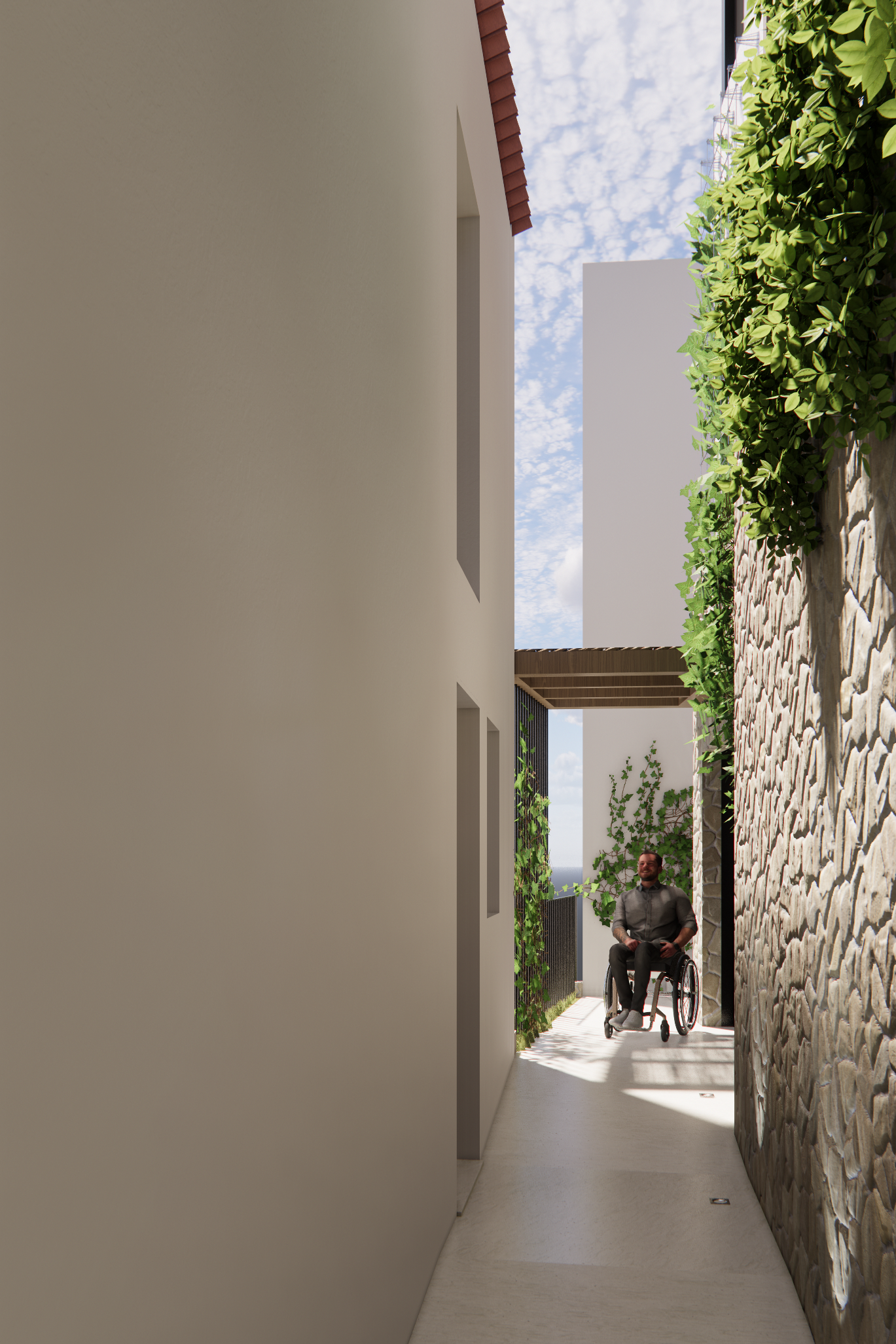 Verrà mantenuto il doppio accesso al terreno dalle 2 strade, superiore ed inferiore, supportati da un percorso pedonale che attraversa la proprietà e da un ascensore che consentirà anche alle persone con disabilità di raggiungere il livello superiore e medio dove si trovano gli ingressi alle case.