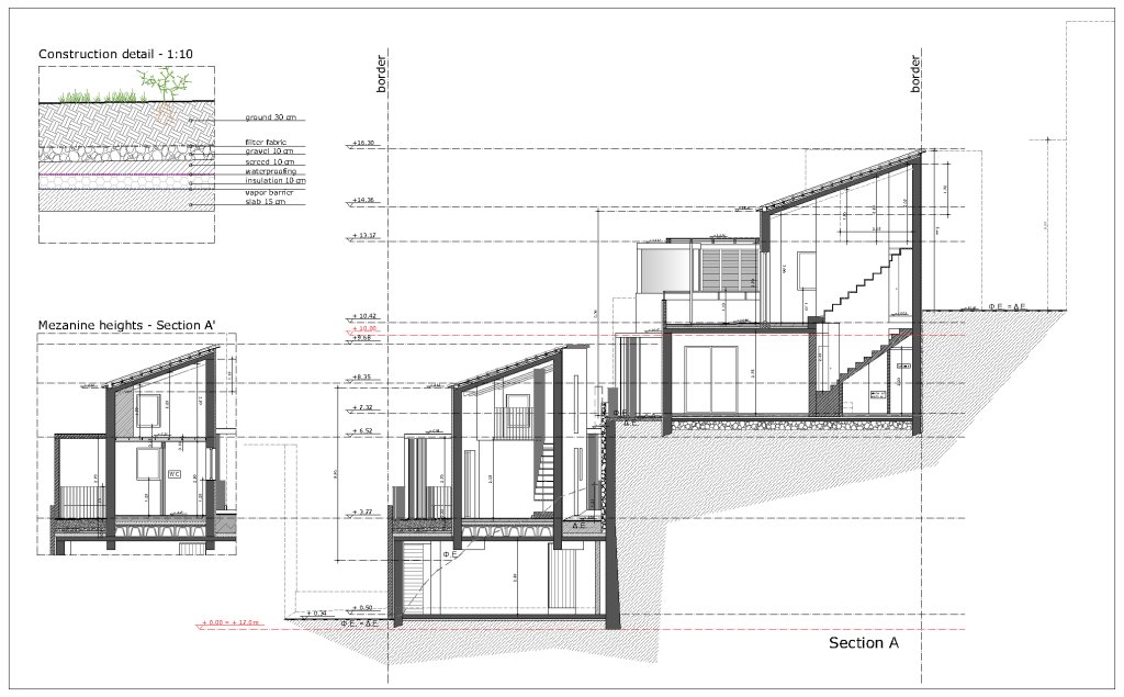 Le facciate saranno intonacate con texture diverse per sottolineare la diversa destinazione d’uso del livello inferiore adibito a garage e locale tecnico. Mentre il muro di contenimento sarà consolidato mantenendo la pietra pietra a vista. Anche sul lato sud del terreno la parete rocciosa naturale sarà preservata, stabilizzata e adattata al nuovo design e alle nuove funzioni.
