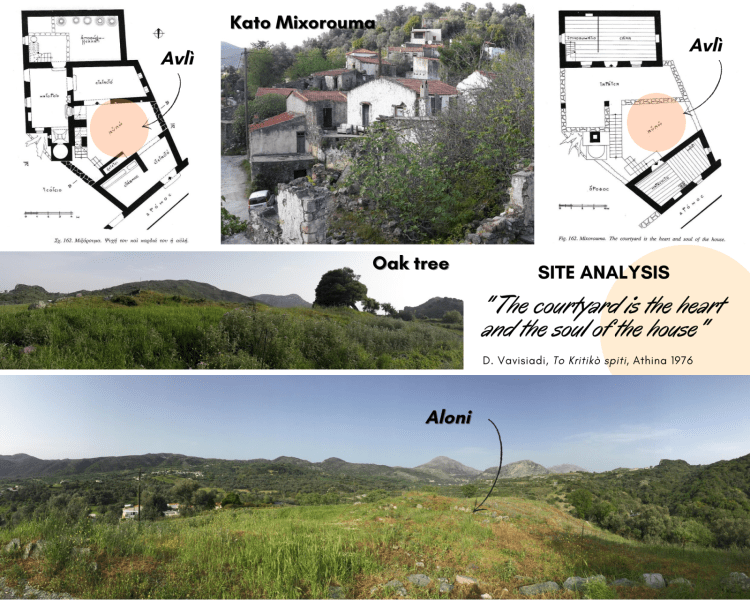 Έχοντας τοποθετηθεί ανάμεσα σε μια παλιά βελανιδιά στη Δύση και ένα Αλώνι – χαμηλή κυκλική πέτρινη κατασκευή που χρησιμοποιείται για τη γεωργία – προστατευμένο από το Αρχαιολογικό Ινστιτούτο στην Ανατολή, το σπίτι ανοίγει προς το Νότο διατηρώντας παράλληλα ένα πιο προστατευμένο και κλειστό προφίλ στο Βορρά προς το νέο χωριό.