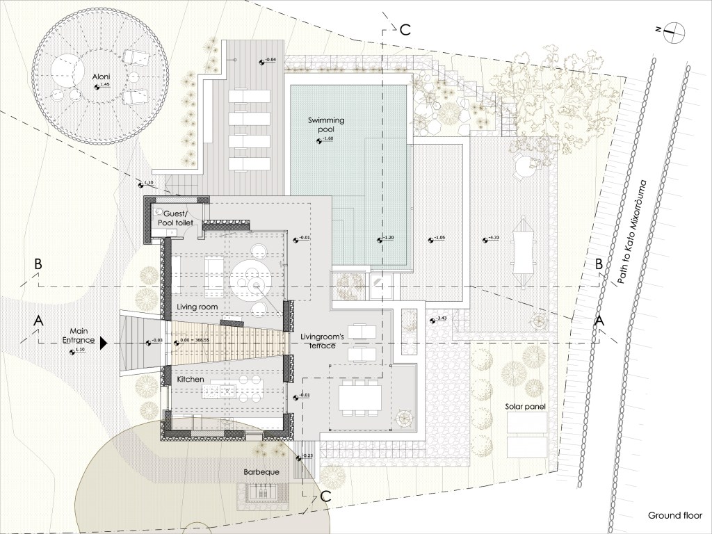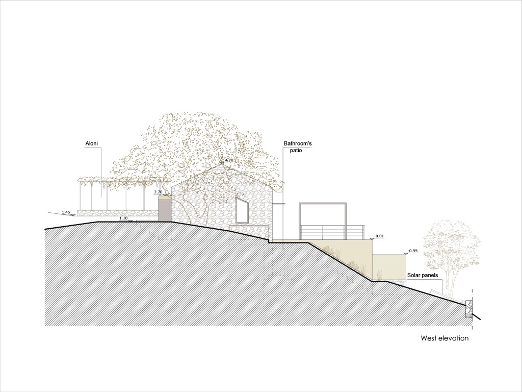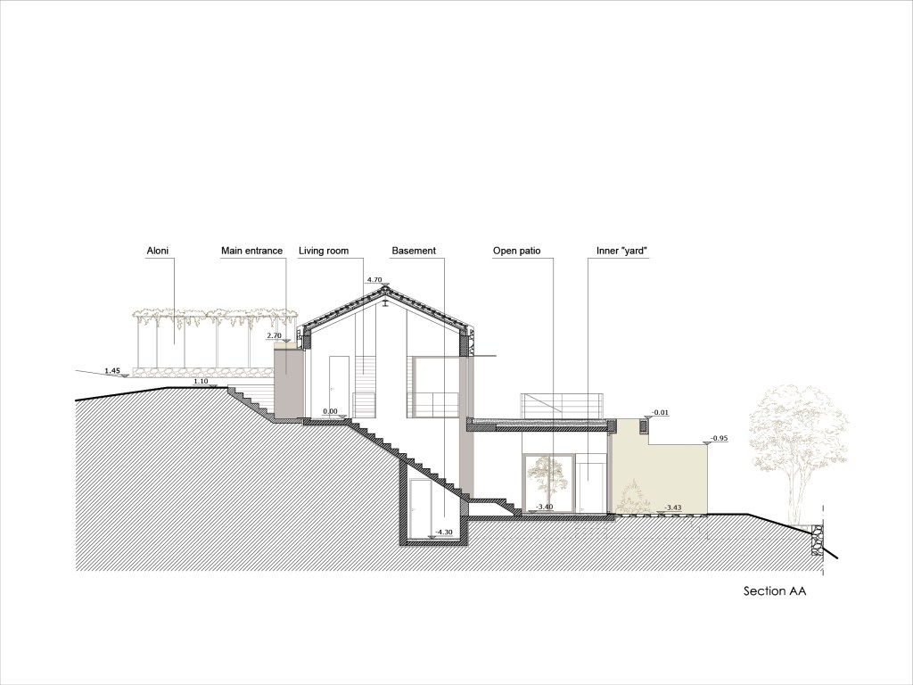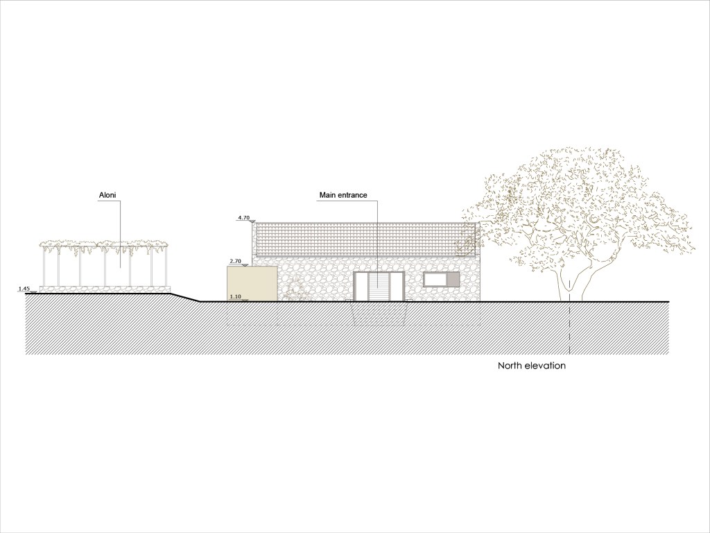 Inserted between an old oak tree on the West and an Aloni – low circular stone construction used for agriculture – protected by the Archaeological Institute on the East, the house opens towards the South while maintaining a more reserved and closed profile on the North and towards the new village.