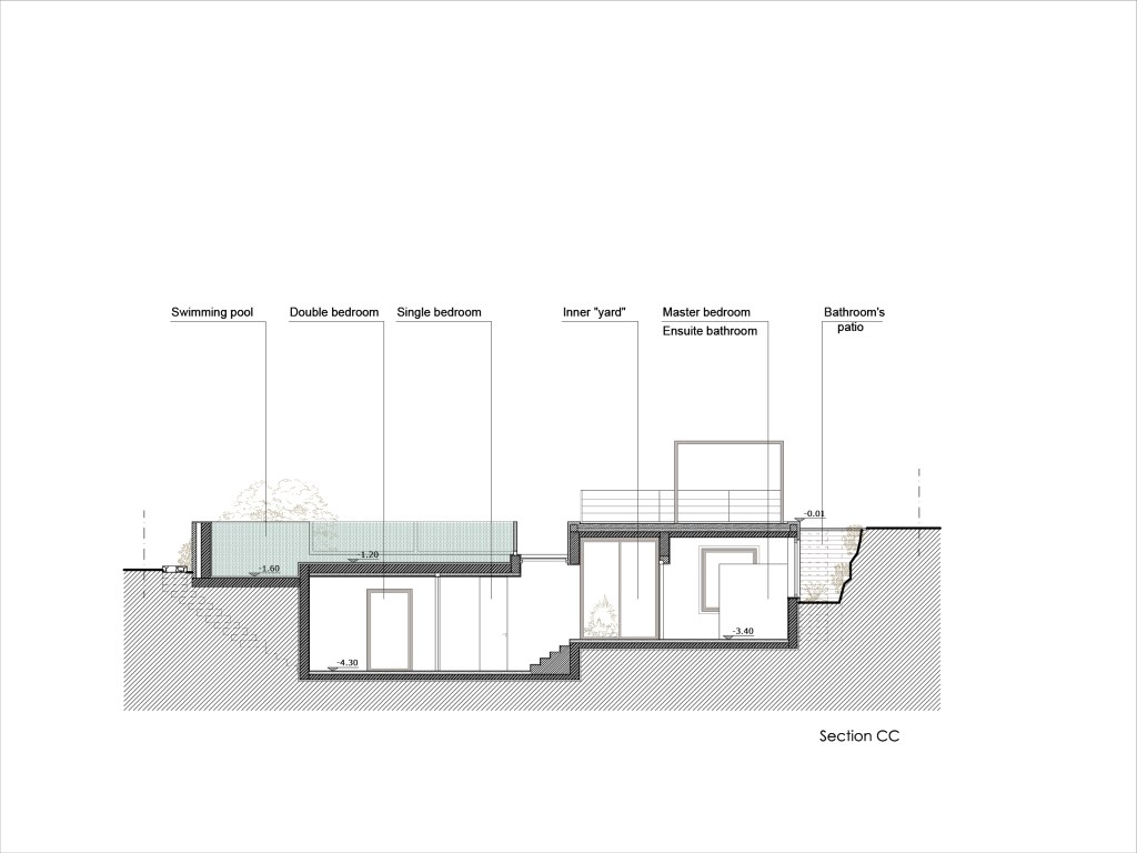 Thanks to a careful initial analysis and some targeted design choices, the home does not require air conditioning. The stair axis, in fact, acts as a natural ventilation chimney, especially useful for summer cooling, while the hill, in direct contact with the lower part of the house, favours a constant internal temperature. The masonry of the most exposed upper volume, thanks to its considerable thickness, has good thermal inertia, while the dimensions of the metal canopy calculated ad hoc favour a correct summer/winter solar radiation. Finally, also the swimming pool, located on part of the sleeping area, assists in the function of controlling and absorbing solar heat. Two solar panels, facing South and positioned on the ground, provide hot water throughout the year.