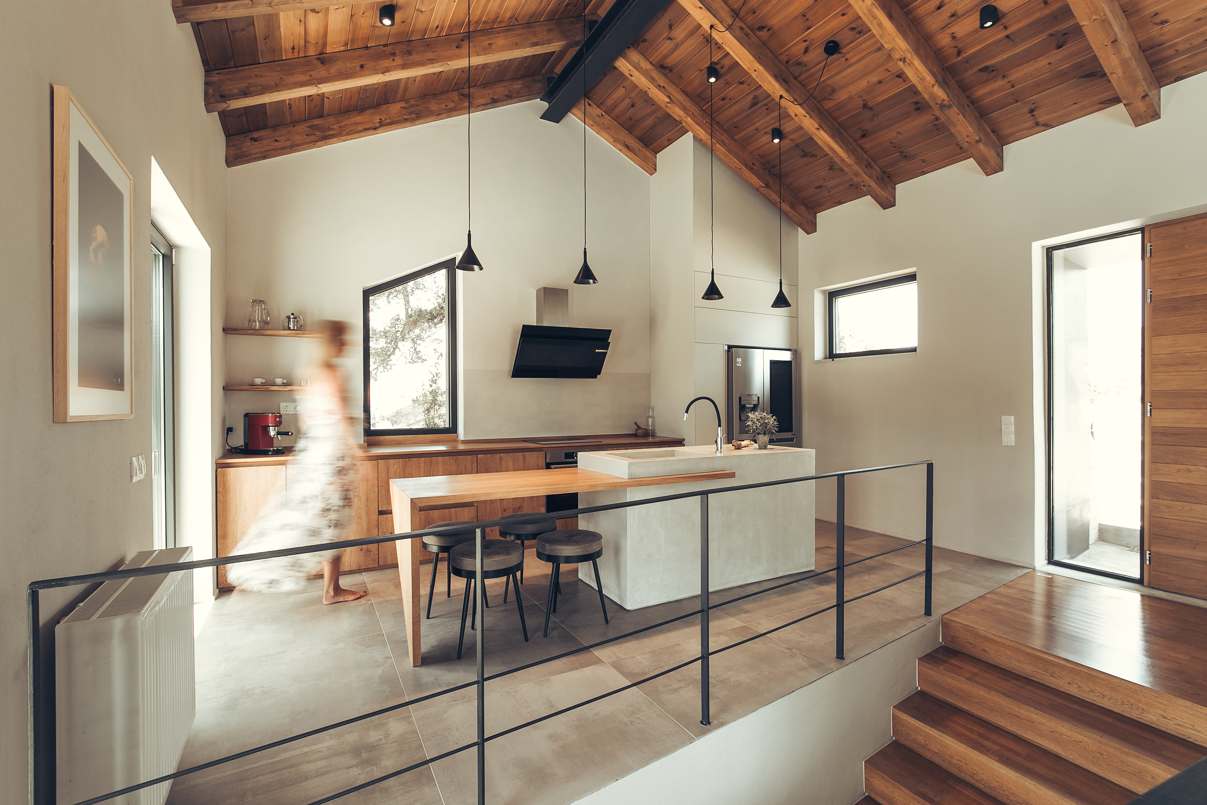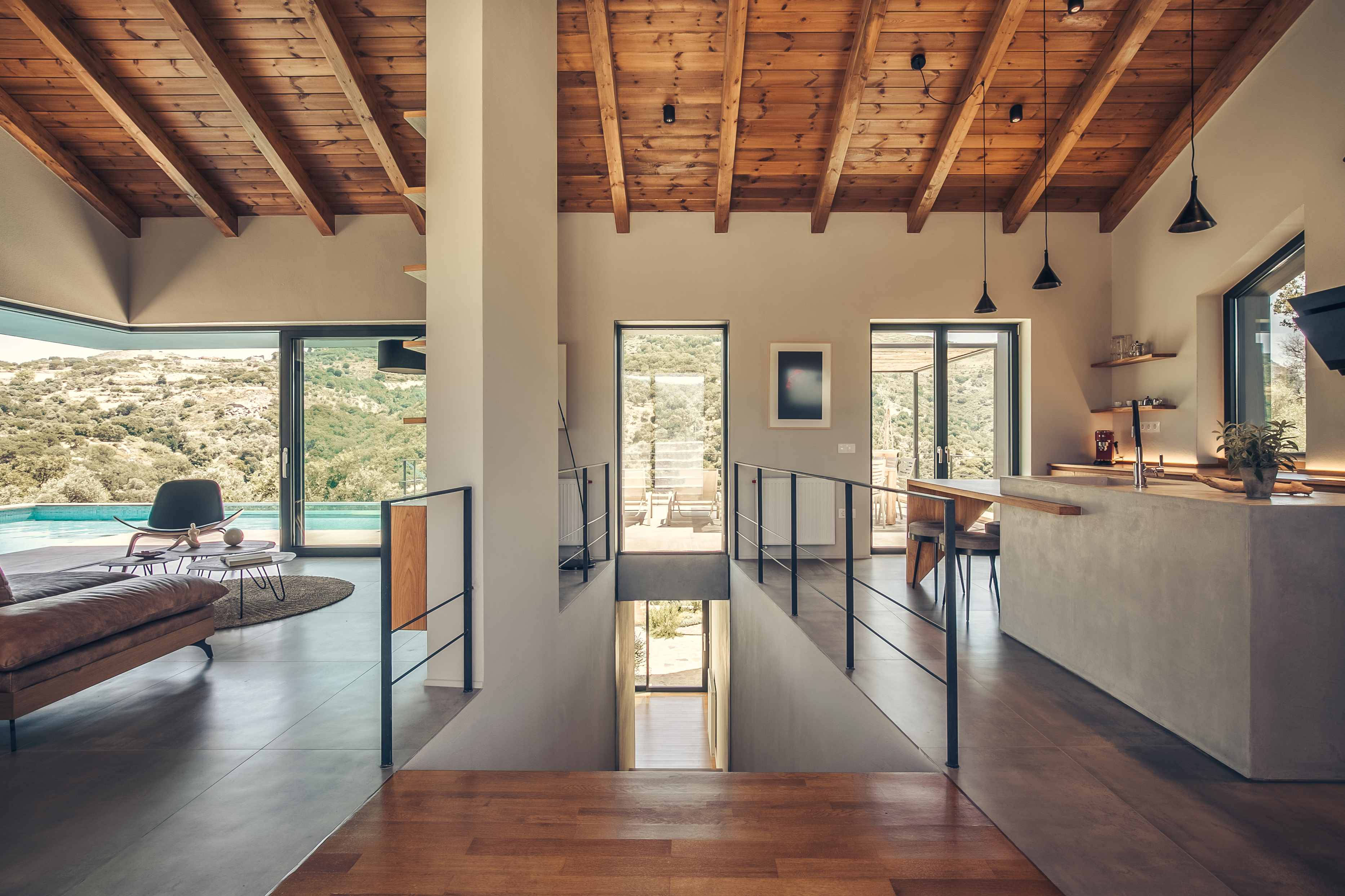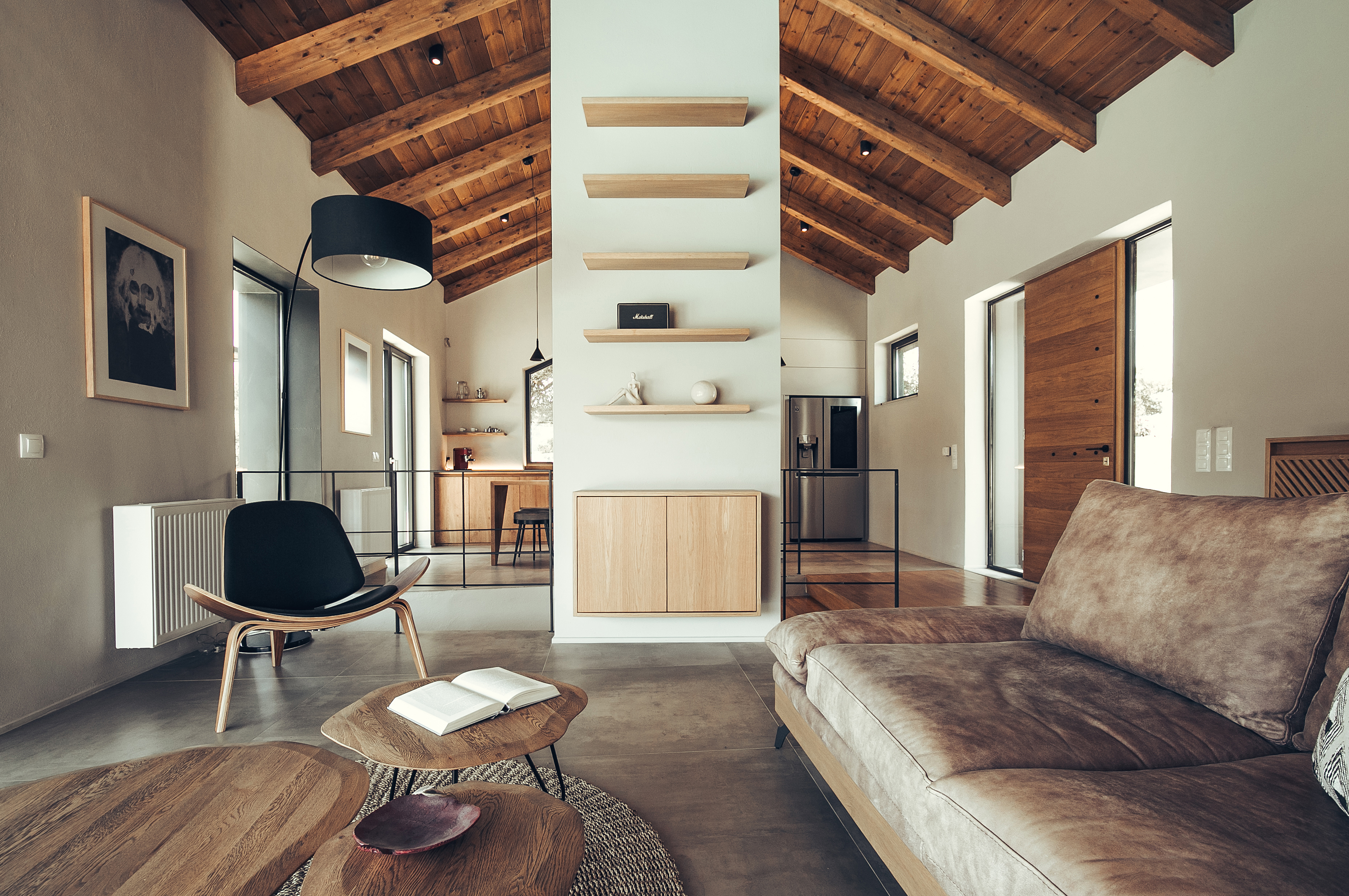 Οι βασικοί εσωτερικοί χώροι με κάποιες νότες παράδοσης, ωστόσο, δεν εγκαταλείπουν τις σύγχρονες ανέσεις, προτιμώντας το ξύλο βελανιδιάς και τις ζεστές αποχρώσεις του και φυσικά υλικά όπως γιούτα, λινό και βαμβακερές ίνες για υφάσματα.
