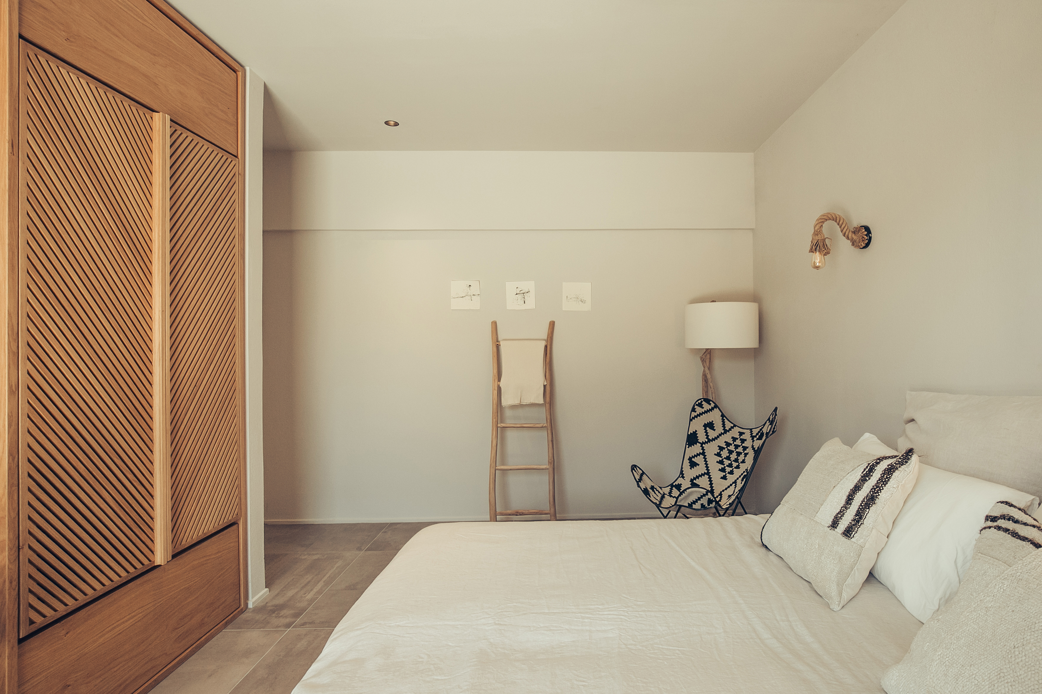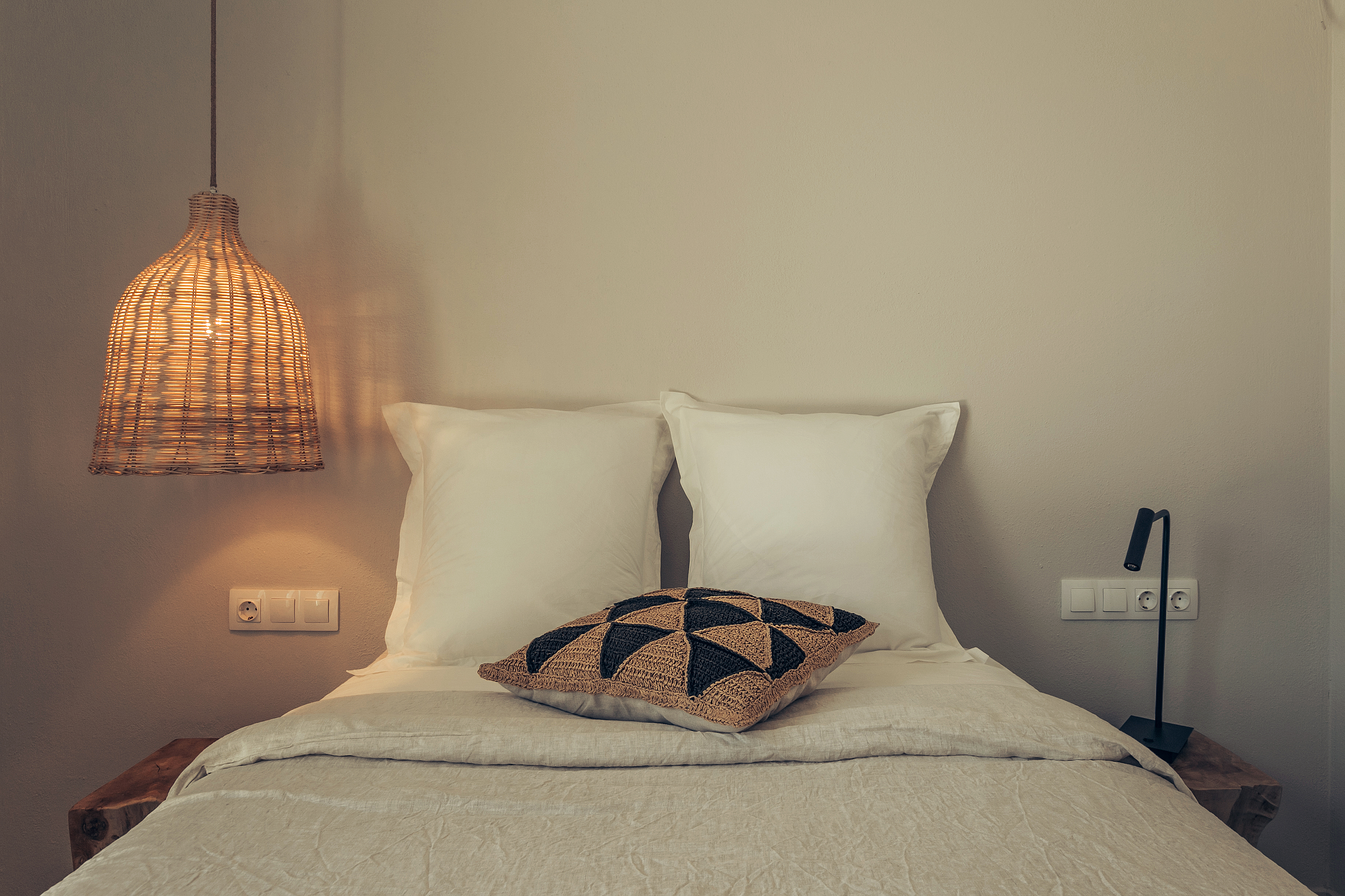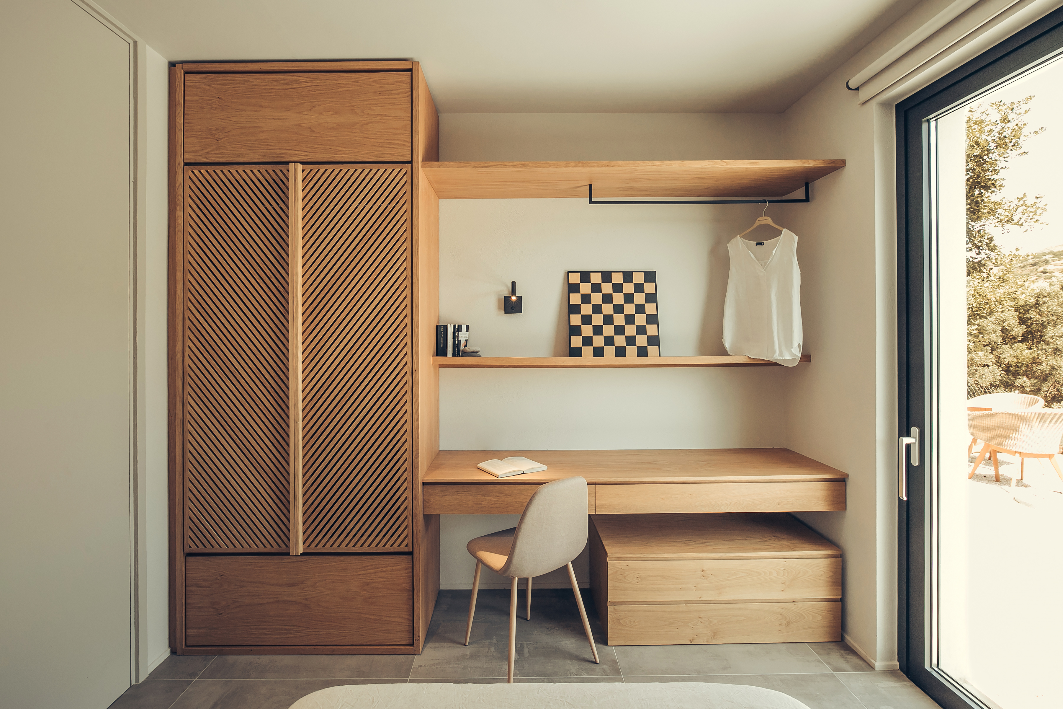 Οι βασικοί εσωτερικοί χώροι με κάποιες νότες παράδοσης, ωστόσο, δεν εγκαταλείπουν τις σύγχρονες ανέσεις, προτιμώντας το ξύλο βελανιδιάς και τις ζεστές αποχρώσεις του και φυσικά υλικά όπως γιούτα, λινό και βαμβακερές ίνες για υφάσματα.