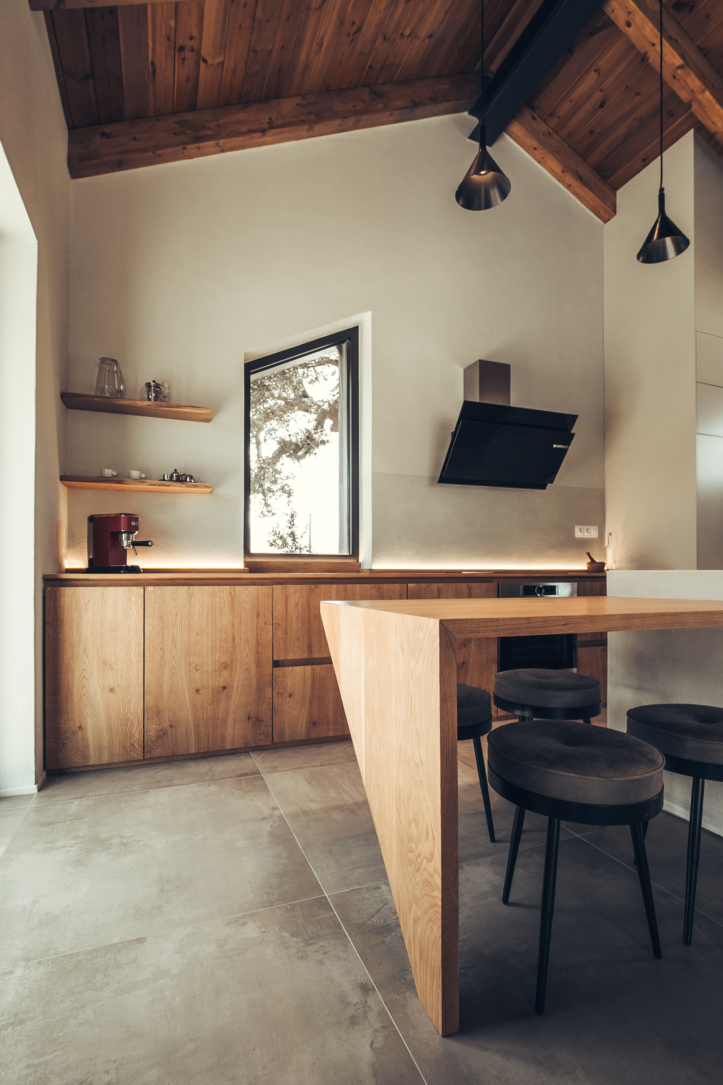 Gli interni essenziali con alcuni accenni alla tradizione, non rinunciano però ai confort moderni, prediligendo il legno di Rovere e le sue sfumature calde e materiali naturali come le fibre di juta, lino e cotone per i tessuti.