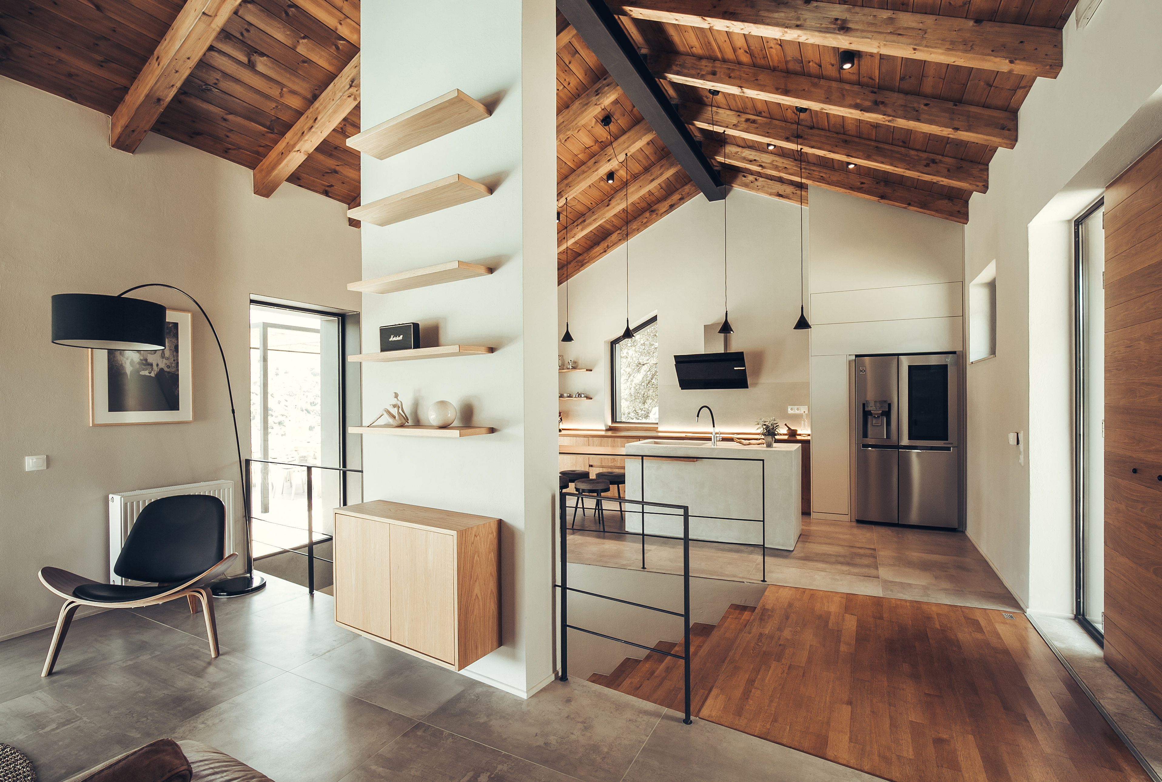 Η αυλή και η επιβλητική σκάλα γίνονται ο άξονας διανομής ολόκληρου του έργου γύρω από τον οποίο περιστρέφονται οι τρεις νέοι όγκοι του σπιτιού: μια σαφής αναφορά στα τυπικά σπίτια στις πλαγιές του.