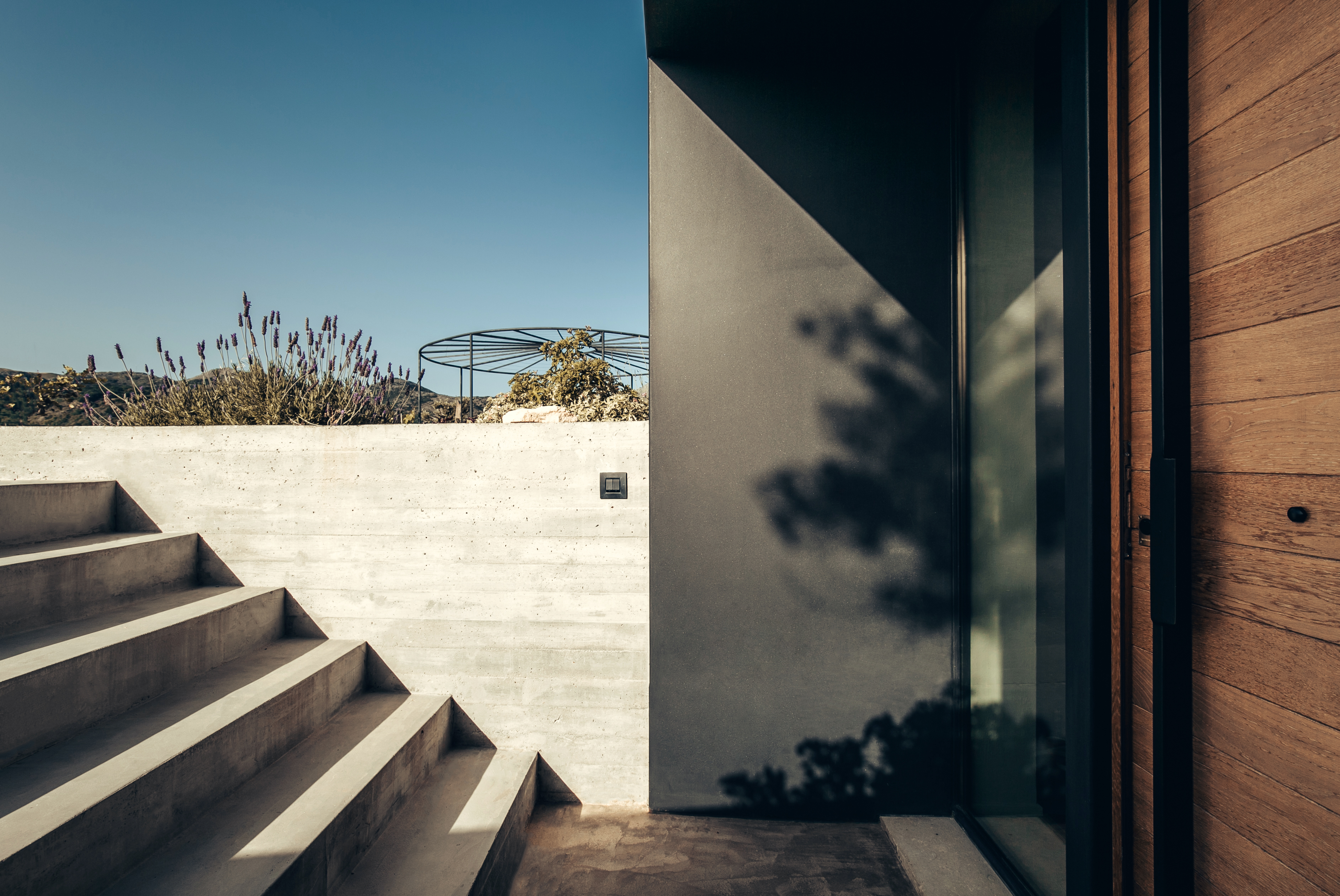 The avlì – courtyard and the imposing staircase become the fulcrum and distribution axis of the entire project around which the three new volumes of the house revolve: a clear reference to the typical now uninhabited houses on its slopes.