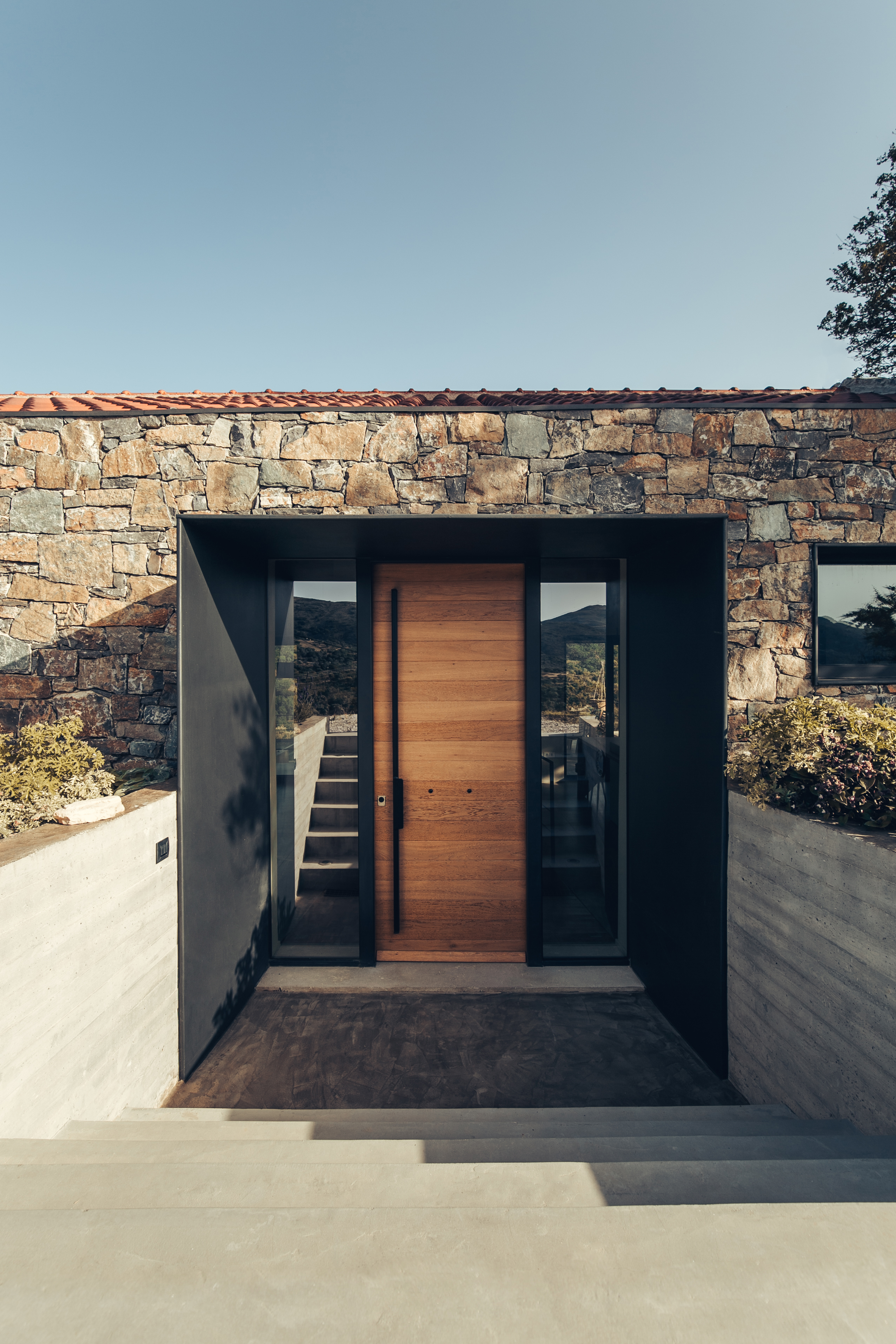 Inserita tra una quercia secolare a Ovest e un Aloni – bassa costruzione circolare in pietra usata per l’agricoltura – protetto dall’Istituto archeologico ad Est, la casa si apre verso Sud, mantenendo invece un profilo più riservato e chiuso in direzione Nord e del nuovo villaggio.