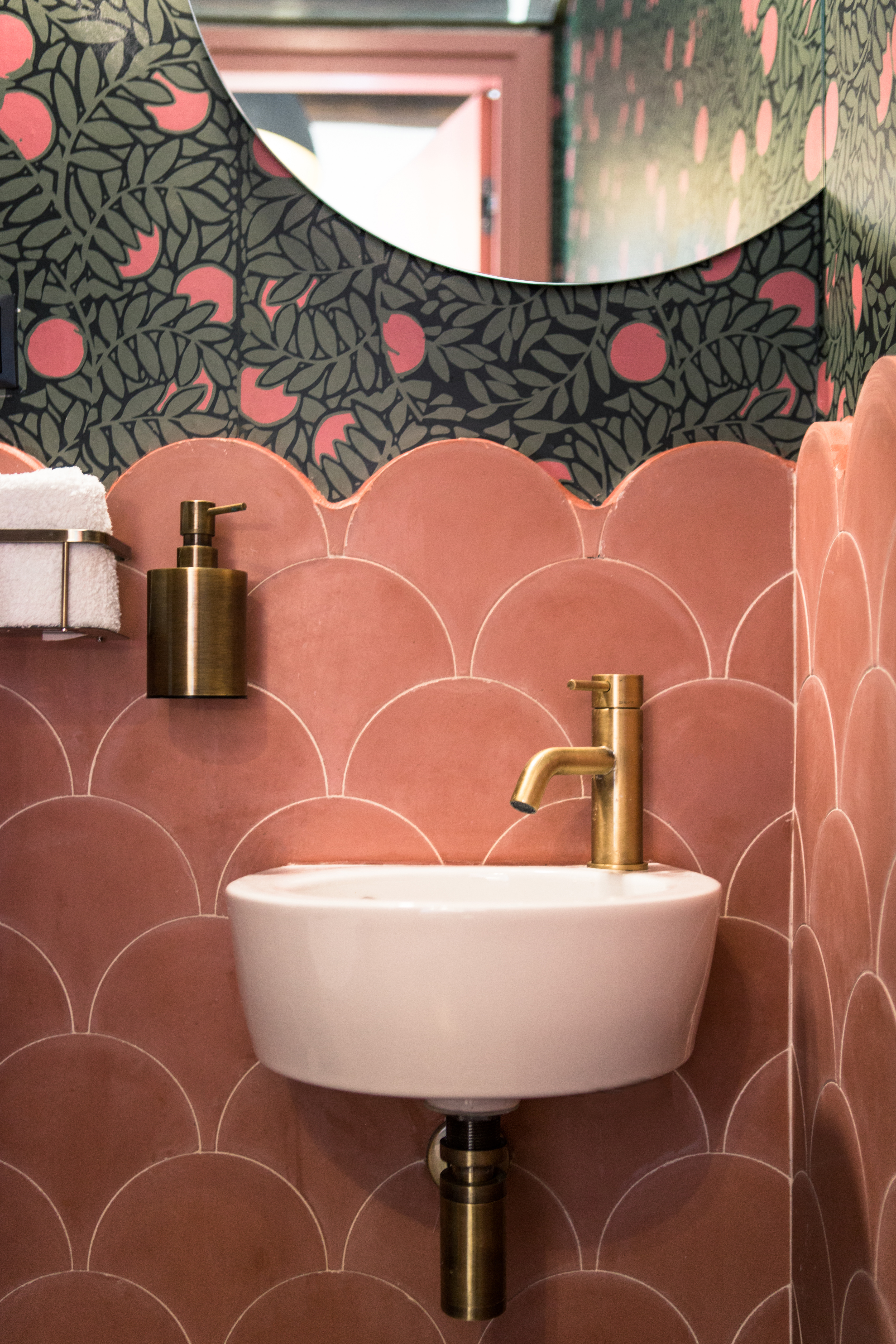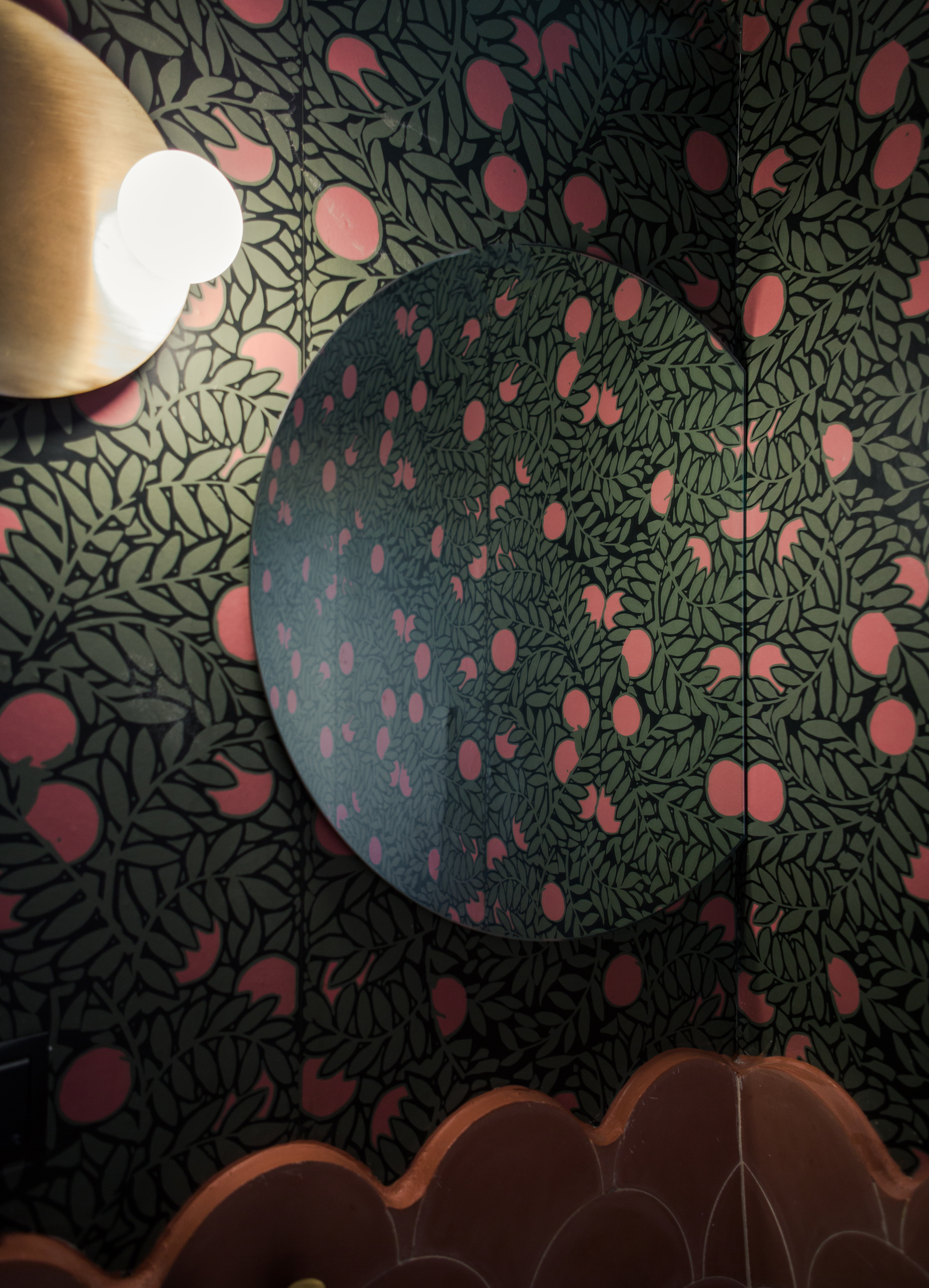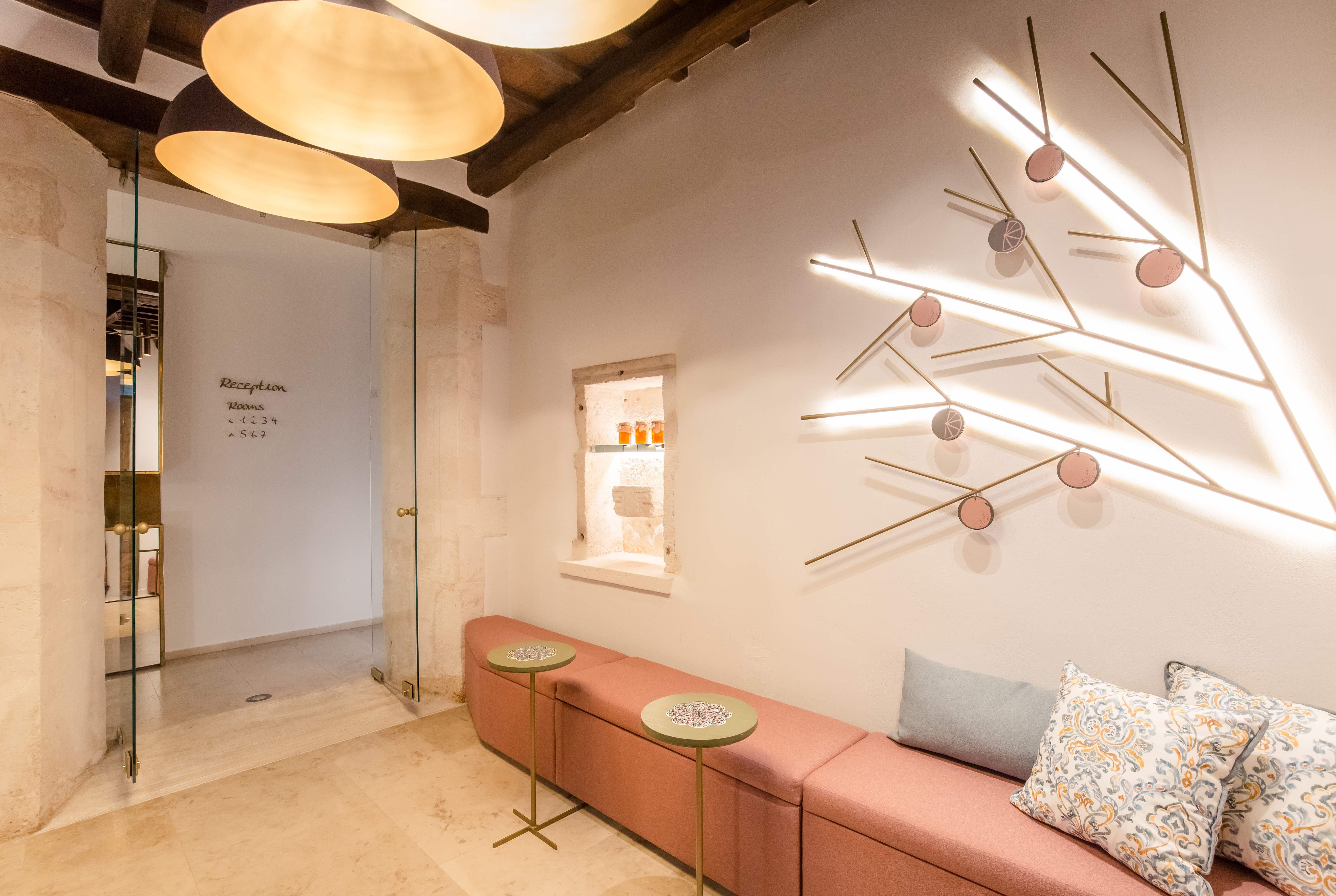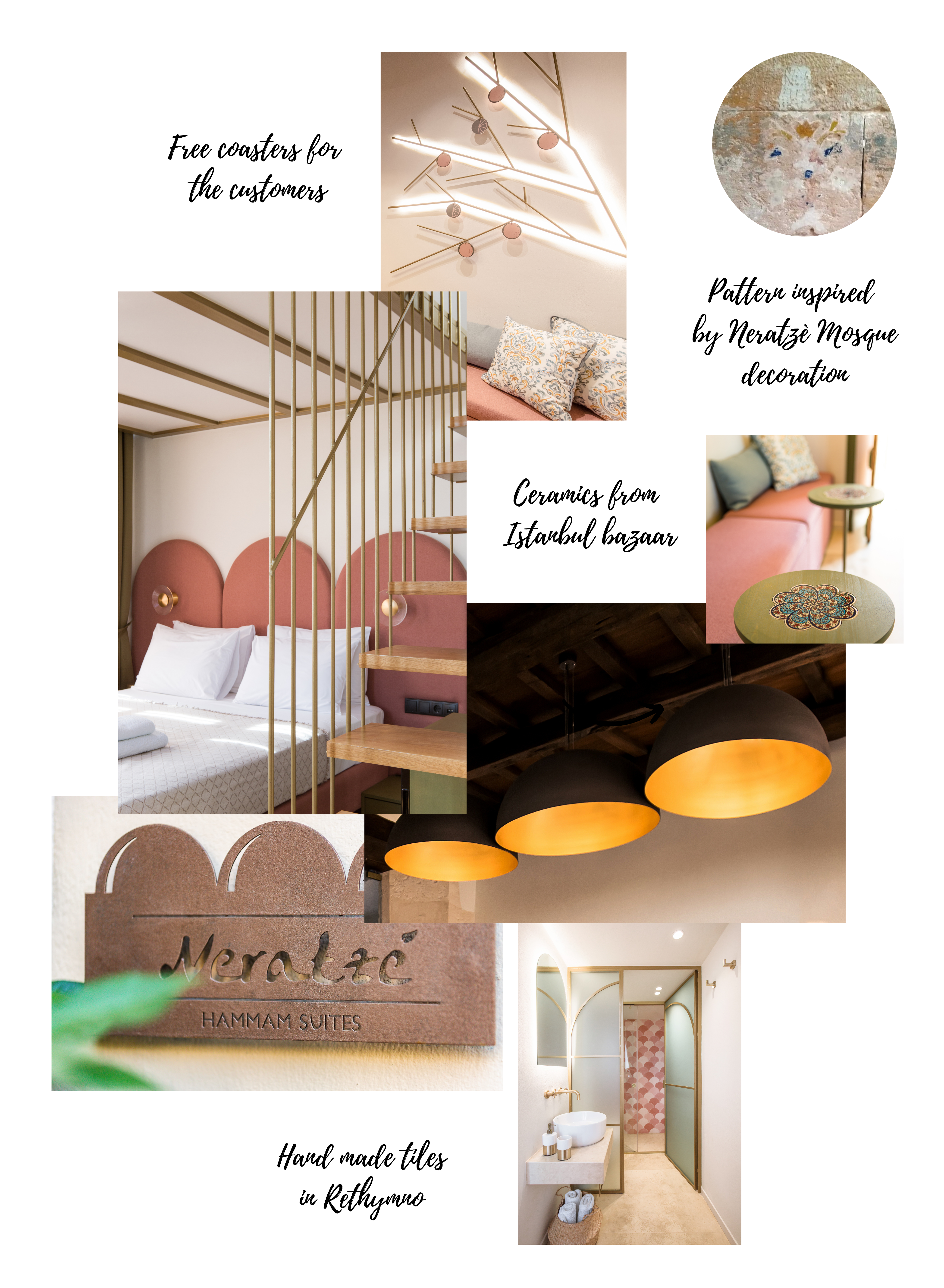 Il logo che sintetizza gli elementi simbolo del progetto, le tre cupole del vicino tempio musulmano, tipiche anche degli Hammam e la foglia stilizzata di un Neratzè, creando un connubio tra architettura e natura, diventa l’elemento caratterizzante dell’interior design di questo nuovo intervento. Lo ritroviamo nelle tre maxi lampade ripetute della reception, nelle testiere dei letti e nel pattern delle piastrelle che rivestono le pareti dei bagni. Pur non tralasciando cenni a motivi decorativi ed elementi di richiamo orientale che caratterizzavano le 4 suites già realizzate.
