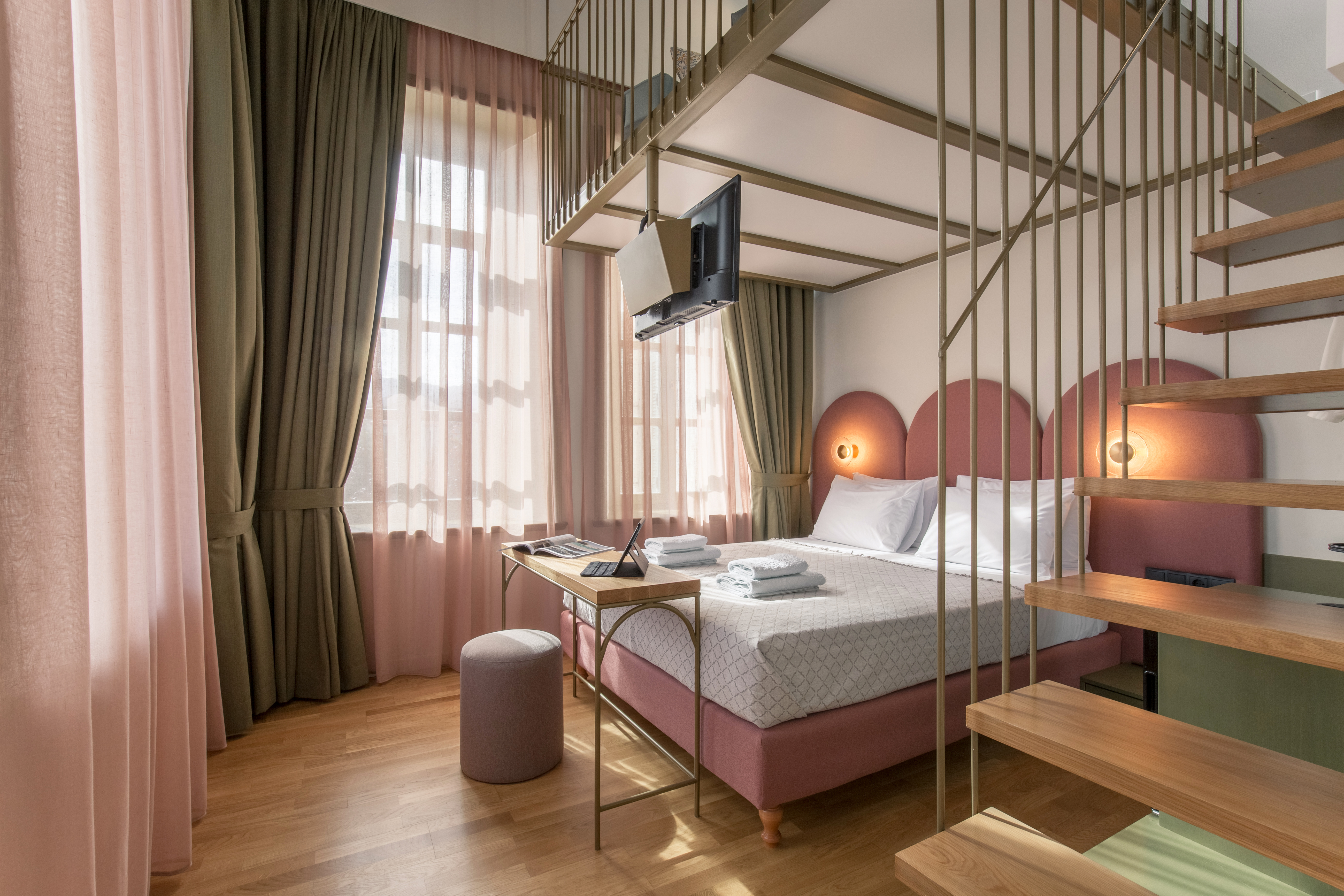 Two with an internal mezzanine, one of which also has an external terrace with a Jacuzzi. The colours, lines and decorations take up the founding elements of the project.