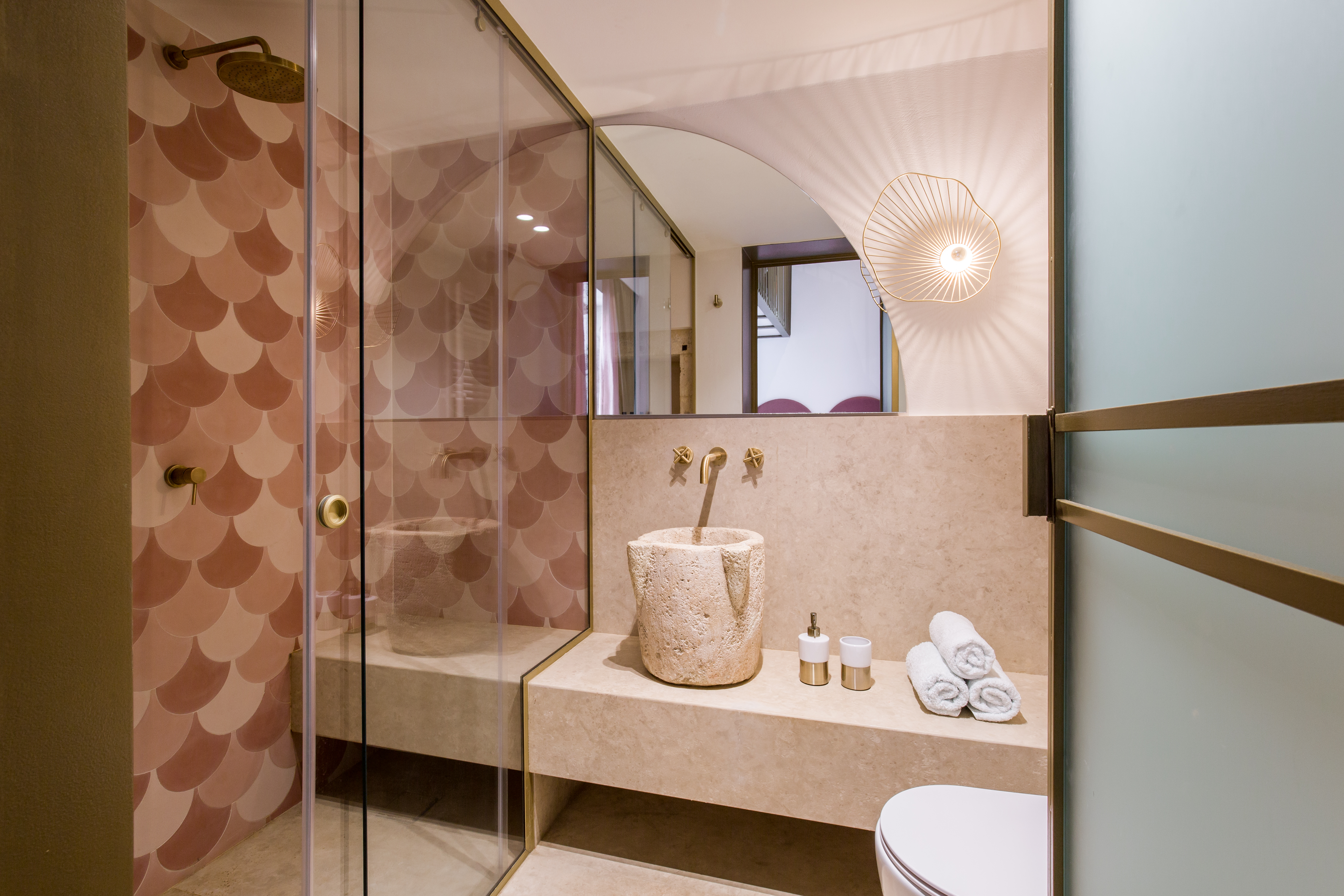 The logo that summarizes the symbolic elements of the project, the three domes of the nearby Muslim temple, also typical of the Hammam and the stylized leaf of a Neratzè, creating a union between architecture and nature, becomes the characterizing element of the interior design of this new intervention. We find it in the three repeated maxi lamps in the reception, in the headboards of the beds and in the pattern of the tiles that cover the walls of the bathrooms. While not neglecting hints of decorative motifs and elements of oriental appeal that characterized the 4 suites already built.