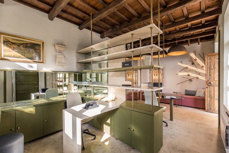 The reception looks like a welcoming lounge, at the intersection of the square and the street, at the confluence of the 2 entrances. The spaces are fluid, defined by broken lines, diaphragms and reflections: shelving is delimiting the reception area from the back office, but it is certainly the “mirror box” that hides the small toilet that further characterizes the space, immersing users in a garden of Neratzè!