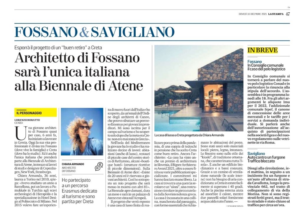 - La Stampa – Architetto di Fossanno sarà l’unica italiana alla Biennale di Atene